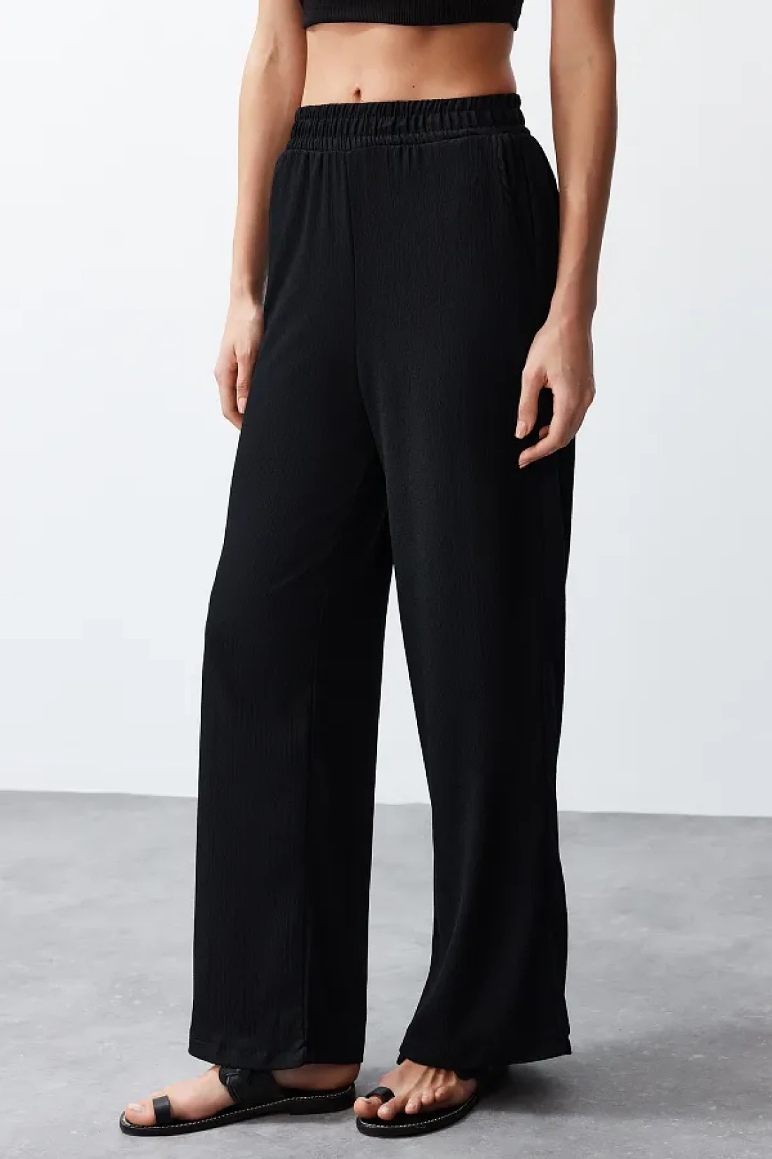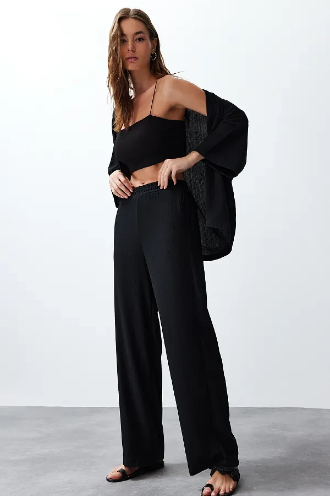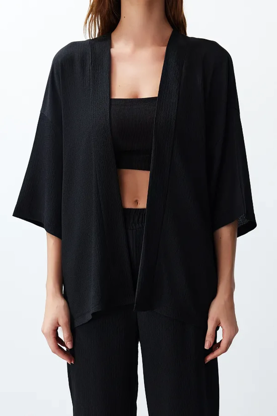 Collection طقم كيمونا وبنطلون أسود محبوك مريح - TWOSS24AU00091