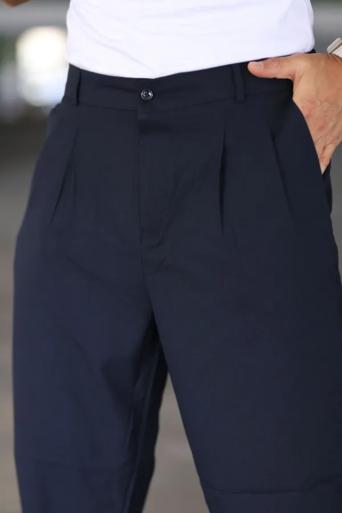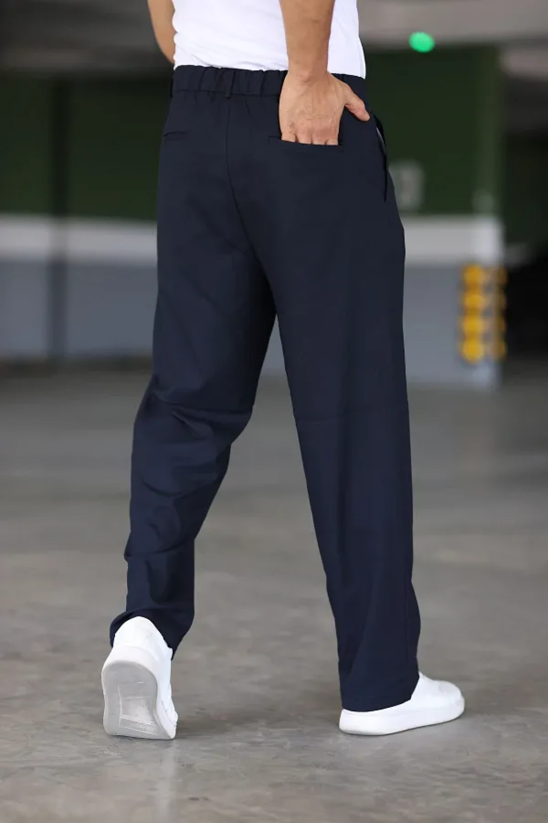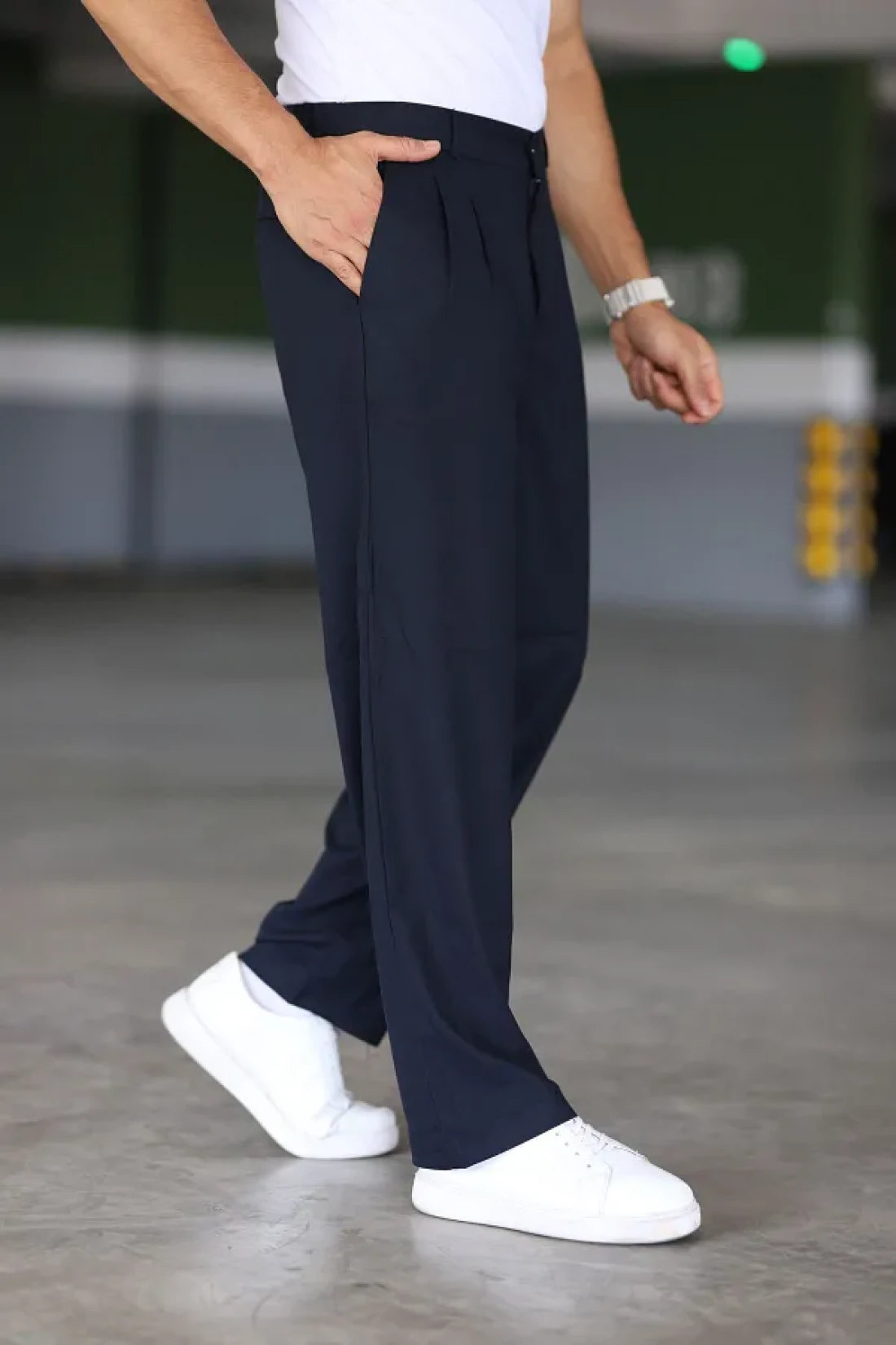 Bürke بنطال فضفاض باللون الأزرق الداكن - طيات مزدوجة، خصر مطاطي، مقاس مريح، ساق واسعة
