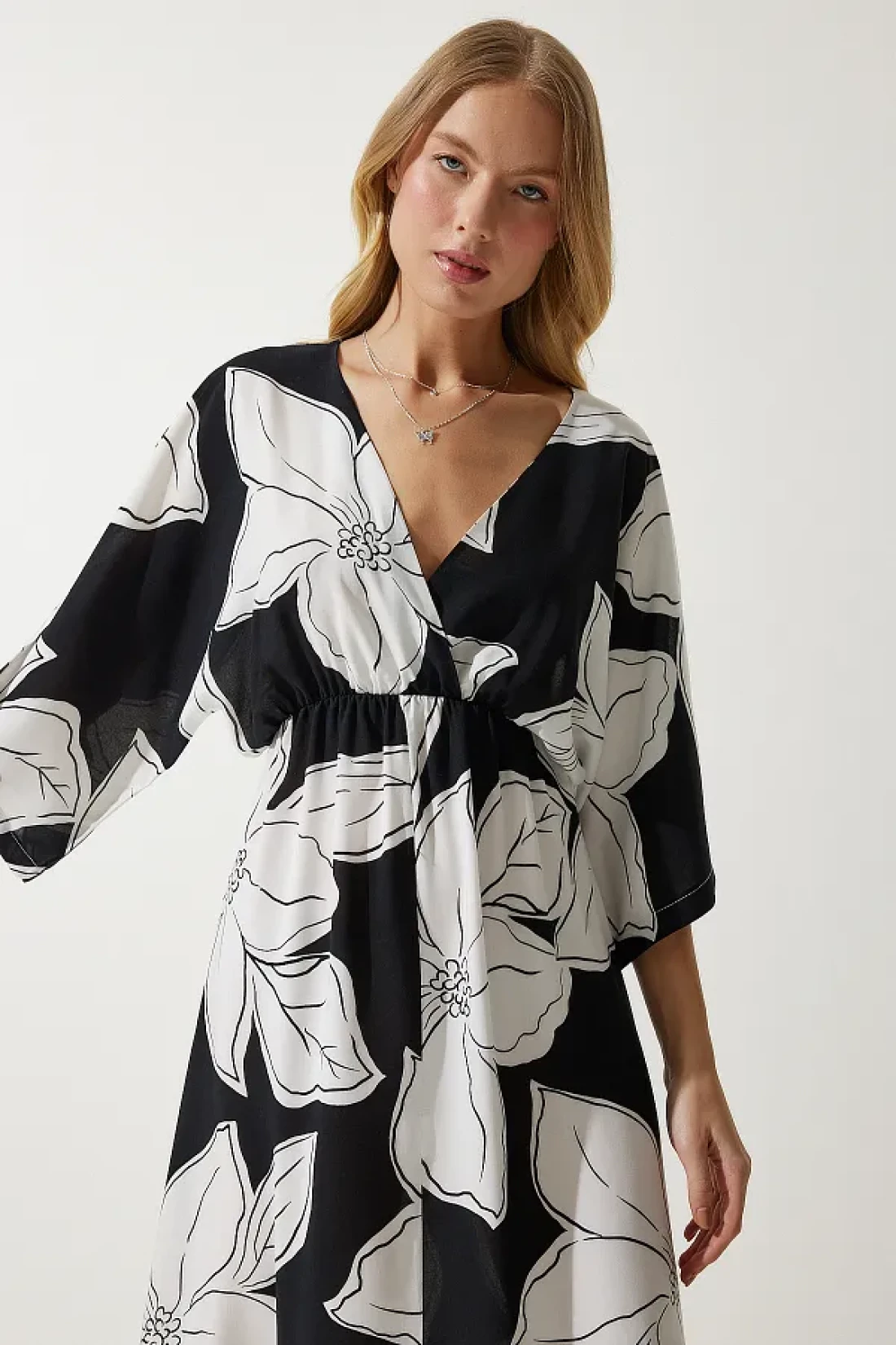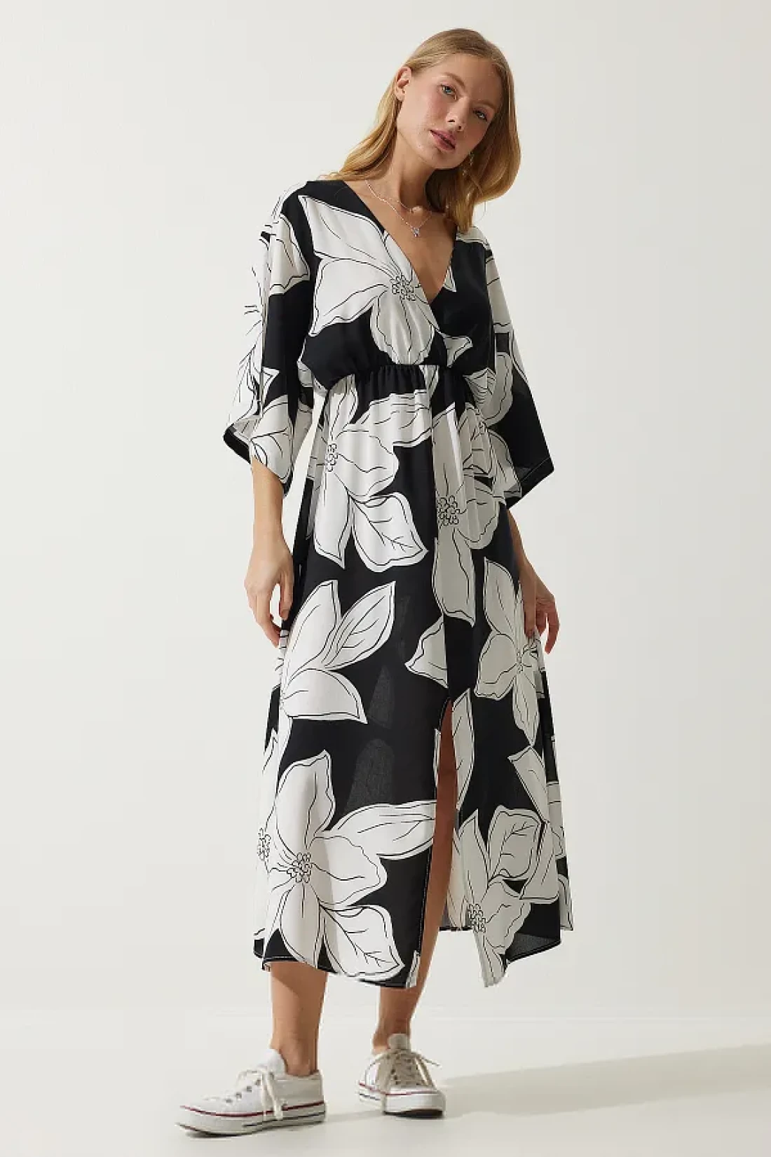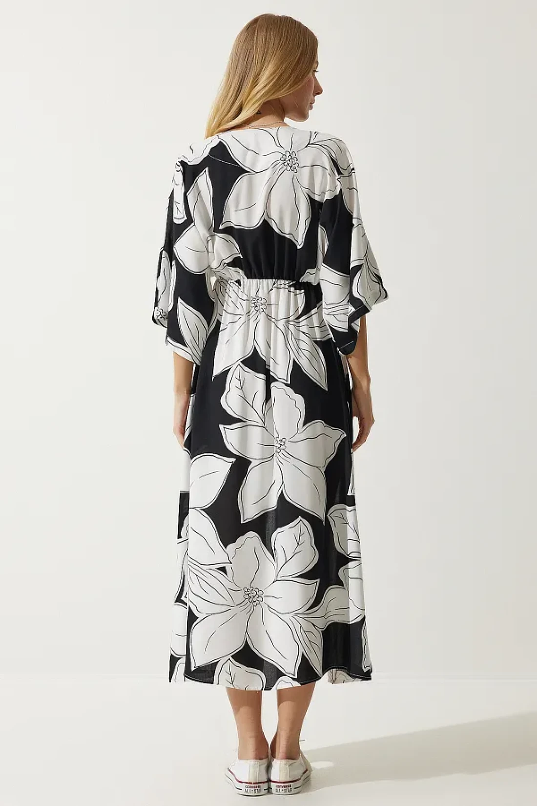 Happiness İstanbul فستان فيسكوز صيفي منقوش بياقة ملفوفة باللونين الأبيض والأسود DK00166