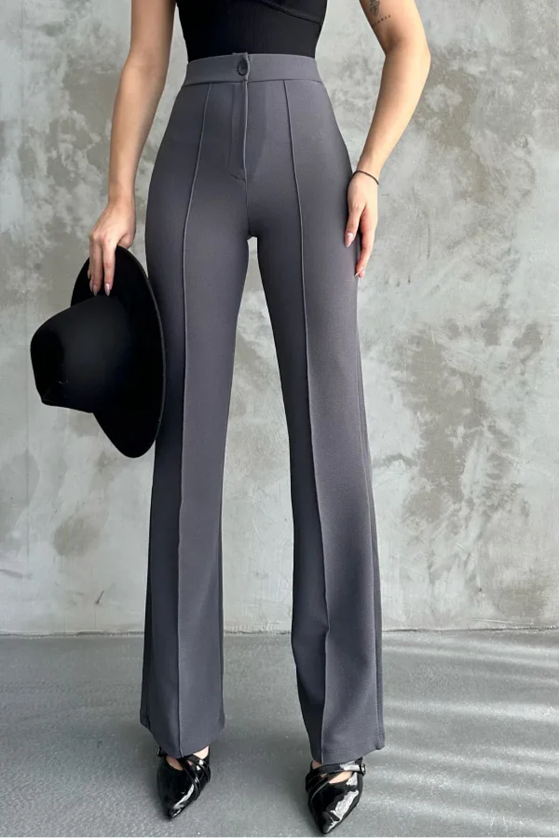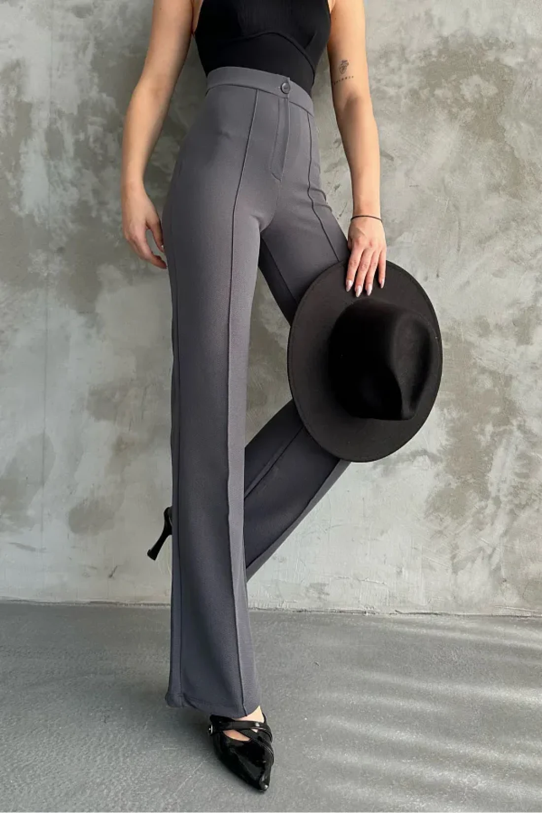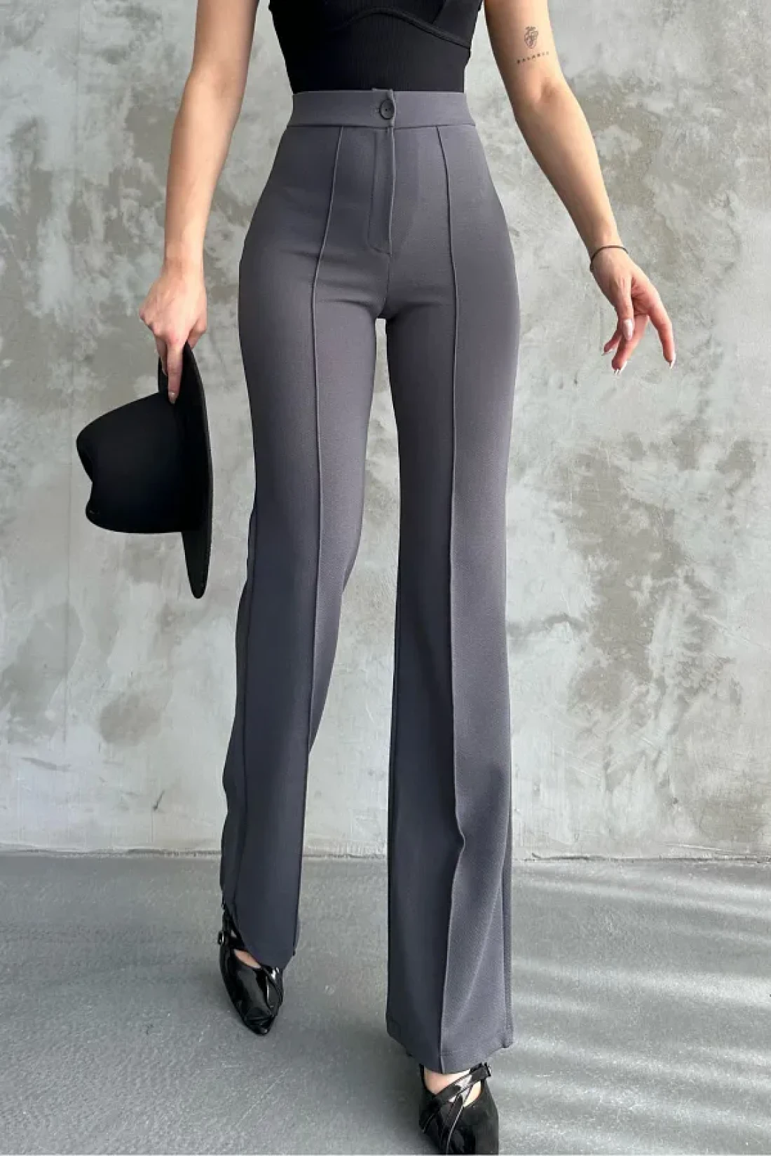 macharel jeans بنطال بالازو نسائي عالي الخصر من أنثراسايت