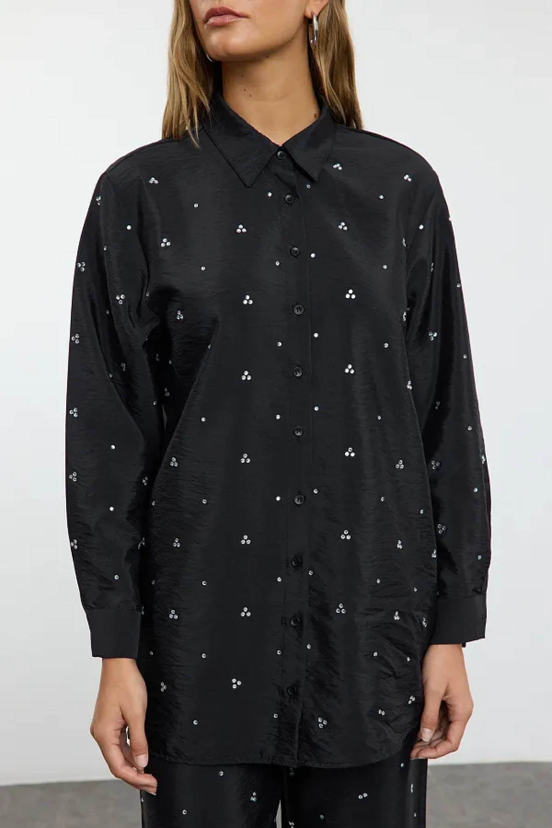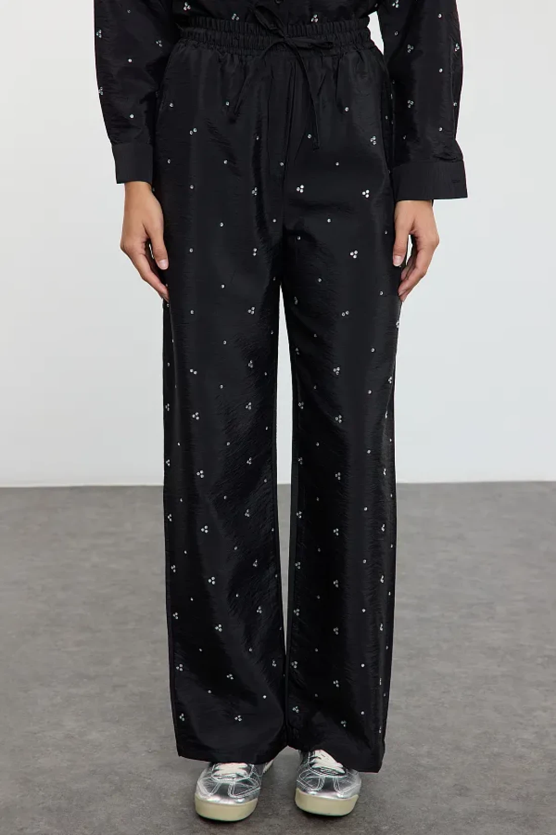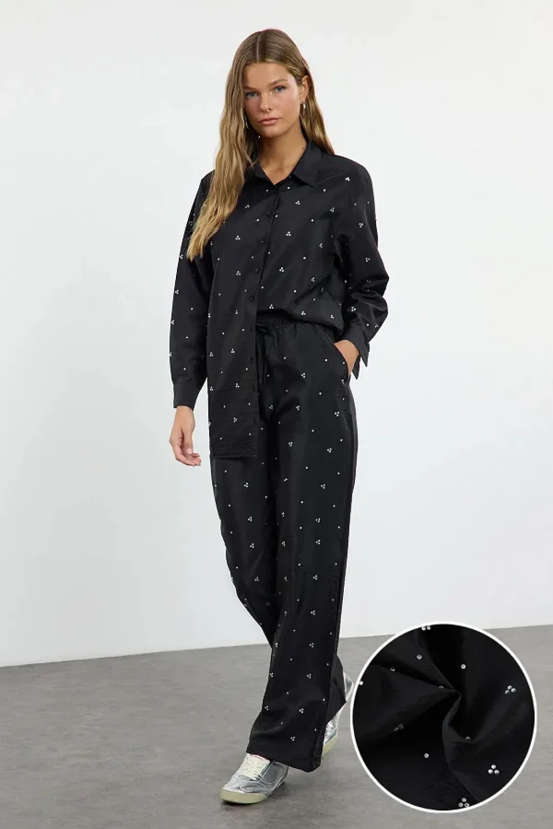 Modest بدلة صيفية من القماش المنفوش باللون الأسود اللامع مع تفاصيل حجرية قابلة للتعديل من الأسفل إلى الأعلى TCTAW25US00106