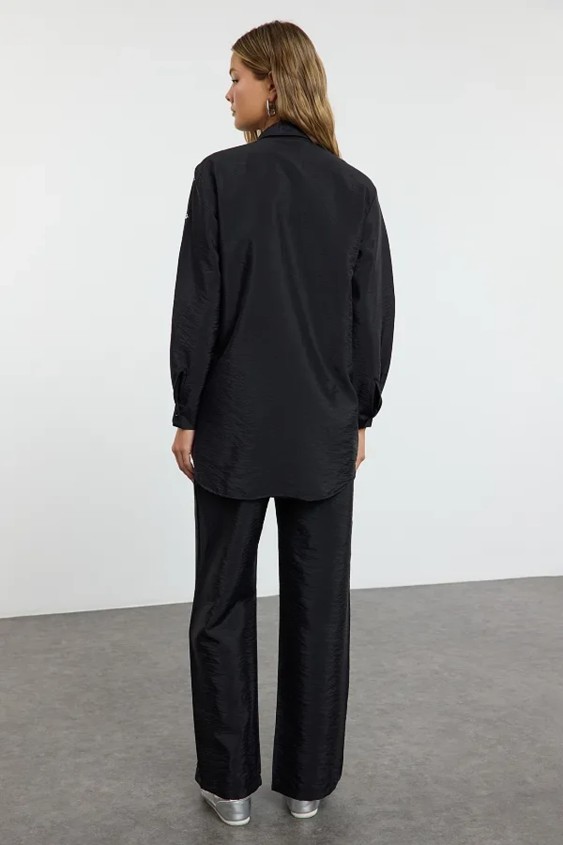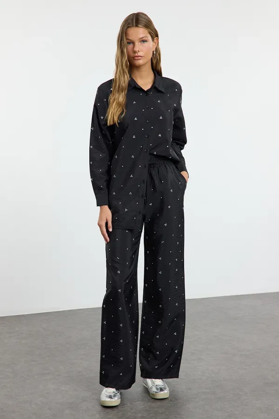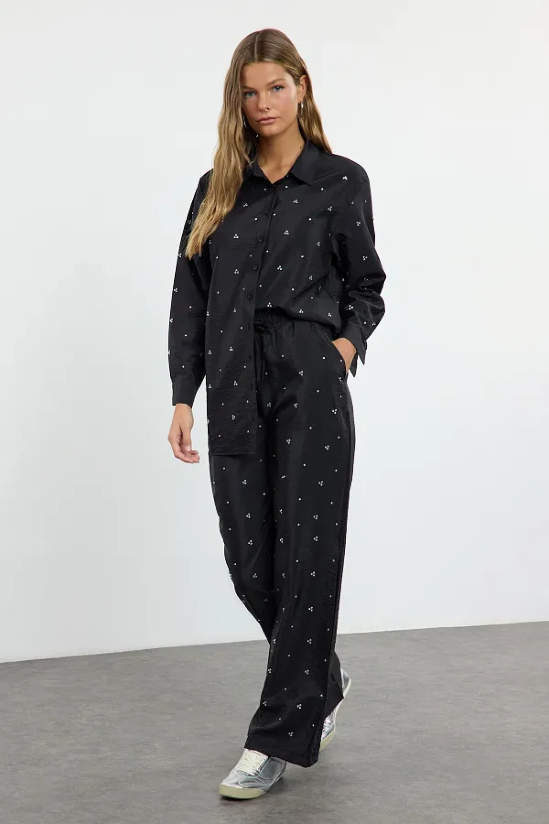 Modest بدلة صيفية من القماش المنفوش باللون الأسود اللامع مع تفاصيل حجرية قابلة للتعديل من الأسفل إلى الأعلى TCTAW25US00106