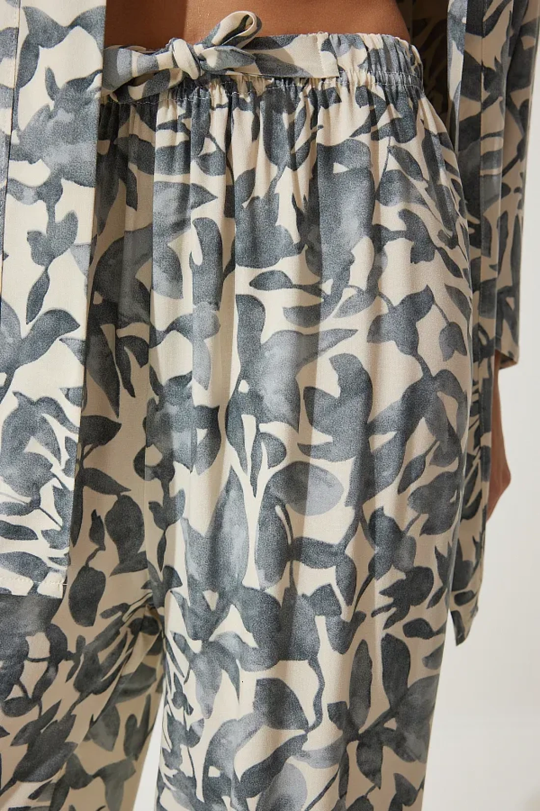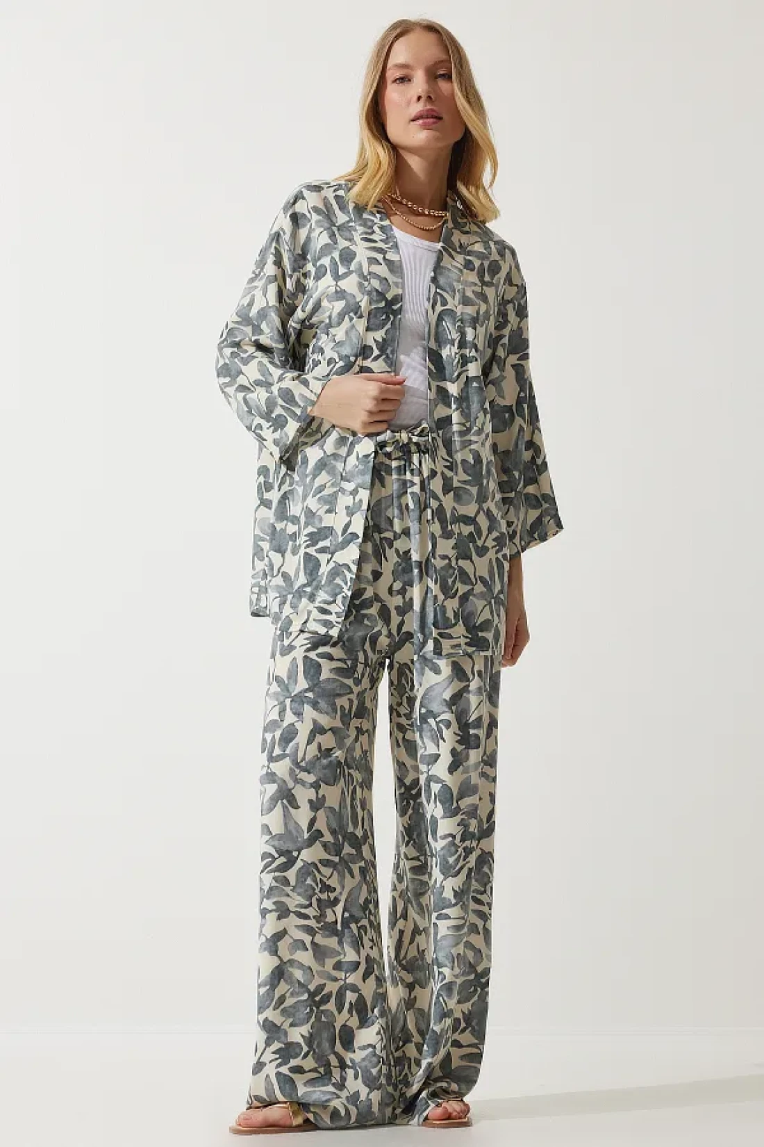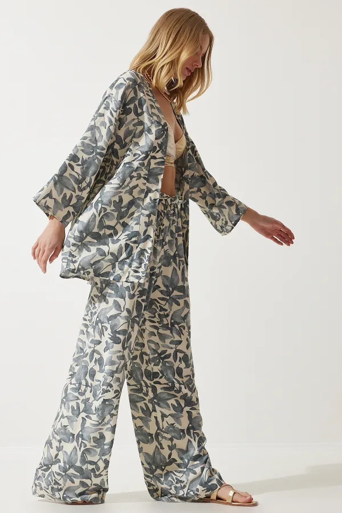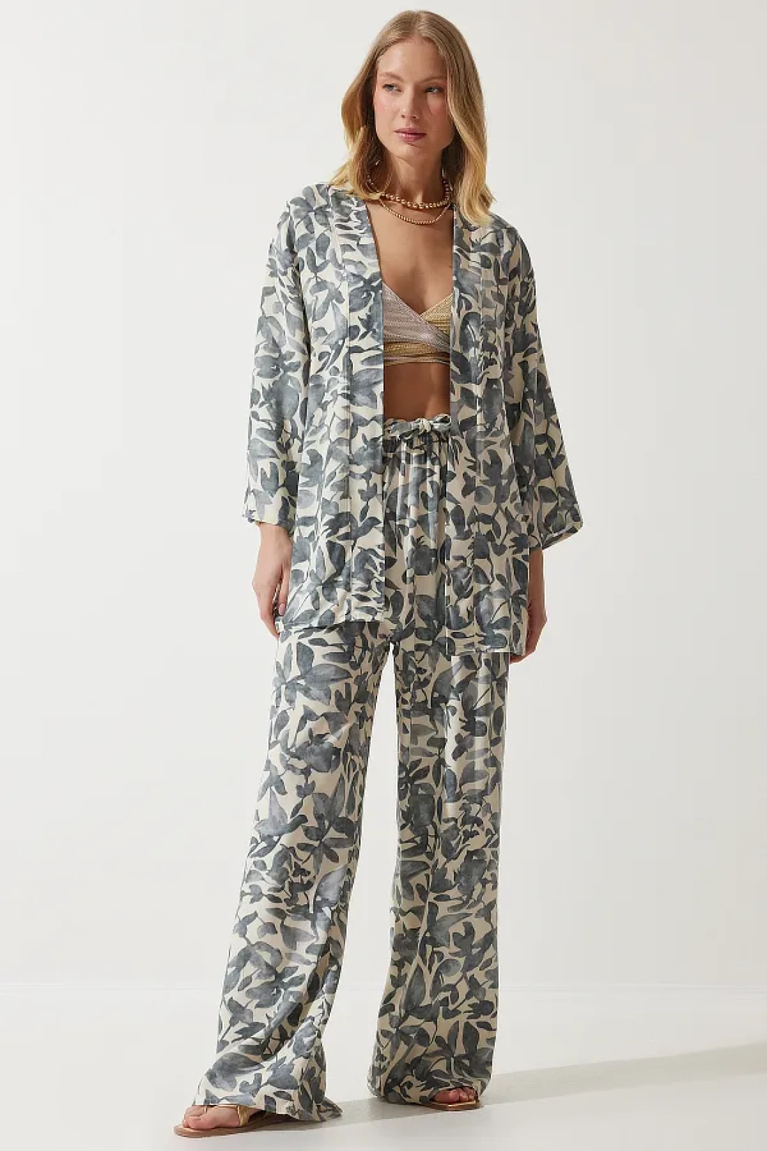 Happiness İstanbul بدلة بنطلون كيمونو بالازو بنمط رمادي على شكل عظمة للنساء EN00614