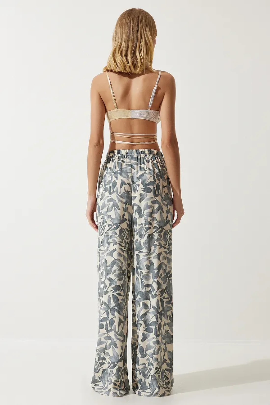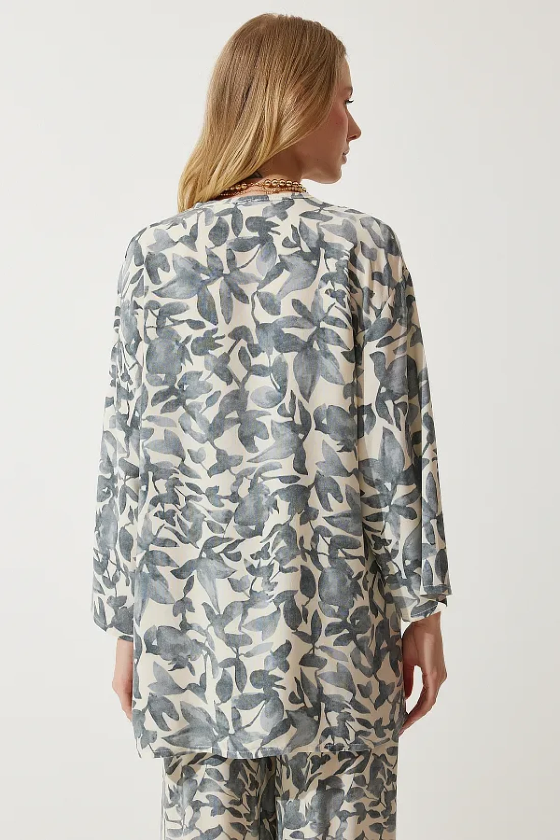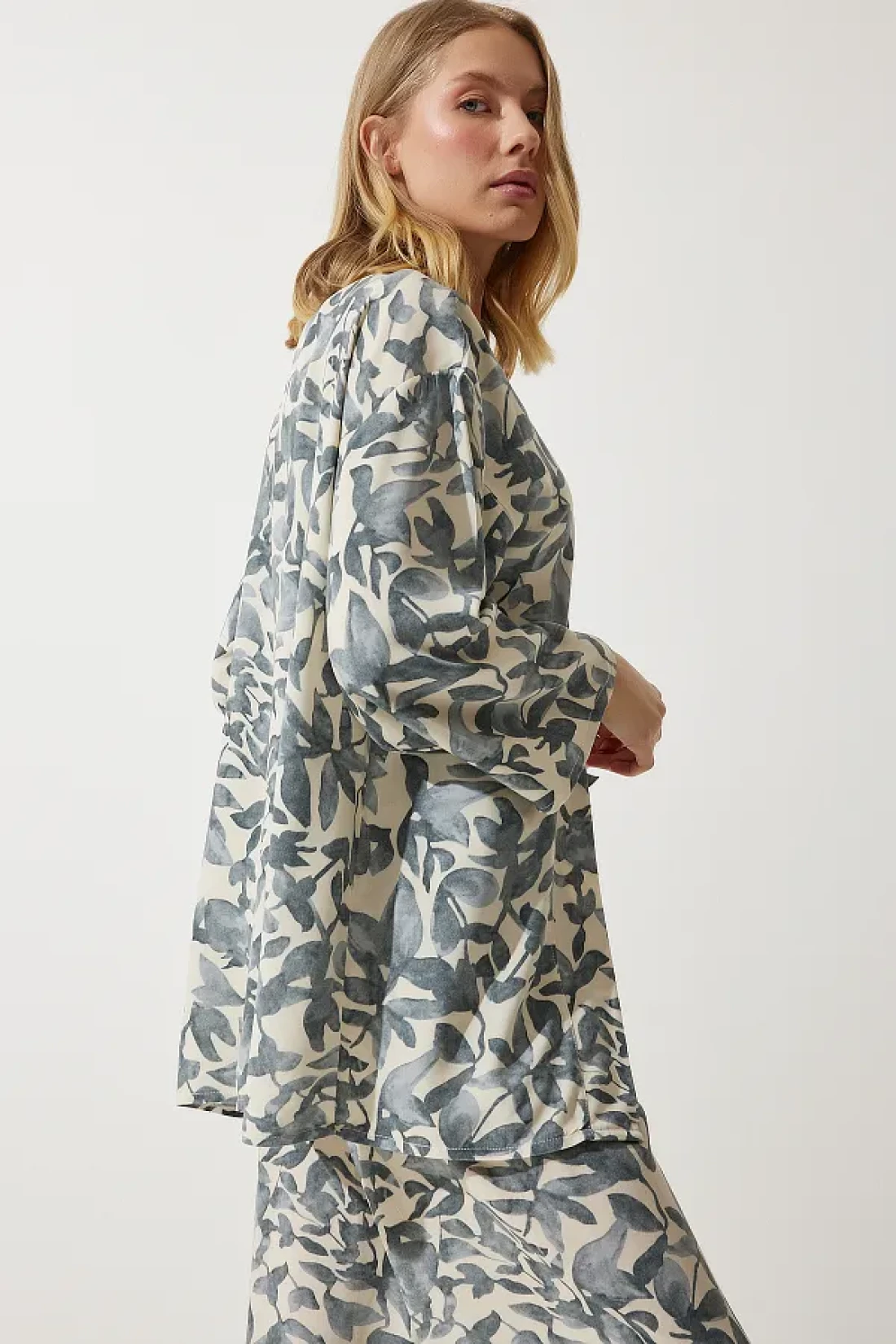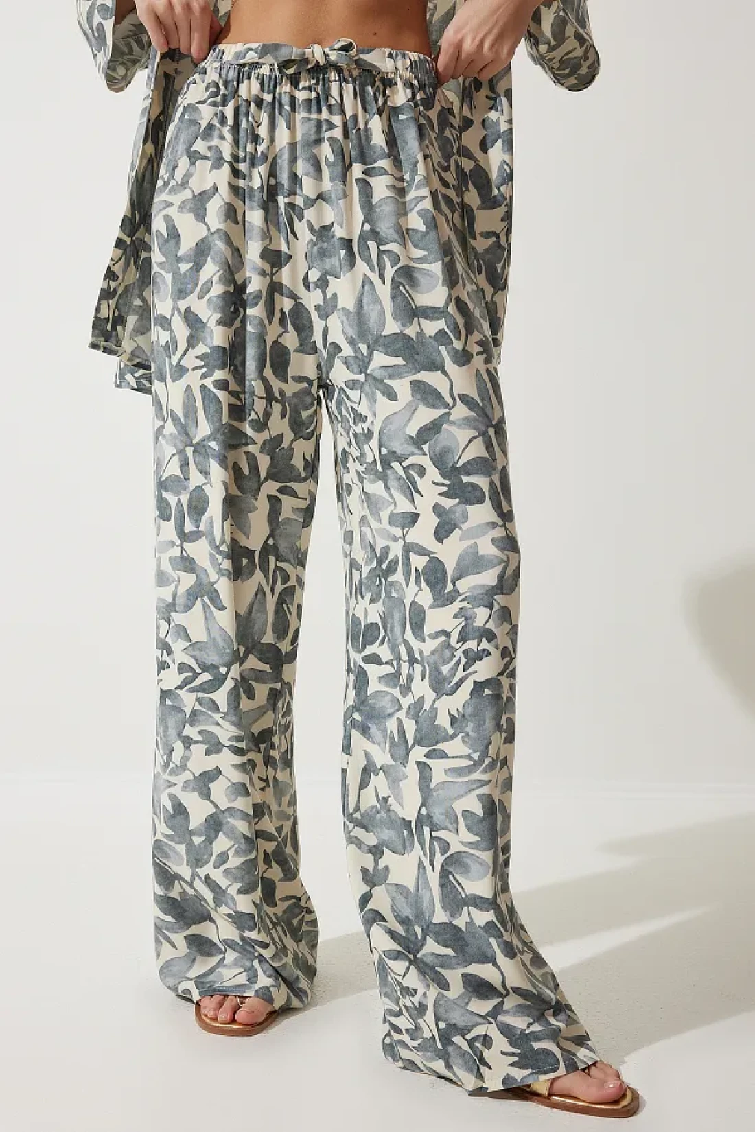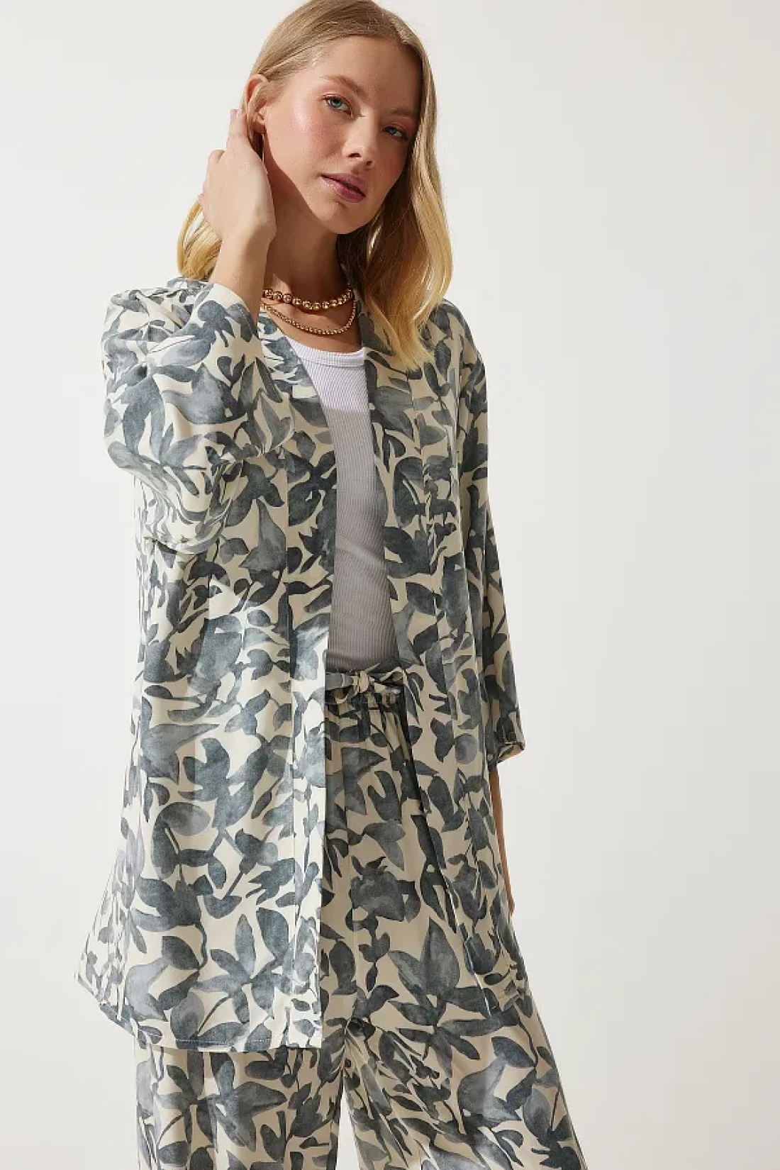 Happiness İstanbul بدلة بنطلون كيمونو بالازو بنمط رمادي على شكل عظمة للنساء EN00614