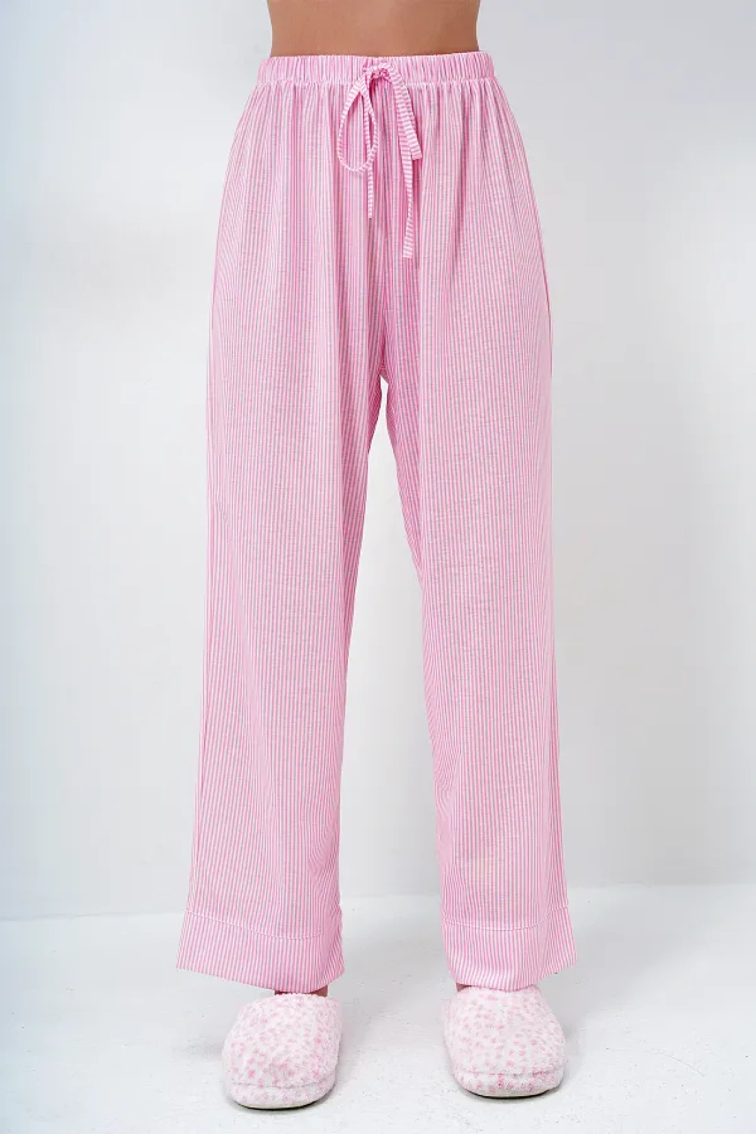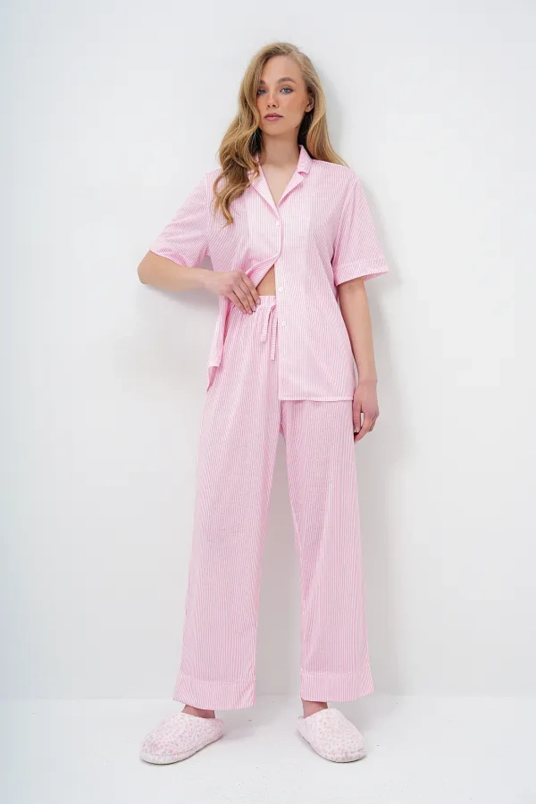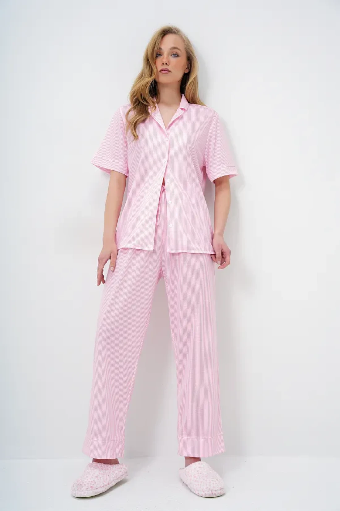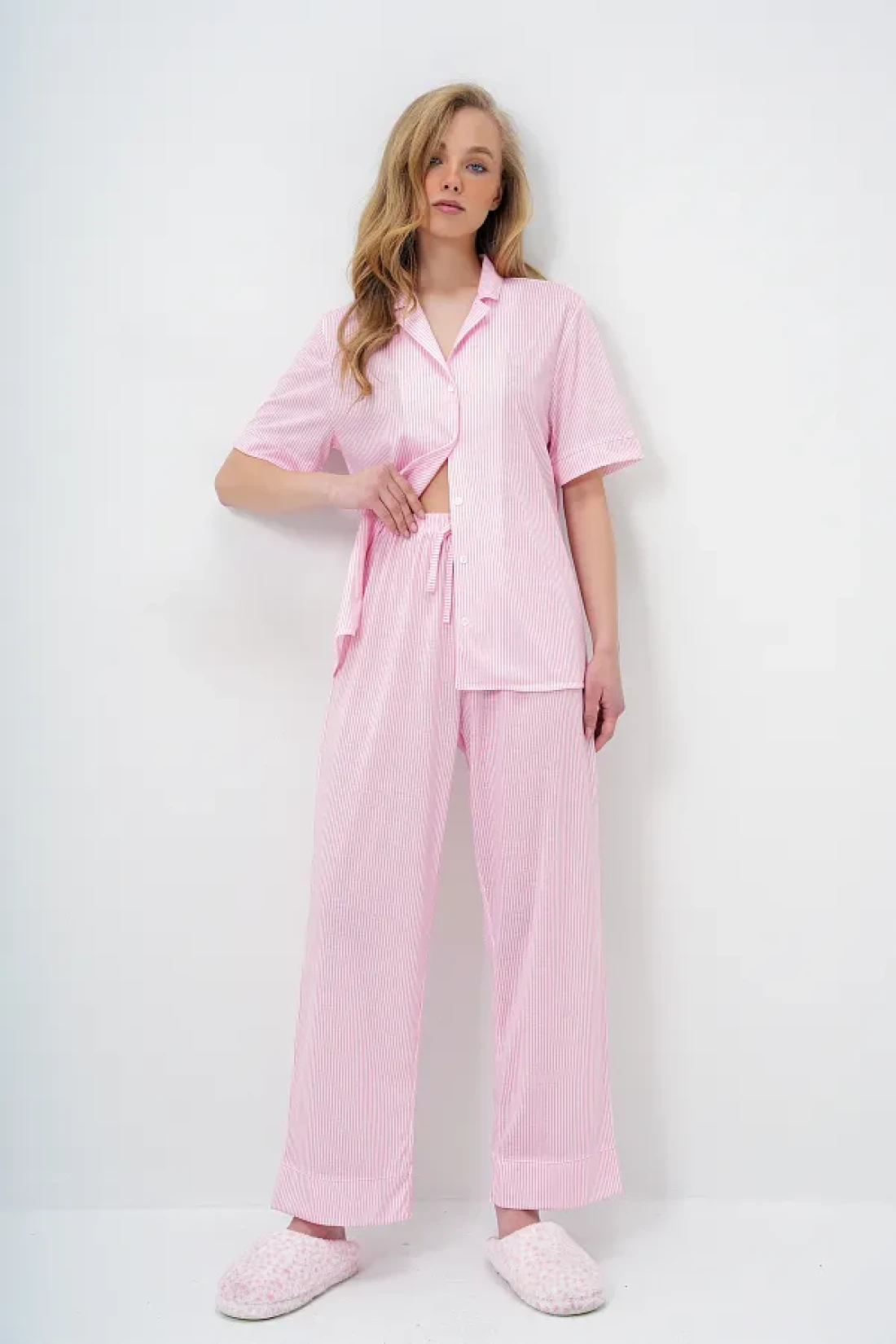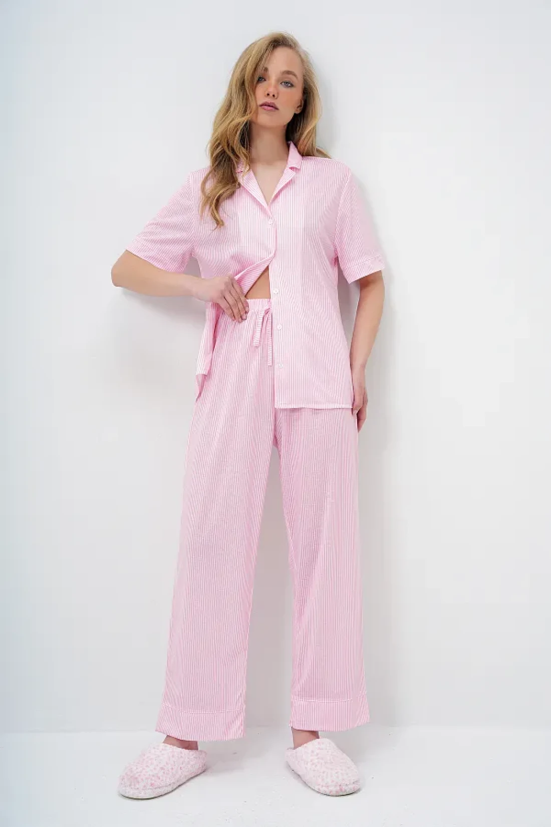Trend Alaçatı Stili طقم بيجامة وقميص وبنطلون مخطط بأكمام وأرجل مزدوجة وردي اللون للنساء PJM-X13918