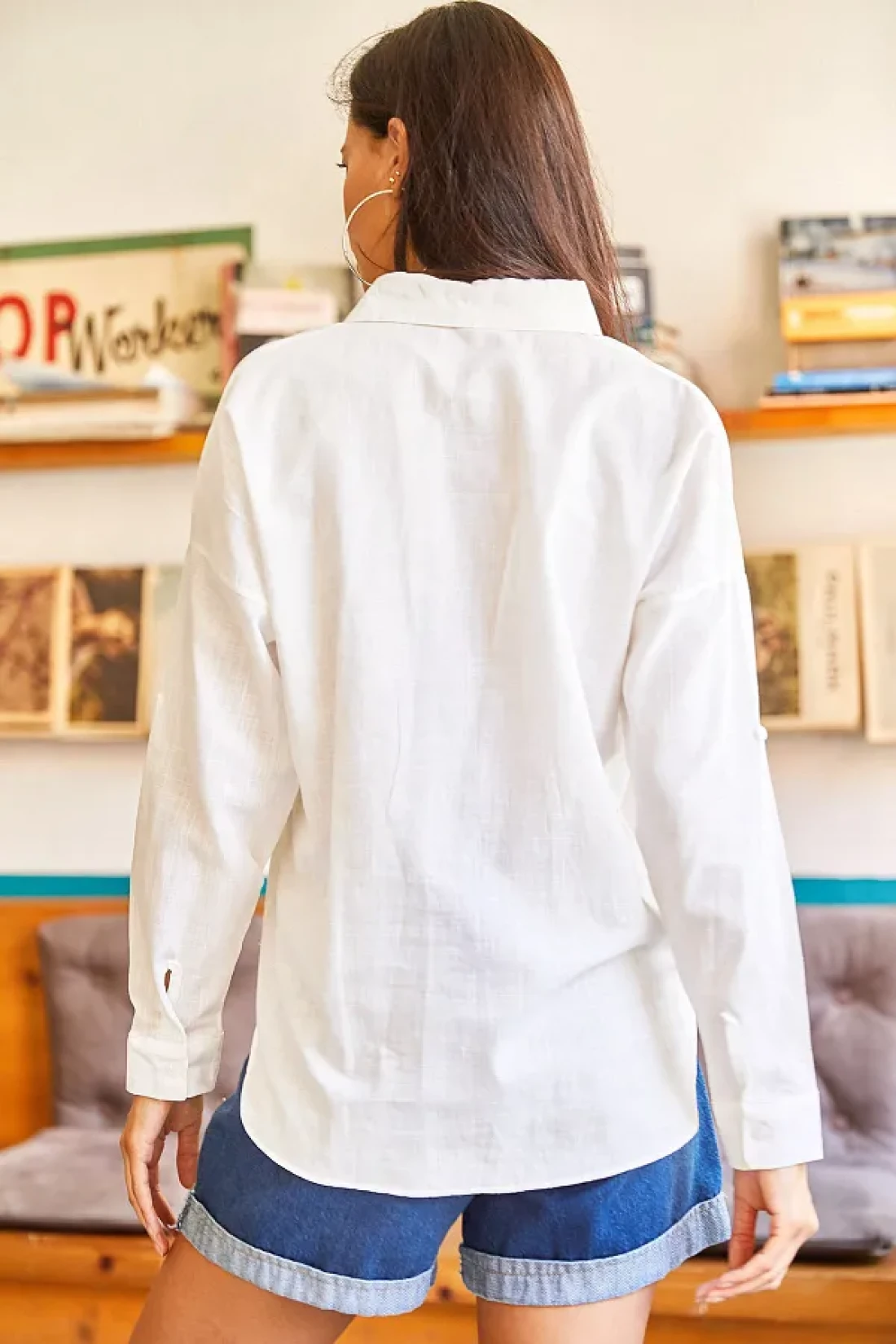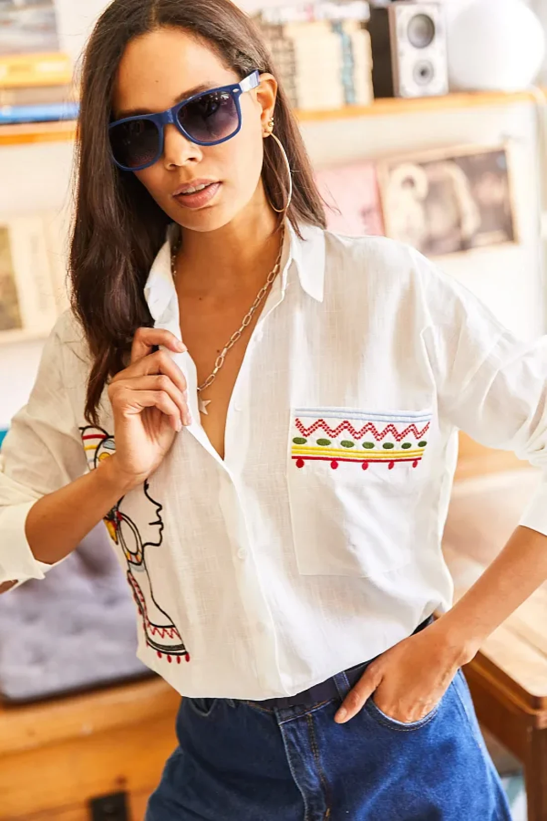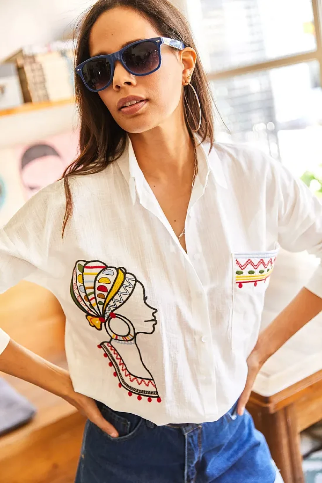 Olalook قميص نسائي كاجوال من الكتان المنسوج مع جيوب وتطريز GML-19001009