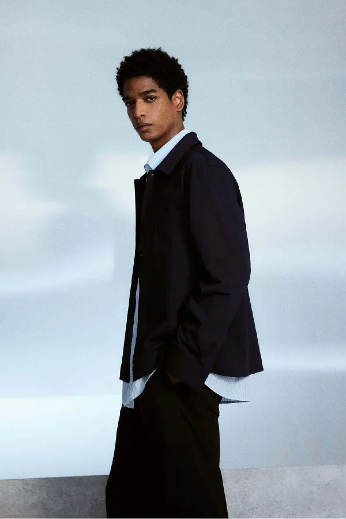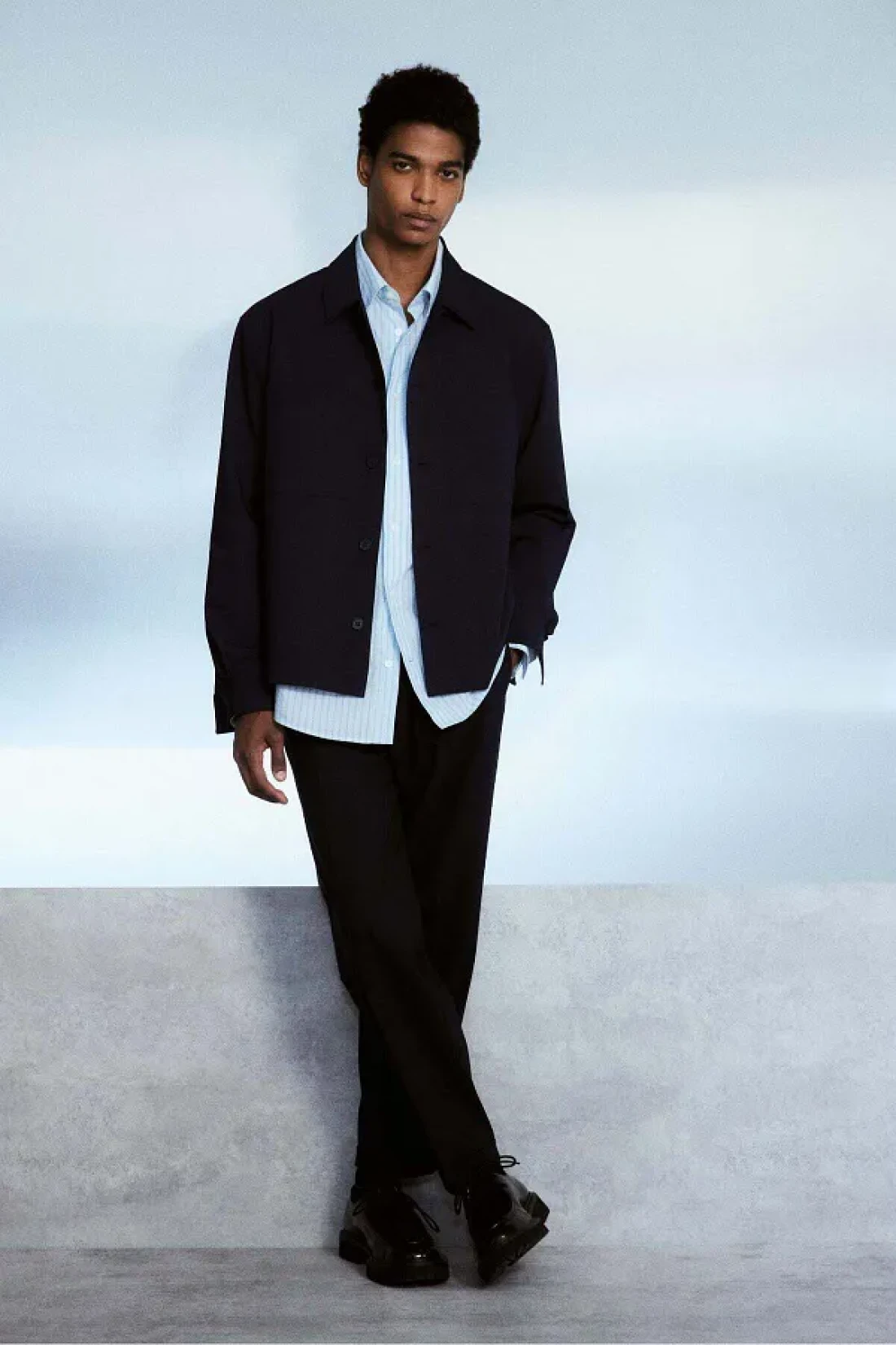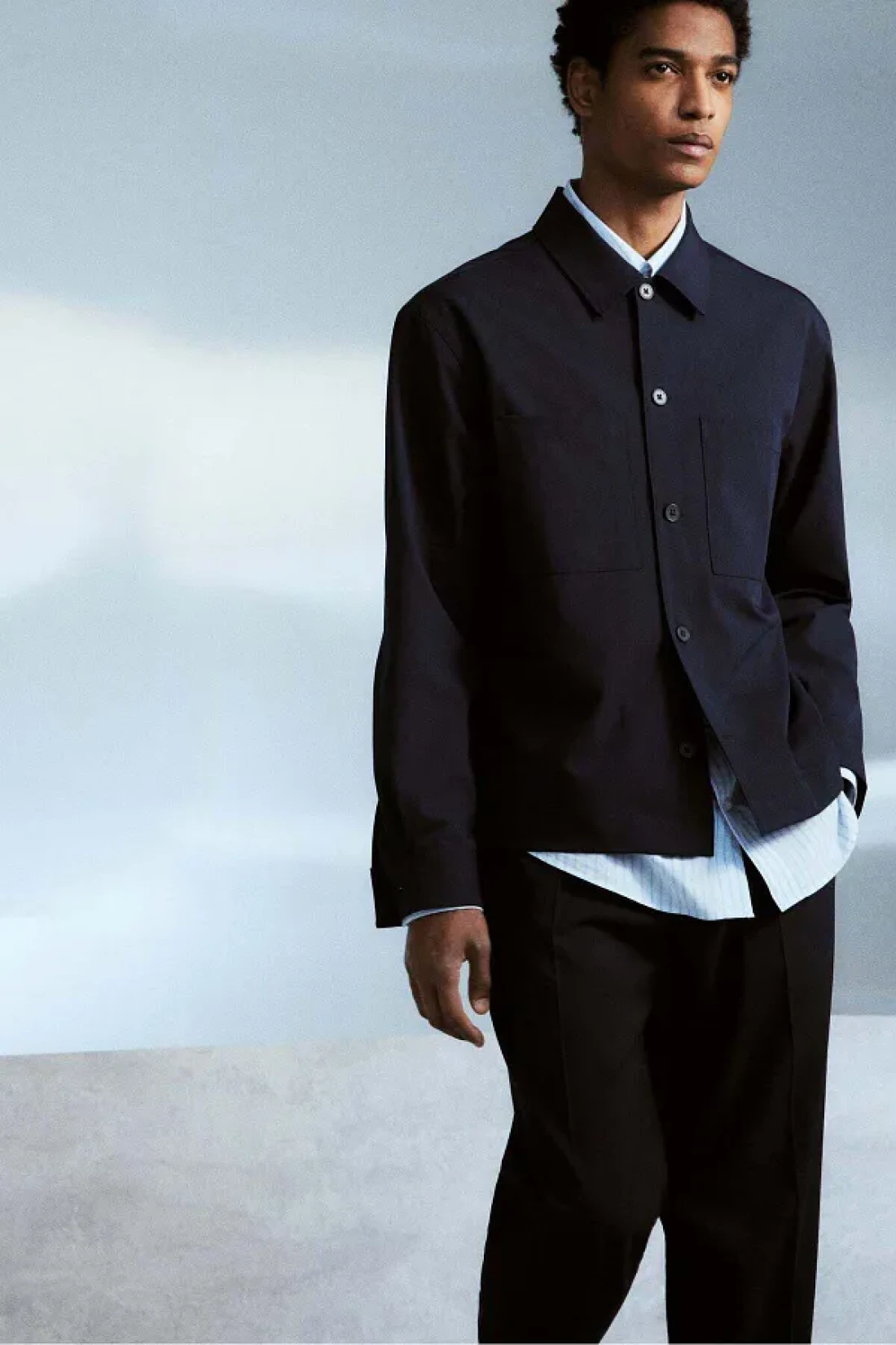 قميص خارجي على شكل صندوق بنسيج ناعم مع ياقة مطوية، وجبهة فرنسية، ونير في الخلف، وجيوب صدر مفتوحة وأكمام طويلة مع زر وشق عند الأكمام.؛ حاشية مستقيمة القطع.؛ مقاس عادي لارتداء مريح وظلية كلاسيكية.