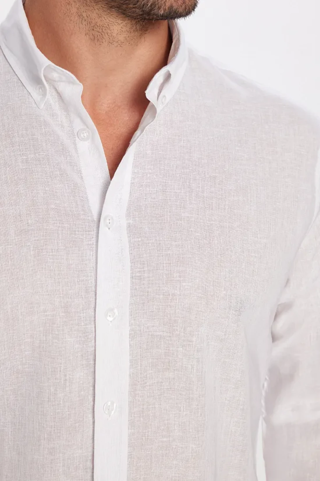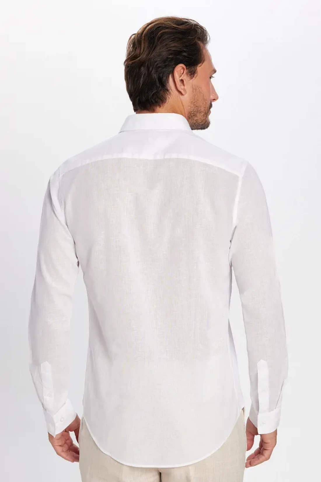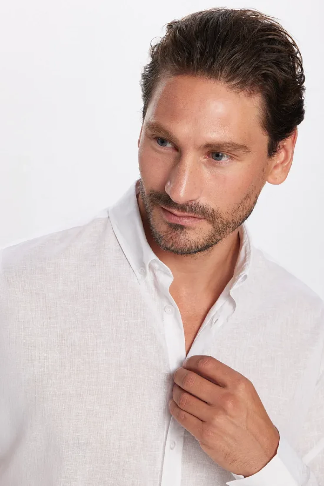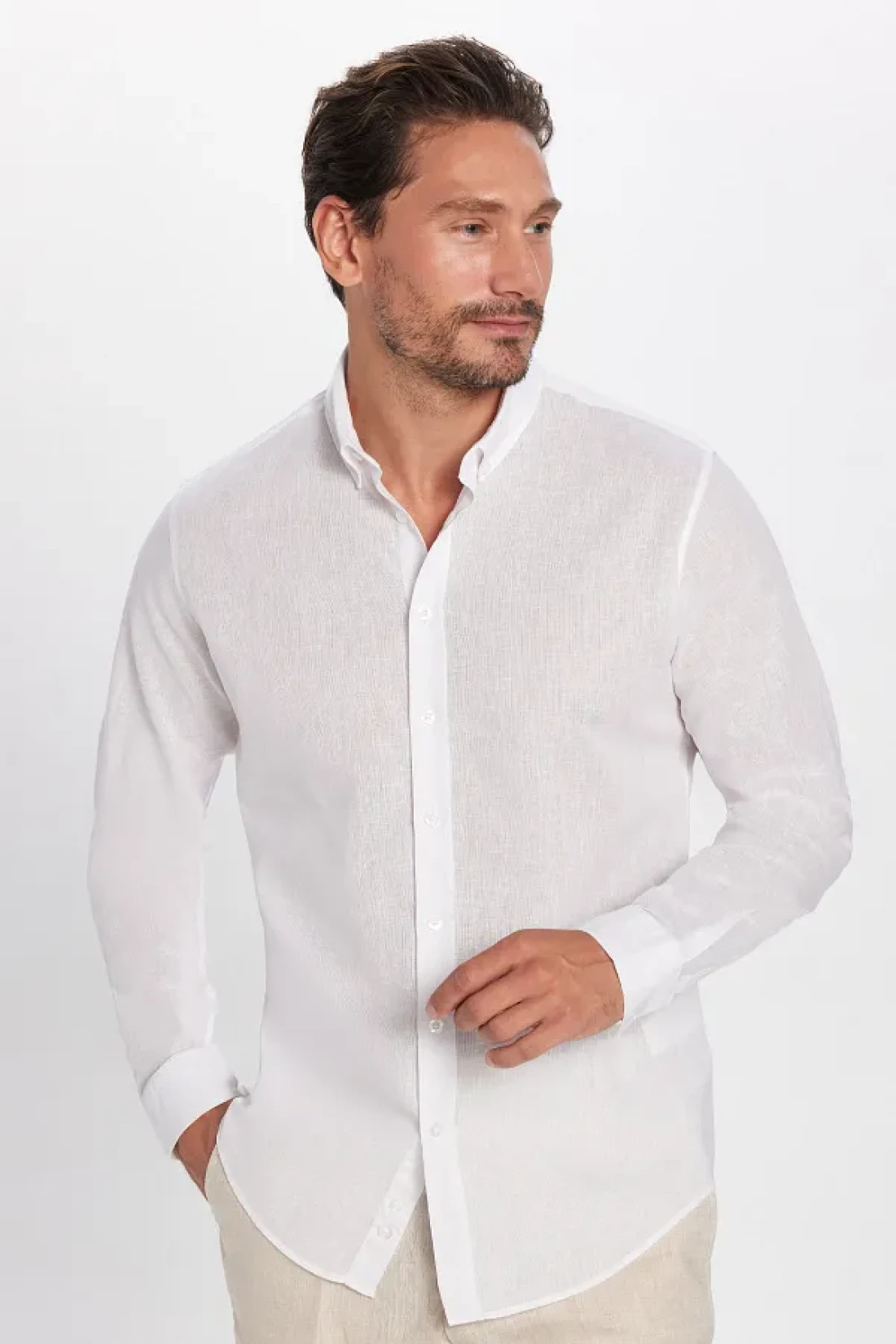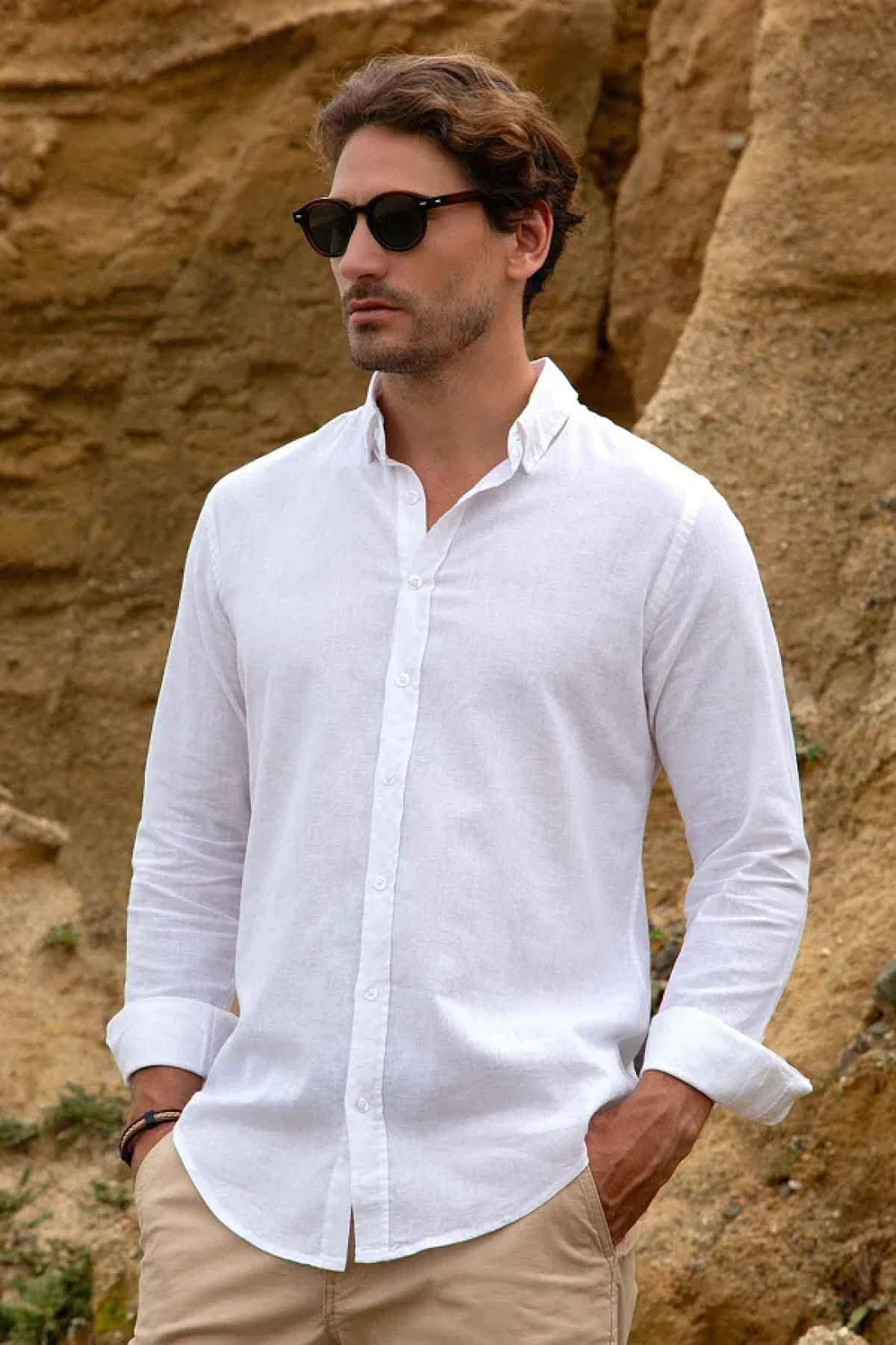 Tudors سلسلة كتان فاخرة للرجال - قميص رياضي أبيض بأكمام طويلة وقصة ضيقة