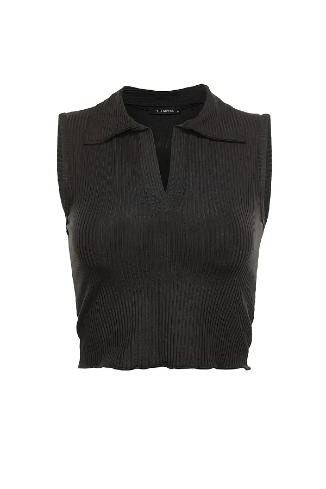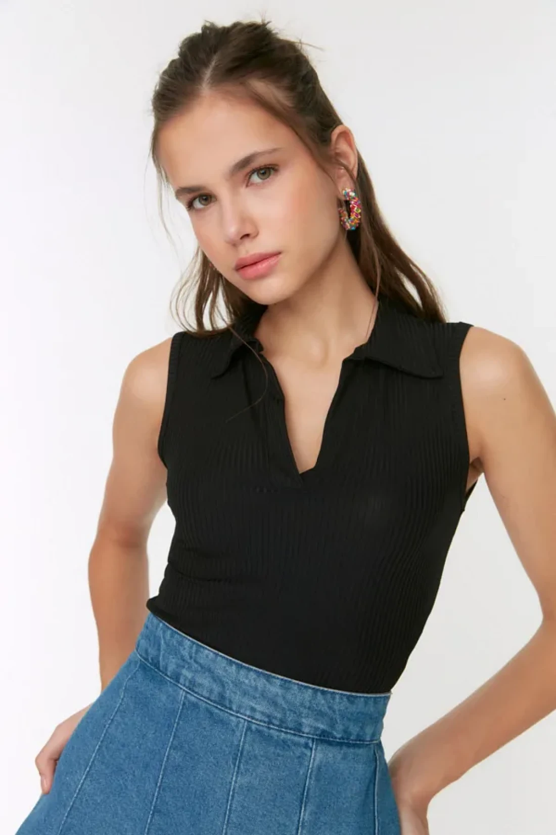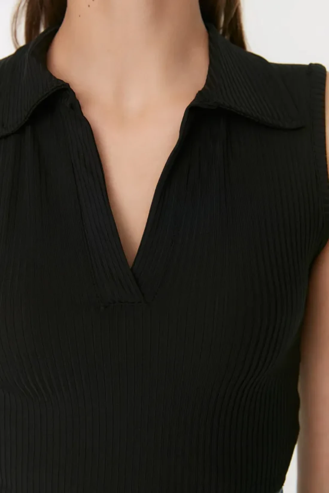 Collection بلوزة محبوكة قابلة للتمدد برقبة بولو سوداء اللون TWOSS22BZ0335