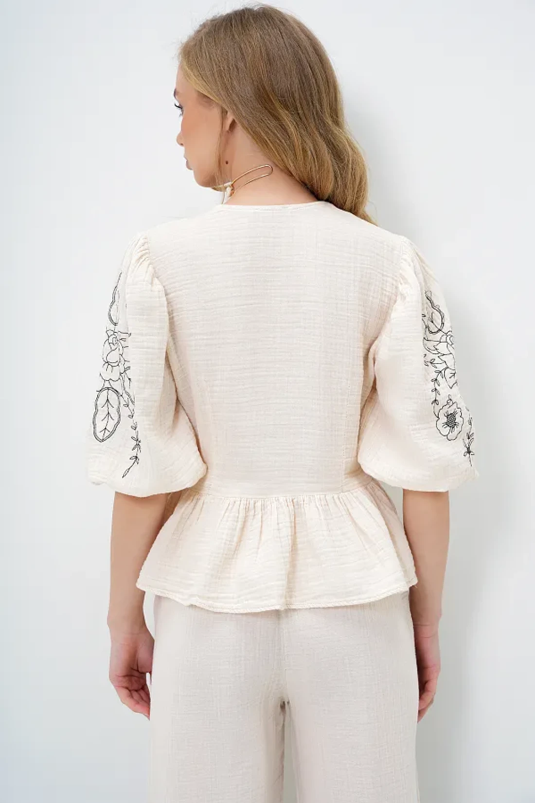 100٪ قطن؛ طول المنتج: 53 سم الصدر: 86 سم الخصر: 82 طول الكم: 39 سم؛ حجم العينة: S/36/1؛ قياسات العارضة: الطول: 1.70 ، الصدر: 80 ، الخصر: 58 ، الورك: 89 ، الحجم: S/36/1؛ قد تختلف الألوان في لقطات الاستوديو بسبب اختلافات الإضاءة. البلوزة الكتانية المكشكشة مع تفاصيل الربط والتطريز على شكل حرف V، تبرز أناقتك بقصتها الأنيقة وتصميمها اللافت للنظر. تم تصميم كل تفصيل لإضافة لمسة من الرقي إلى أسلوبك.