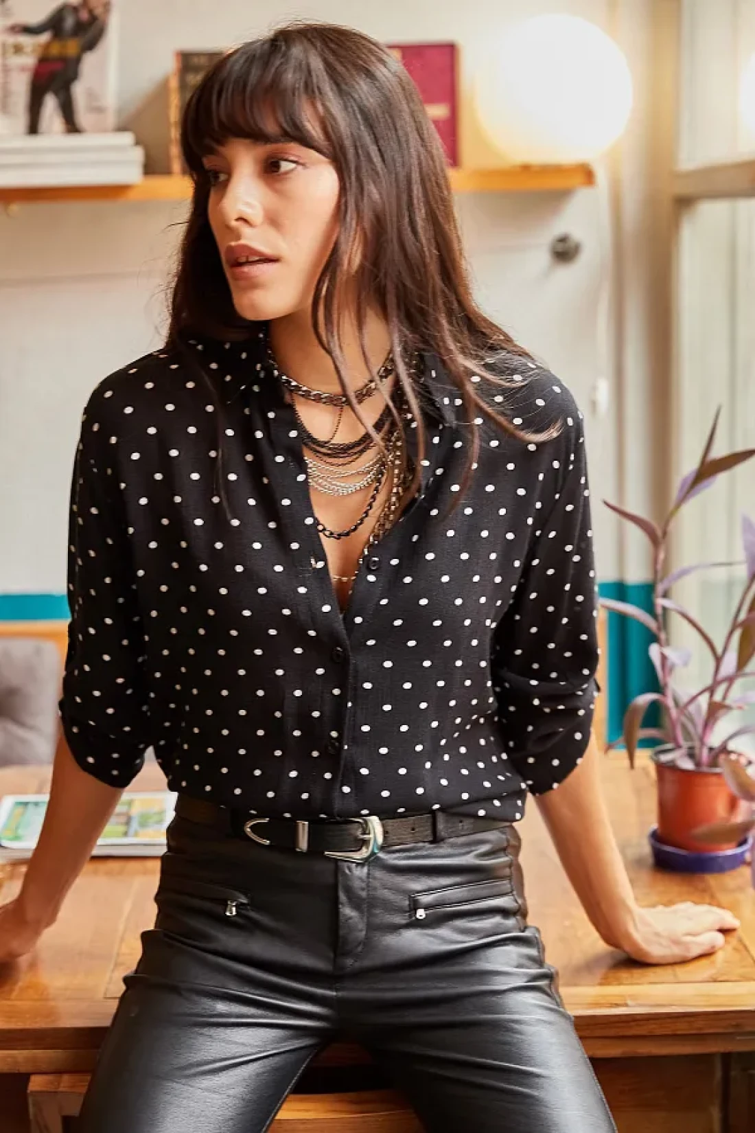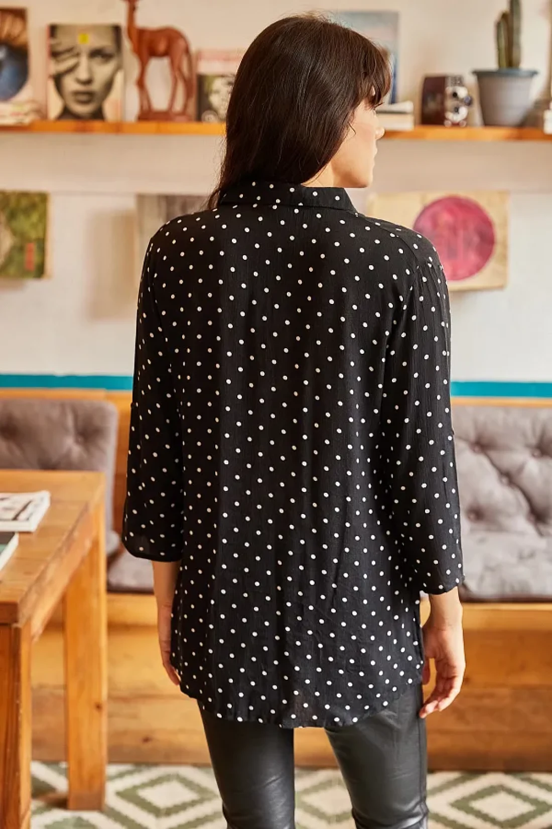 Olalook قميص نسائي منقط بأكمام سوداء GML-19000348