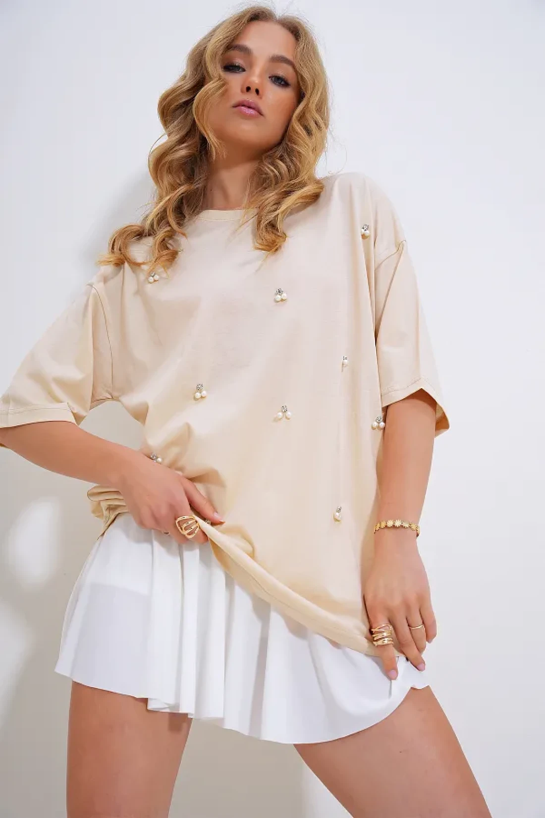 Trend Alaçatı Stili تي شيرت نسائي بيج برقبة دائرية ومطرز باللؤلؤ والحجر ALC-X11964