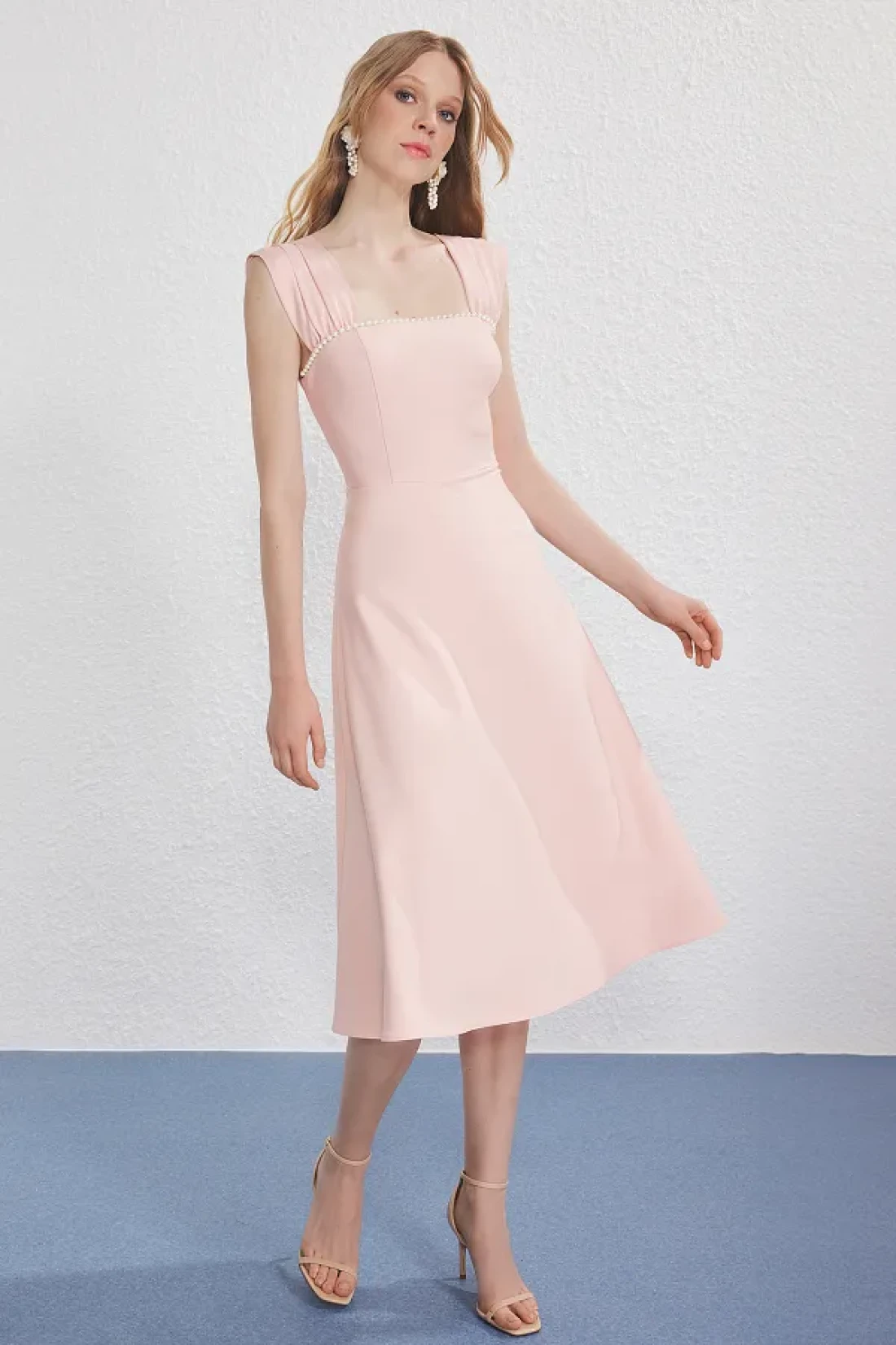 Collection فستان سهرة متوسط الطول منسوج بتفاصيل لؤلؤ مسحوق وفتحة الخصر فستان التخرج الليلي TPRSS25EL00287