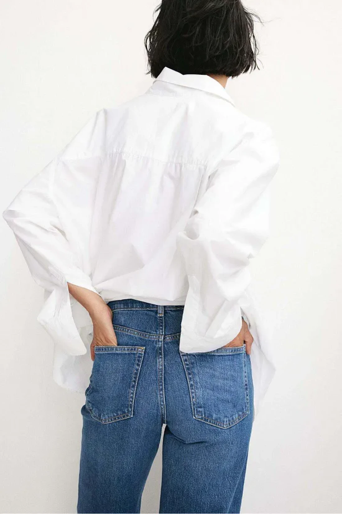 بنطلون جينز بخمسة جيوب مصنوع من قماش الدنيم القطني المغسول مع خصر عالي وسحاب وفتحة زر وساقين واسعتين مستقيمتين.