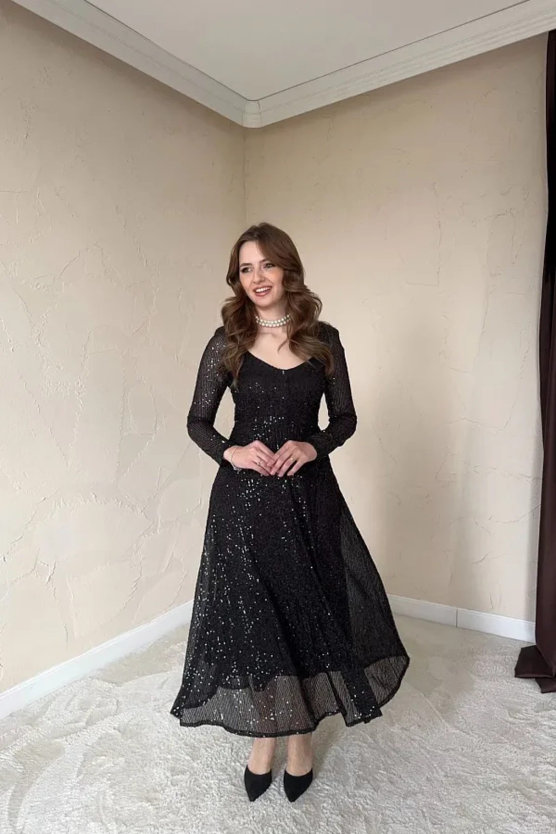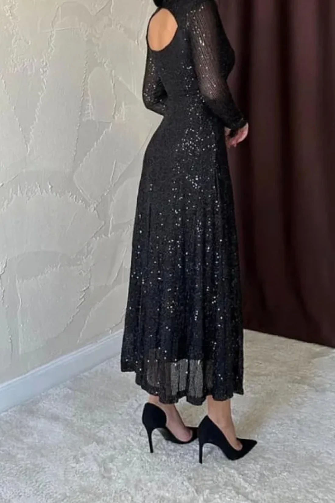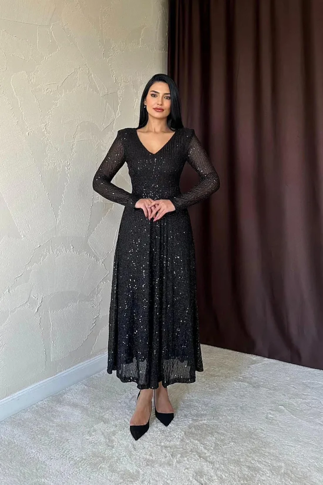 وصف المنتج: فستان متوسط الطول بريق أسود من بارلا