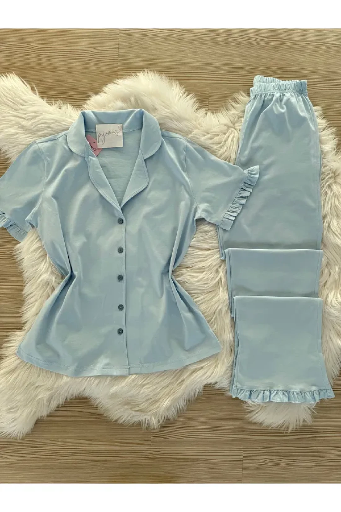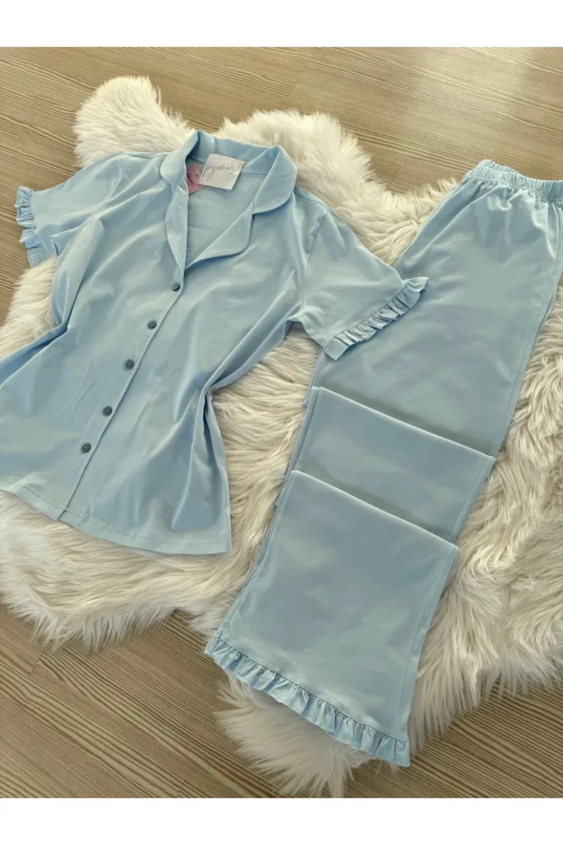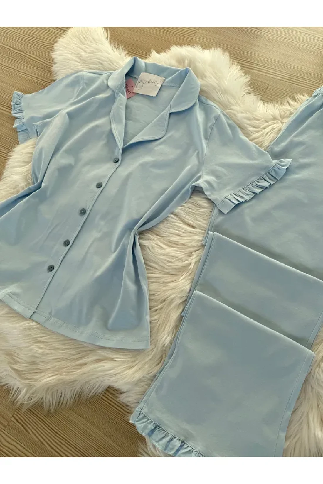 Pijamacs طقم بيجامة بأكمام قصيرة وأزرار أمامية وأكمام قطنية باللون الأزرق الفاتح مع تفاصيل كشكشة على الساقين