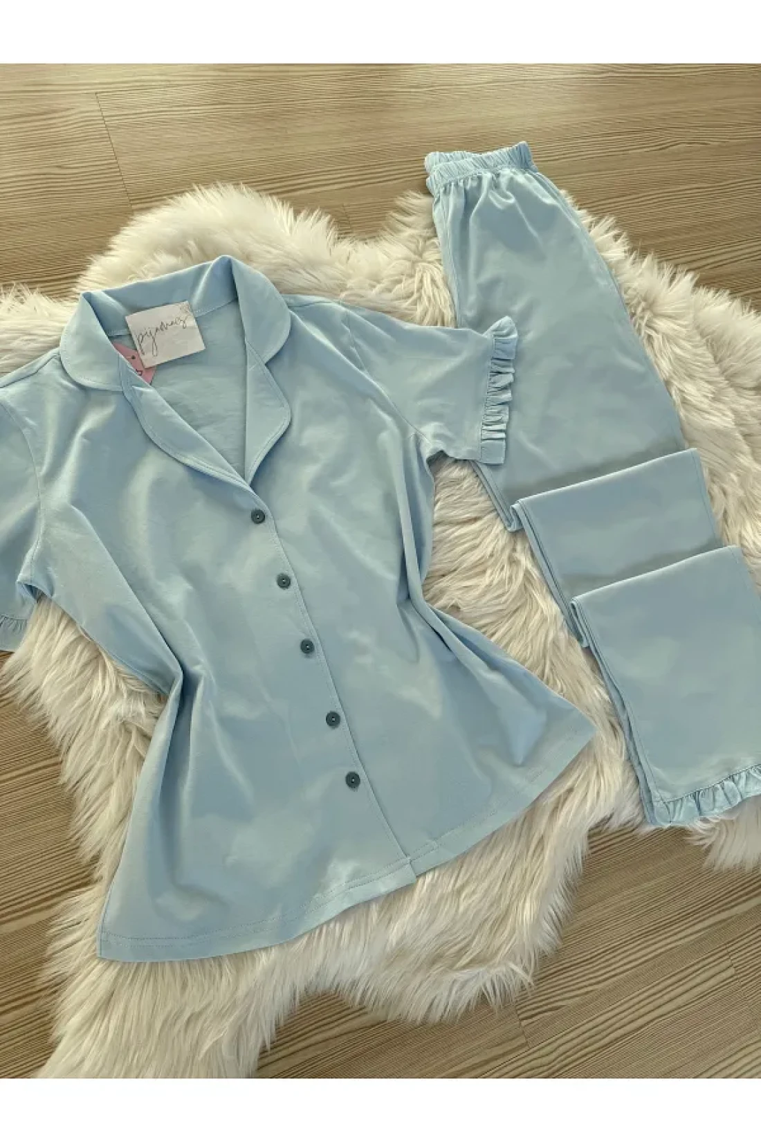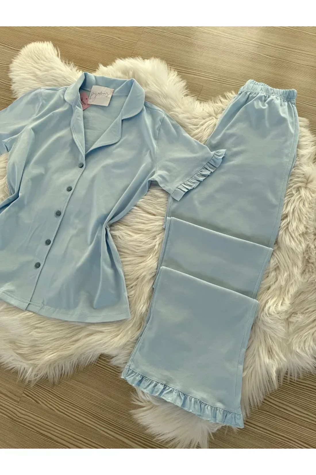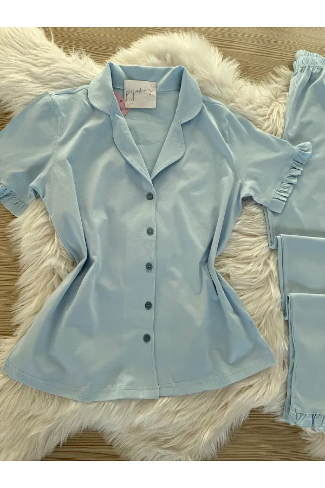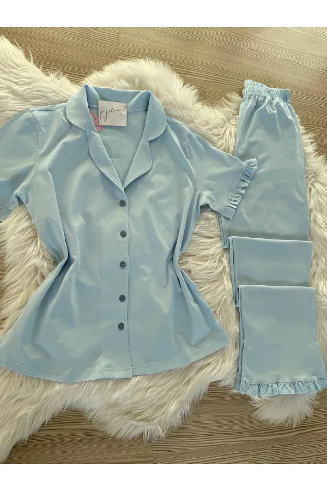 Pijamacs طقم بيجامة بأكمام قصيرة وأزرار أمامية وأكمام قطنية باللون الأزرق الفاتح مع تفاصيل كشكشة على الساقين