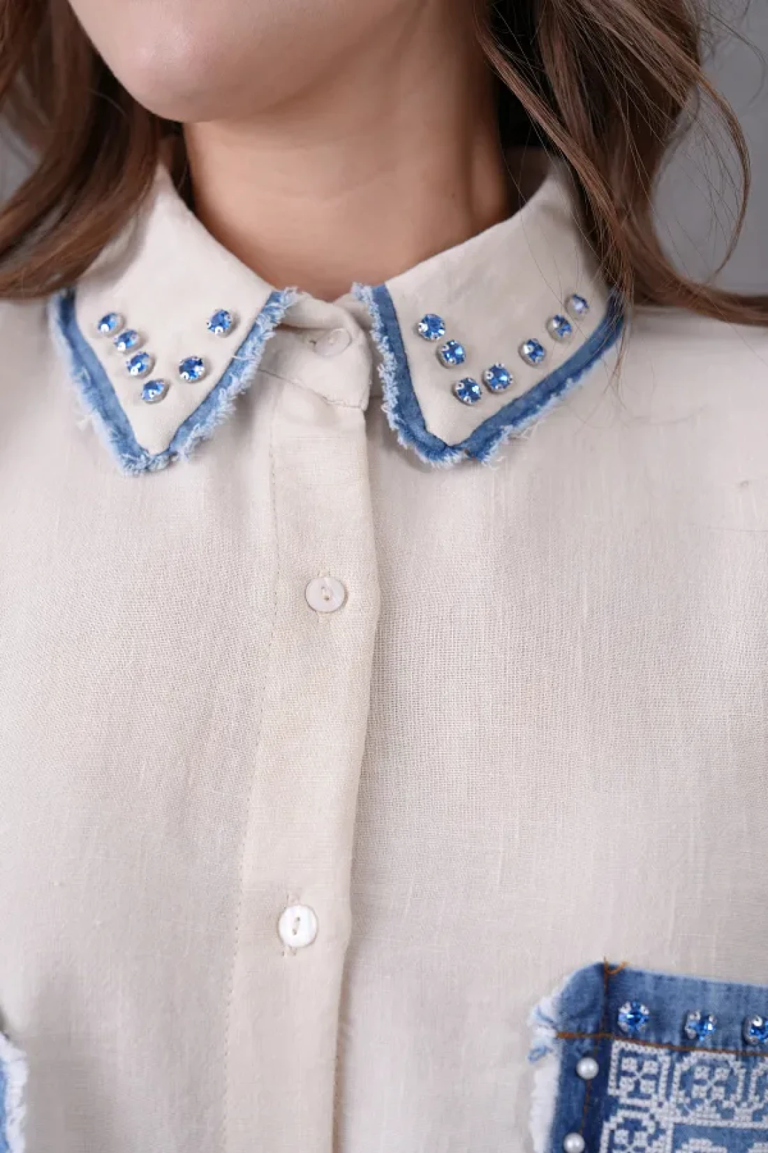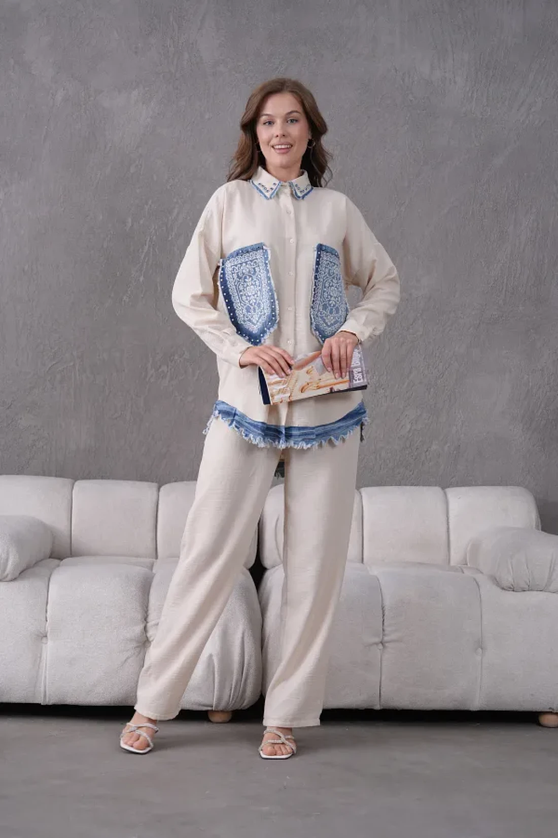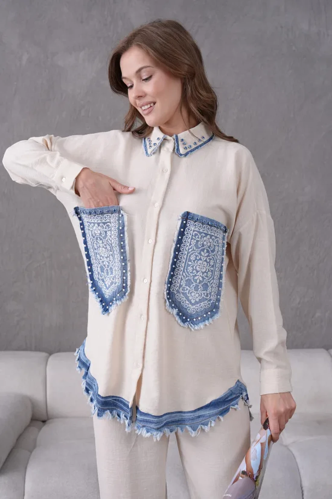 Miss Allos طقم قميص وبنطلون من الكتان بجيب أمامي مطرز باللؤلؤ والحجر للنساء