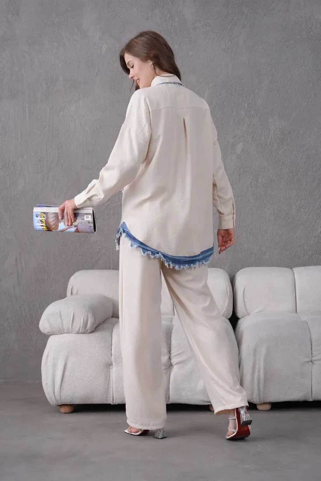- قميص وبنطلون من الكتان للسيدات من Miss Allos مطرز باللؤلؤ والأحجار مع تفاصيل جينز - يوفر الأناقة والراحة مع ياقة القميص الكلاسيكية. إنه خيار مثالي لأشهر الصيف مع تفاصيله الجذابة المصنوعة من اللؤلؤ والأحجار. - بفضل تصميمه الخالي من الحزام، يمكن دمجه بسهولة ويناسب جميع أنواع الجسم. تم تصميمه خصيصًا لمجموعة الشباب؛ يعطي مظهرًا ديناميكيًا وحديثًا. - الطقم المكون من قطعتين يمكن تفضيله للاستخدام اليومي وفي المناسبات الخاصة. من الممكن إنشاء نمط شامل باستخدام القطعتين المدرجة في الحزمة. - يوفر تجربة مريحة بفضل قوامه الخفيف والقابل للتنفس مع مزيج الكتان. تتيح ميزة الإغلاق الكامل بالزر الاستخدام العملي، بينما تضيف تفاصيل الشرابة لمسة جمالية. - يواكب الاتجاهات مع قصته الواسعة، بينما يوفر البنطلون حرية الحركة المريحة. مع هيكلها غير المبطن، تعطي الأولوية للخفة، بينما يوفر نسيجها المتوسط السمك الراحة المثالية خلال التحولات الموسمية. - يوصى بالعناية به وفقًا لتعليمات الغسيل من النوع 1؛ بهذه الطريقة، يمكنك الحفاظ عليه كما كان في اليوم الأول لفترة طويلة. - التصميم الغني بتفاصيل التطريز المطرزة يعرض مظهرًا راقيًا، بينما لا تتنازل وظيفة الجيب المزدوج عن التطبيق العملي. المادة، التي تتكون من خليط من 70% قطن و 30% بوليستر، تكون لطيفة على بشرتك وتزيد من المتانة.