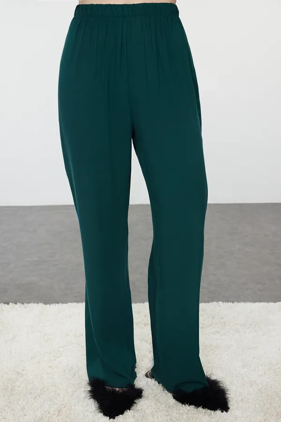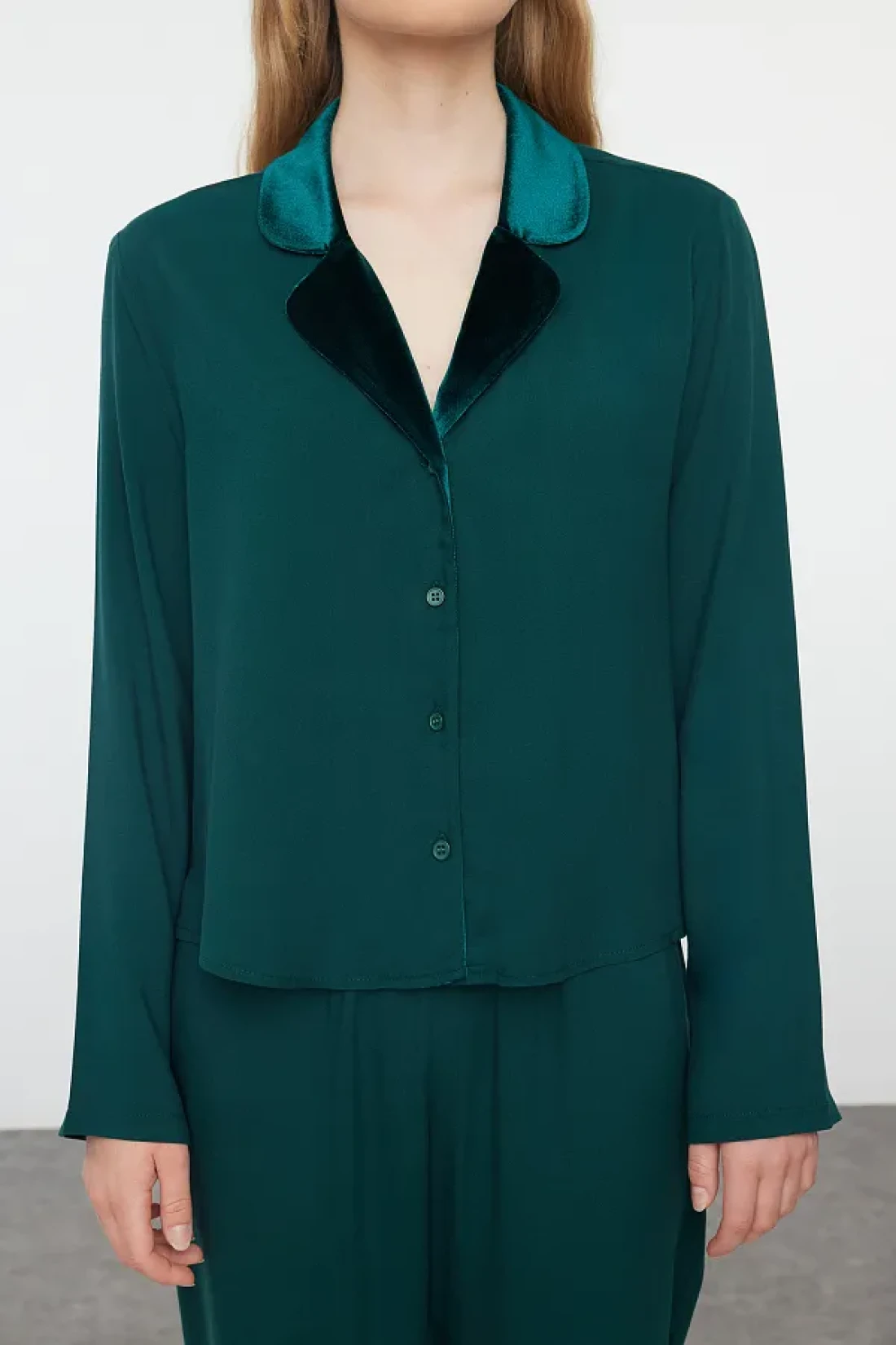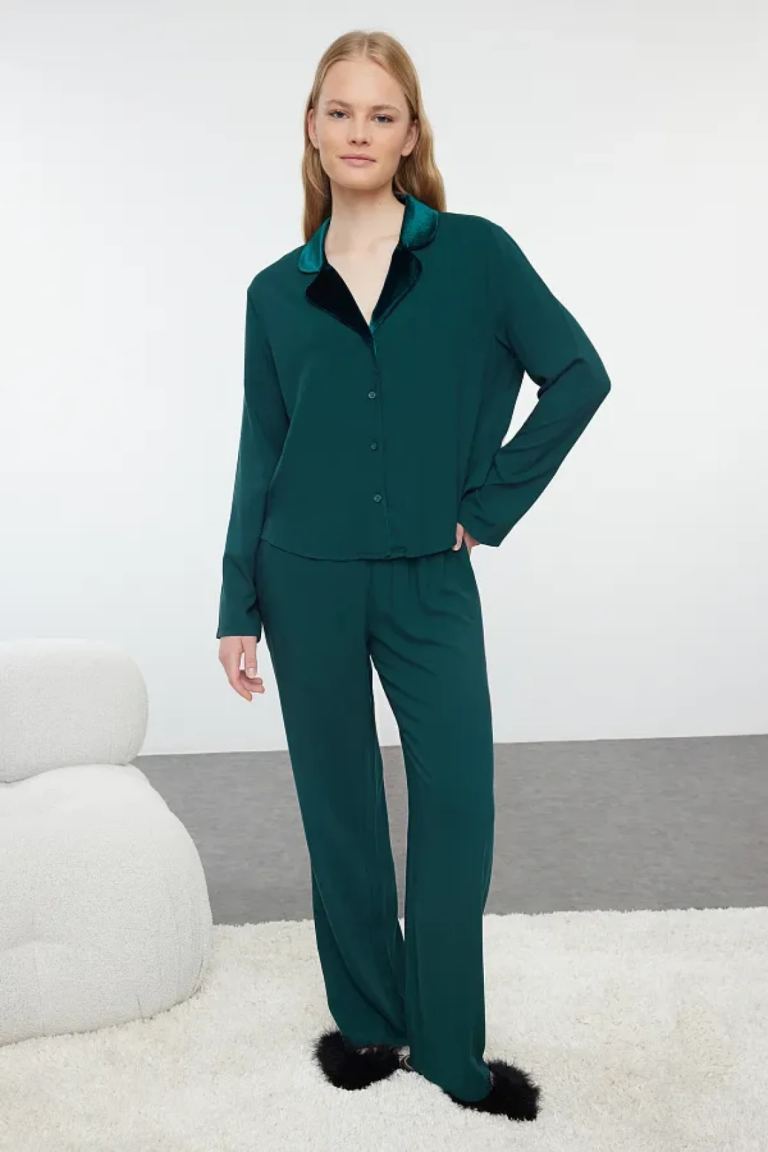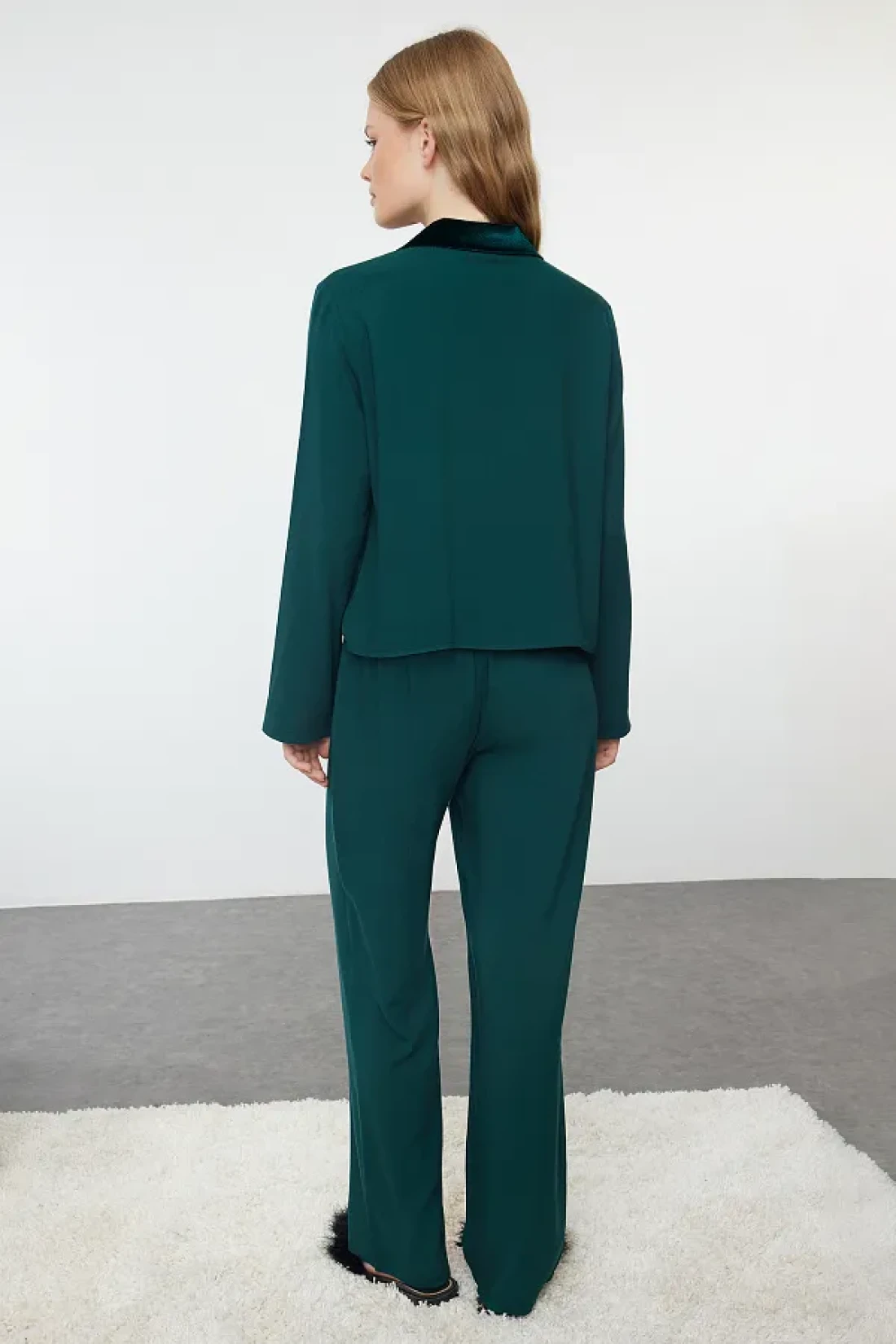 Collection طقم بيجامة مخملية من الفيسكوز باللون الأخضر الزمردي - تفاصيل طية صدر السترة، THMAW25PT00134