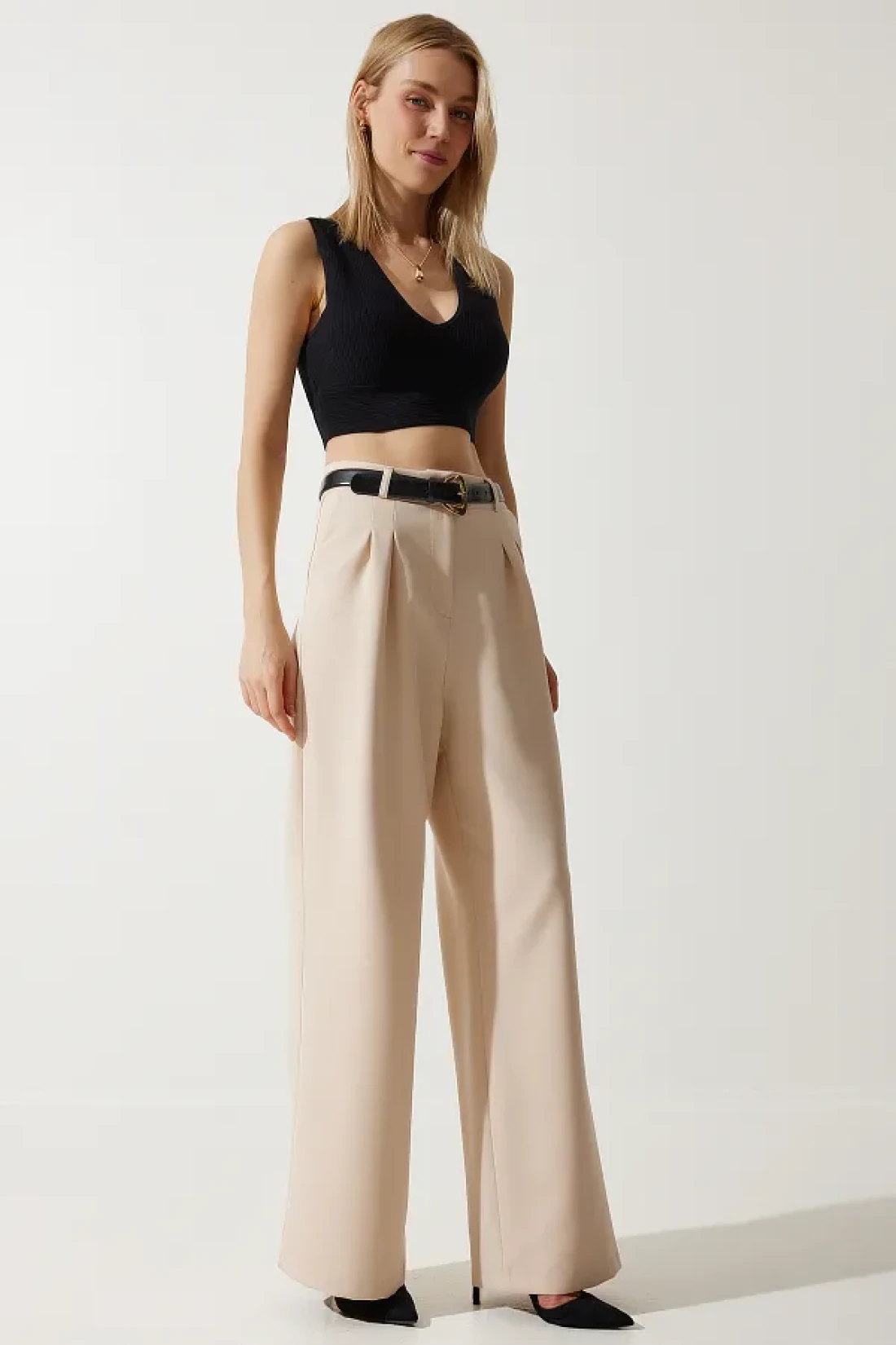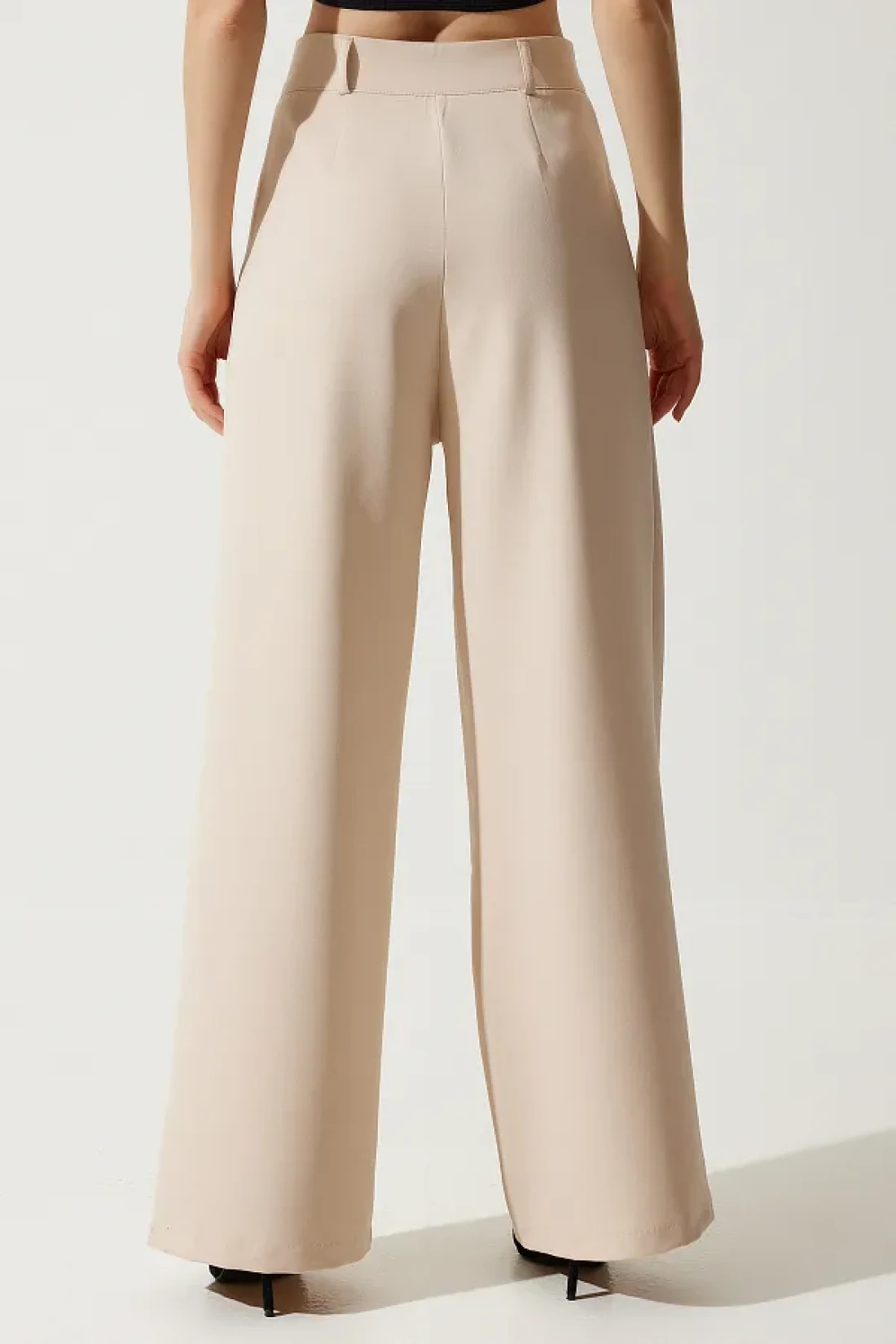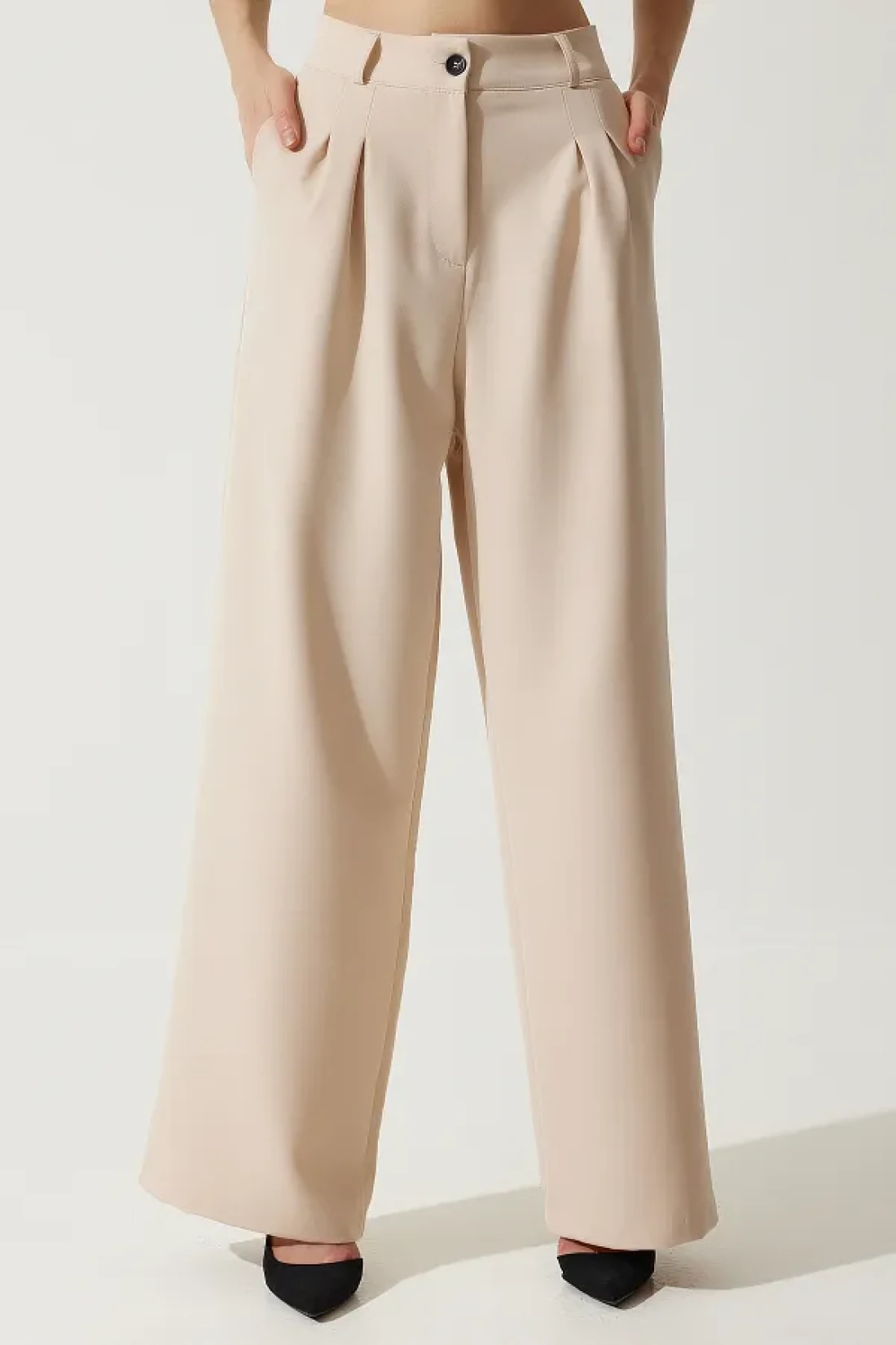 Happiness İstanbul بنطال رجالي منسوج واسع الساق باللون الكريمي للنساء HG00001
