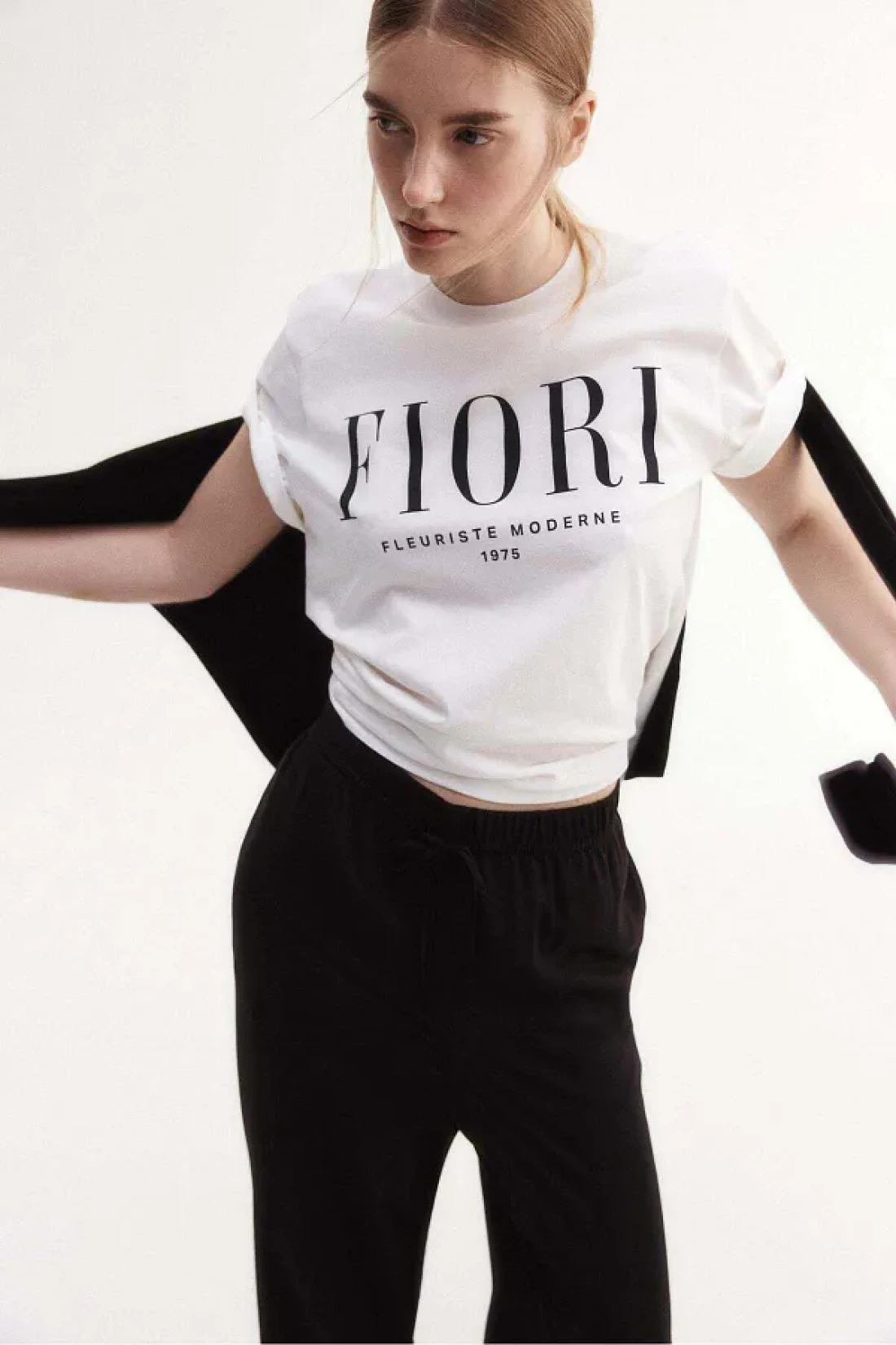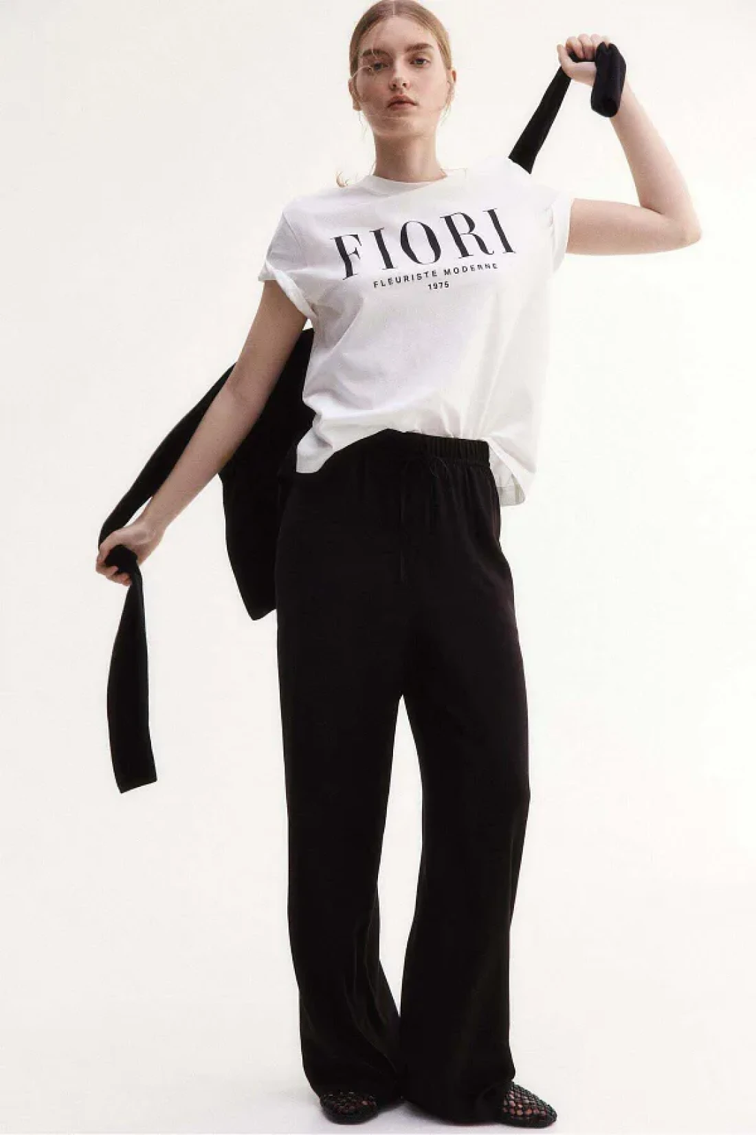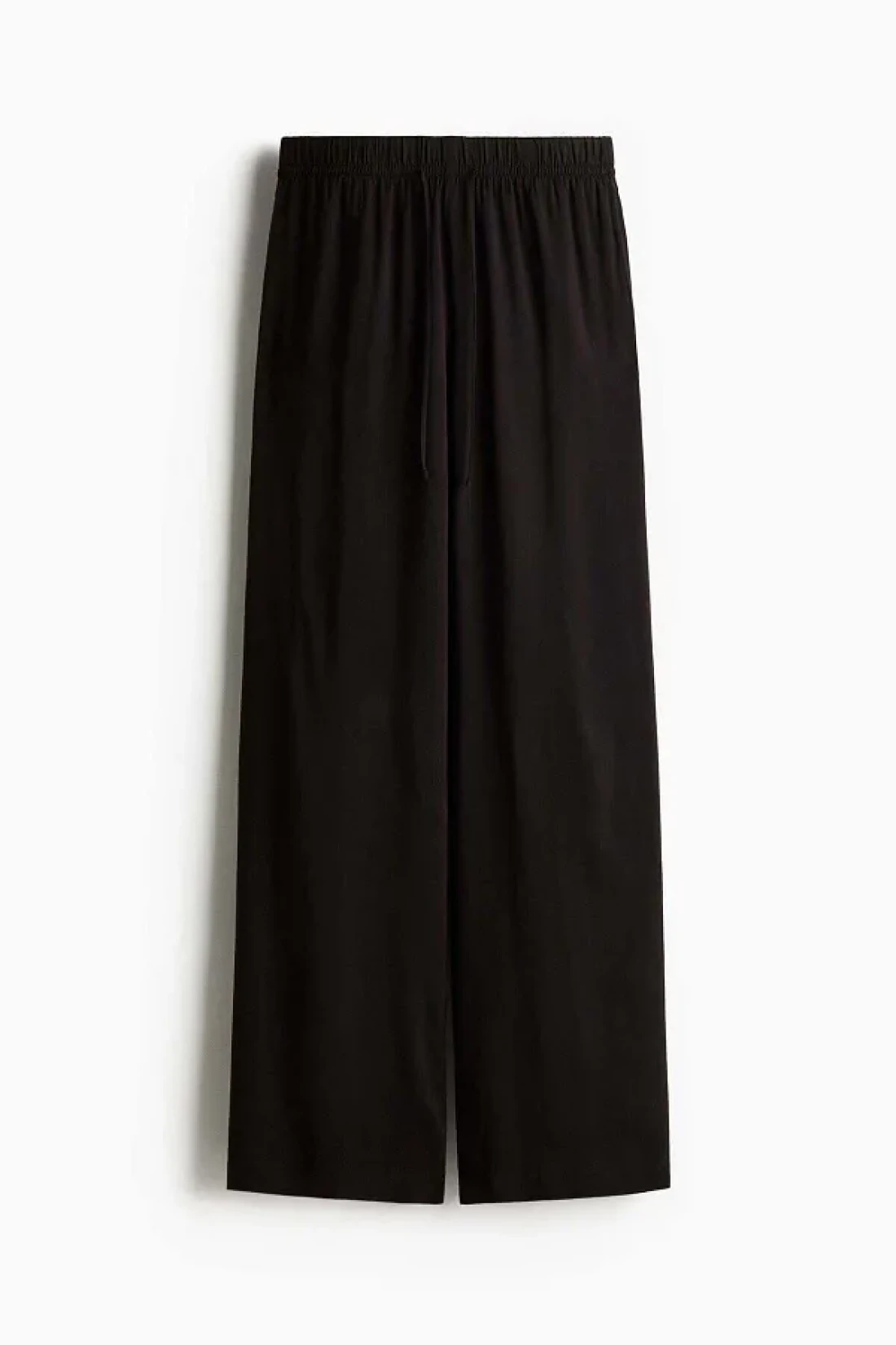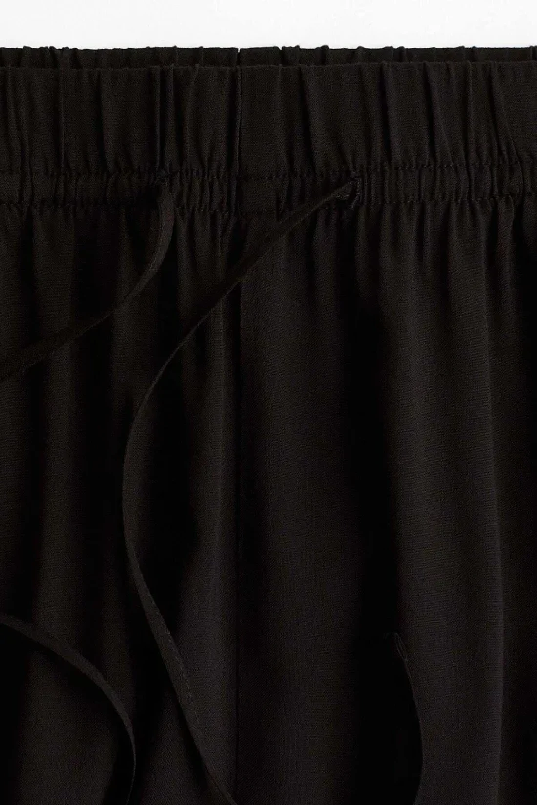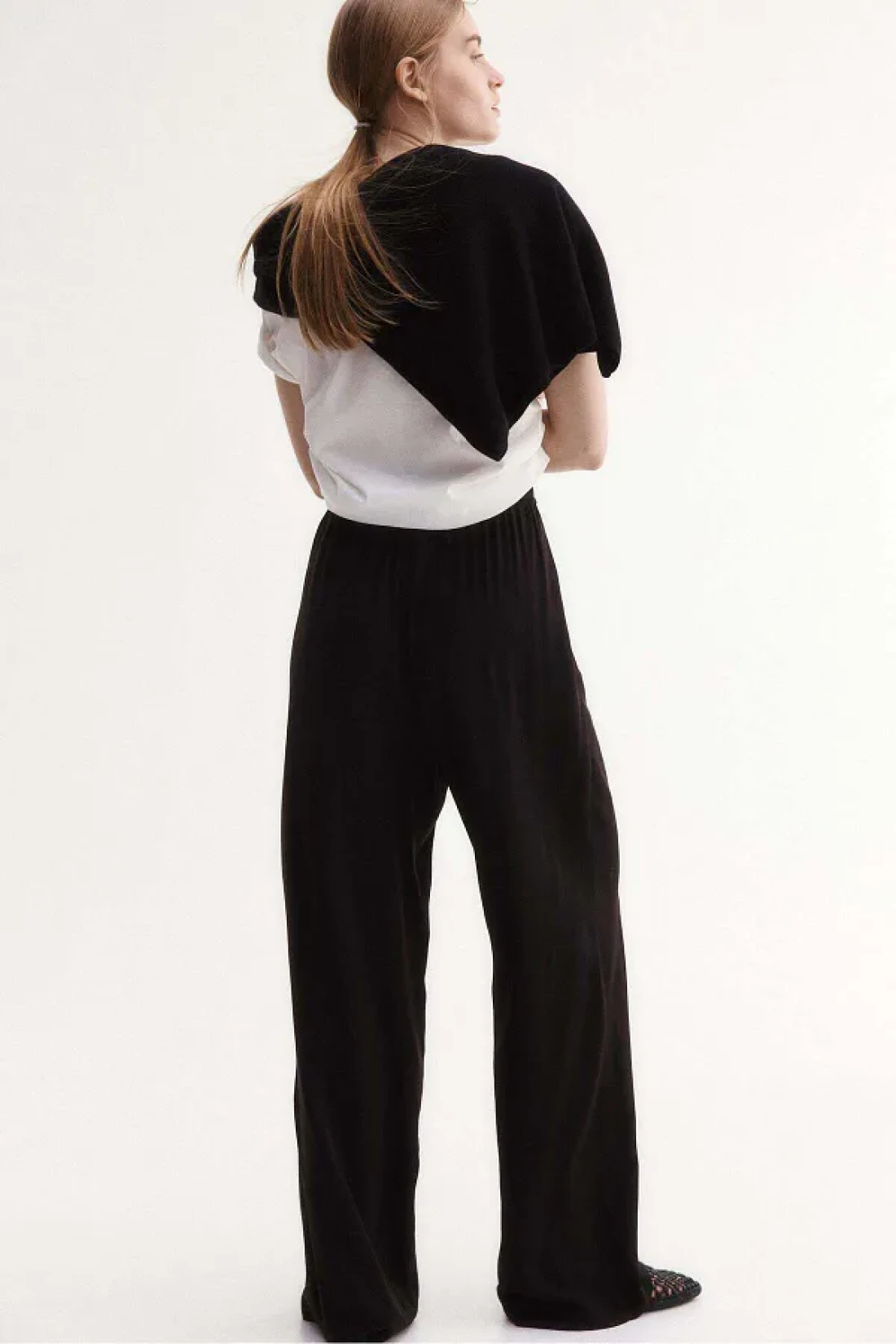 بنطلون من نسيج فسكوزي خفيف الوزن يتميز بخصر مرتفع مع مطاط مغطى ورباط ضيق. قصة فضفاضة مع جيوب سرية في اللحامات الجانبية وساقين واسعة ومستقيمة.