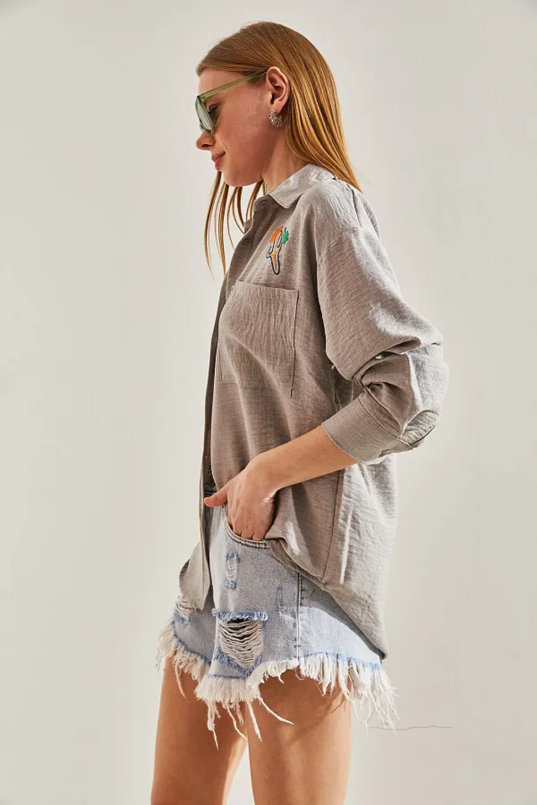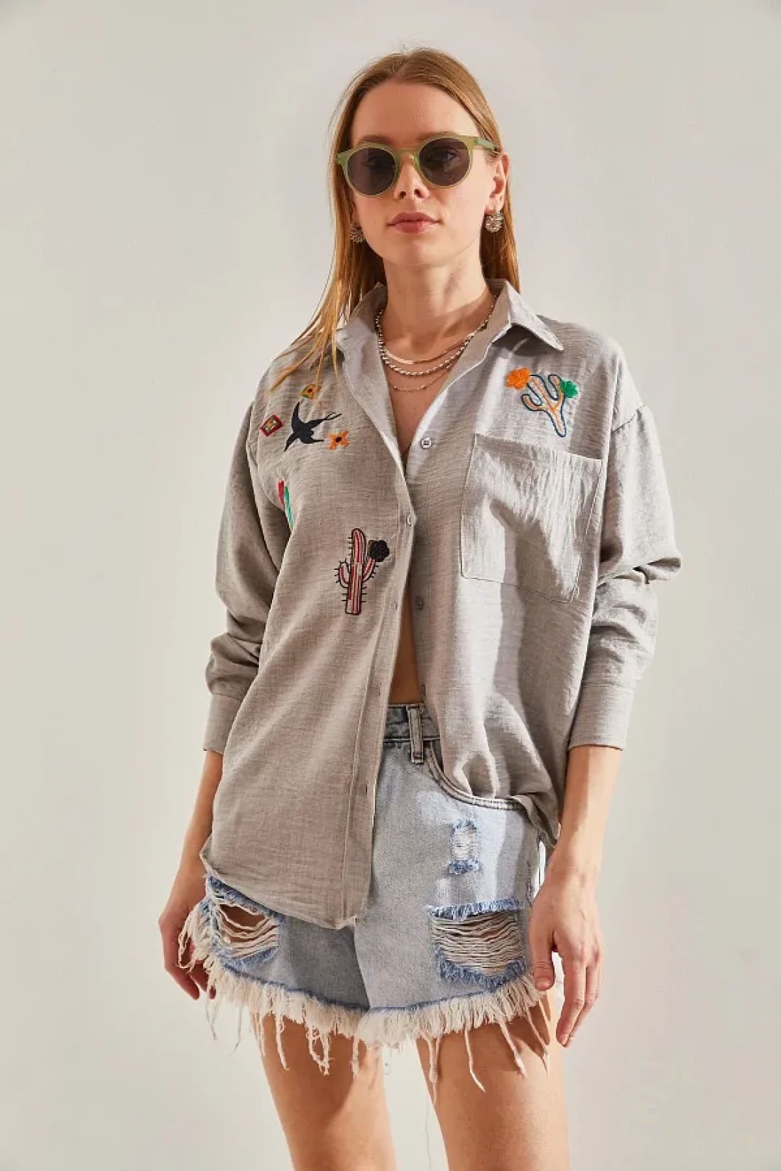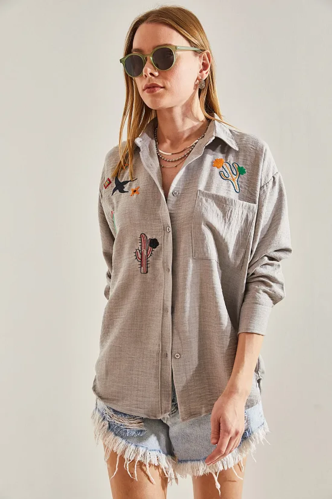يوفر الاستخدام العملي من خلال زر الإغلاق، بينما يمنح تصميم طوق القميص الكلاسيكي مظهرًا خالداً. بفضل مادته المصنوعة من مزيج القطن والبوليستر، فإنه يتمتع ببنية متينة وقابلة للتنفس. هذا القميص، الذي يقدم جمالية جذابة بتفاصيله المطرزة، يصبح الخيار لأولئك الذين يبحثون عن تصميم خاص. توفر هيكلتها المزودة بجيوب مساحة مريحة لحمل أغراضك الصغيرة معك.