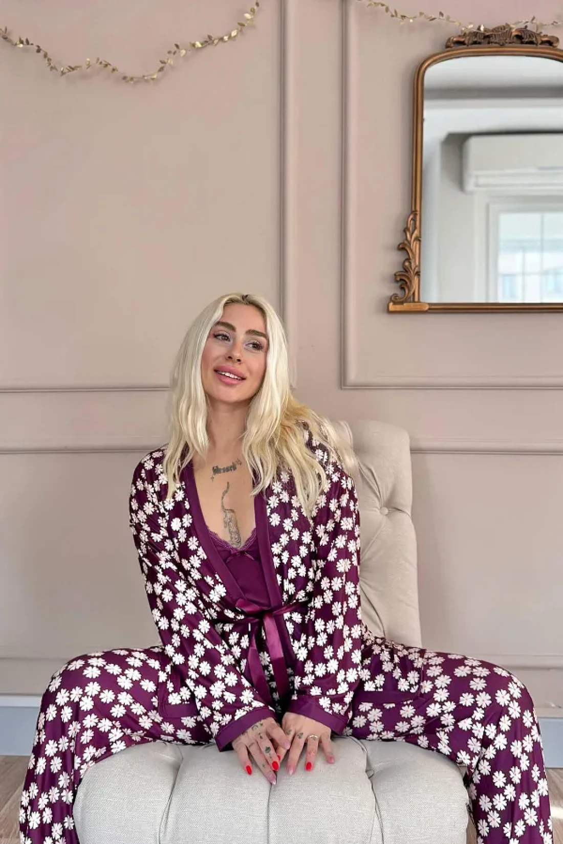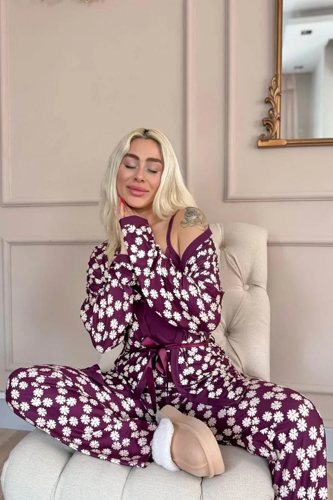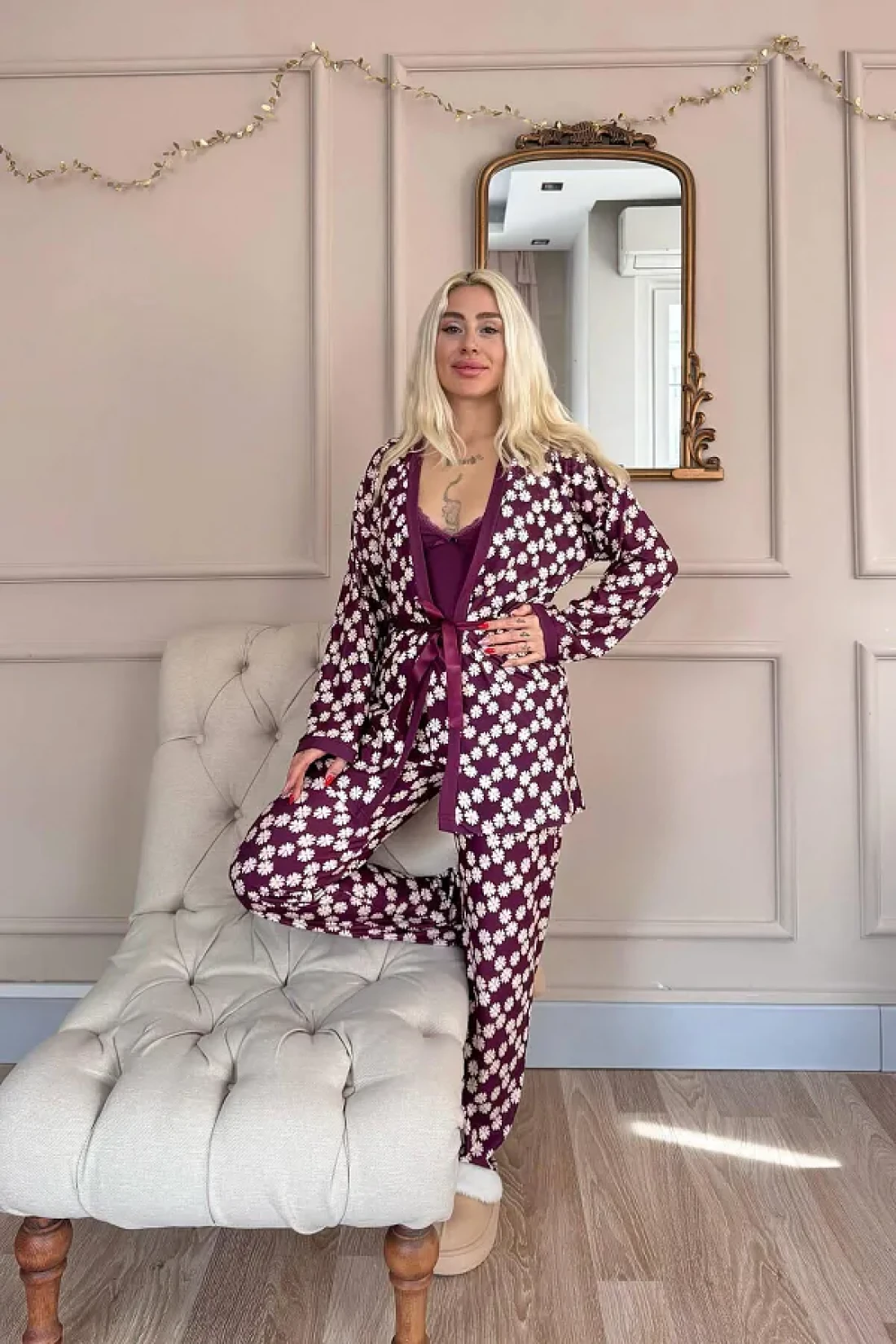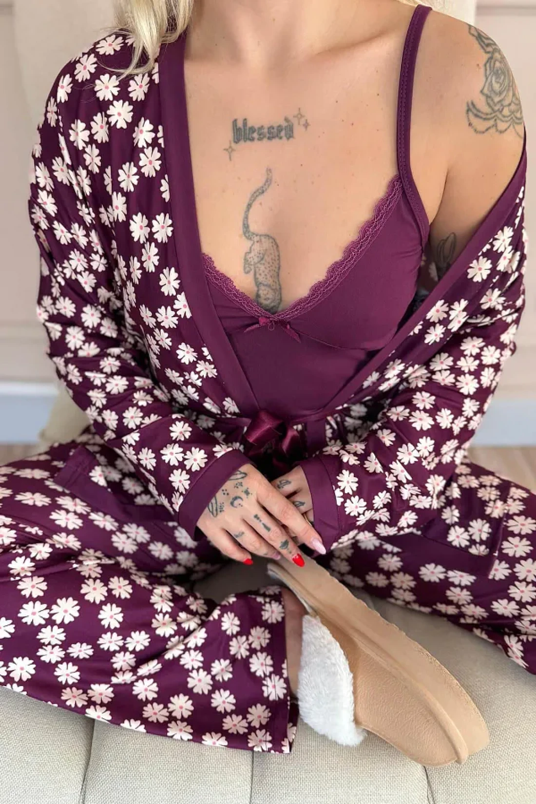 قماش Yumoş L قماش قابل للتمدد مستورد، سلسلة حصرية من 3 قطع، رداء مع أشرطة داخلية من الحبل، رداء طويل الأكمام، بيجامة طويلة؛ قياسات العارضة: الارتفاع: 1. 67، الوزن: 45، الصدر: 82، الخصر: 60، الورك: 86؛ قطع عادي عادي حجم العينة: S/36/1؛ نوع القماش: 30% بامبو، 60% فيسكوز، 10% إيلاستين؛ تم تصميم طقم البيجامة الفاخر المكون من 3 قطع للنساء الأنيقات، حيث يوفر الفخامة والأناقة والراحة في آن واحد! مع نسيجها الفاخر وتصميمها الجذاب، إنها خيار مثالي لأولئك الذين يرغبون في الشعور بالأناقة والراحة في نفس الوقت. بفضل مزيجه من 30% بامبو، 60% فيسكوز و10% إيلاستين، يوفر ملمسًا فائق النعومة ويتناسب تمامًا مع بشرتك. مواصفات المنتج ✔ مجموعة من 3 قطع: تتضمن البيجامة الداخلية بأشرطة خيطية، ورداء طويل الأكمام، وجزء سفلي طويل من البيجامة.