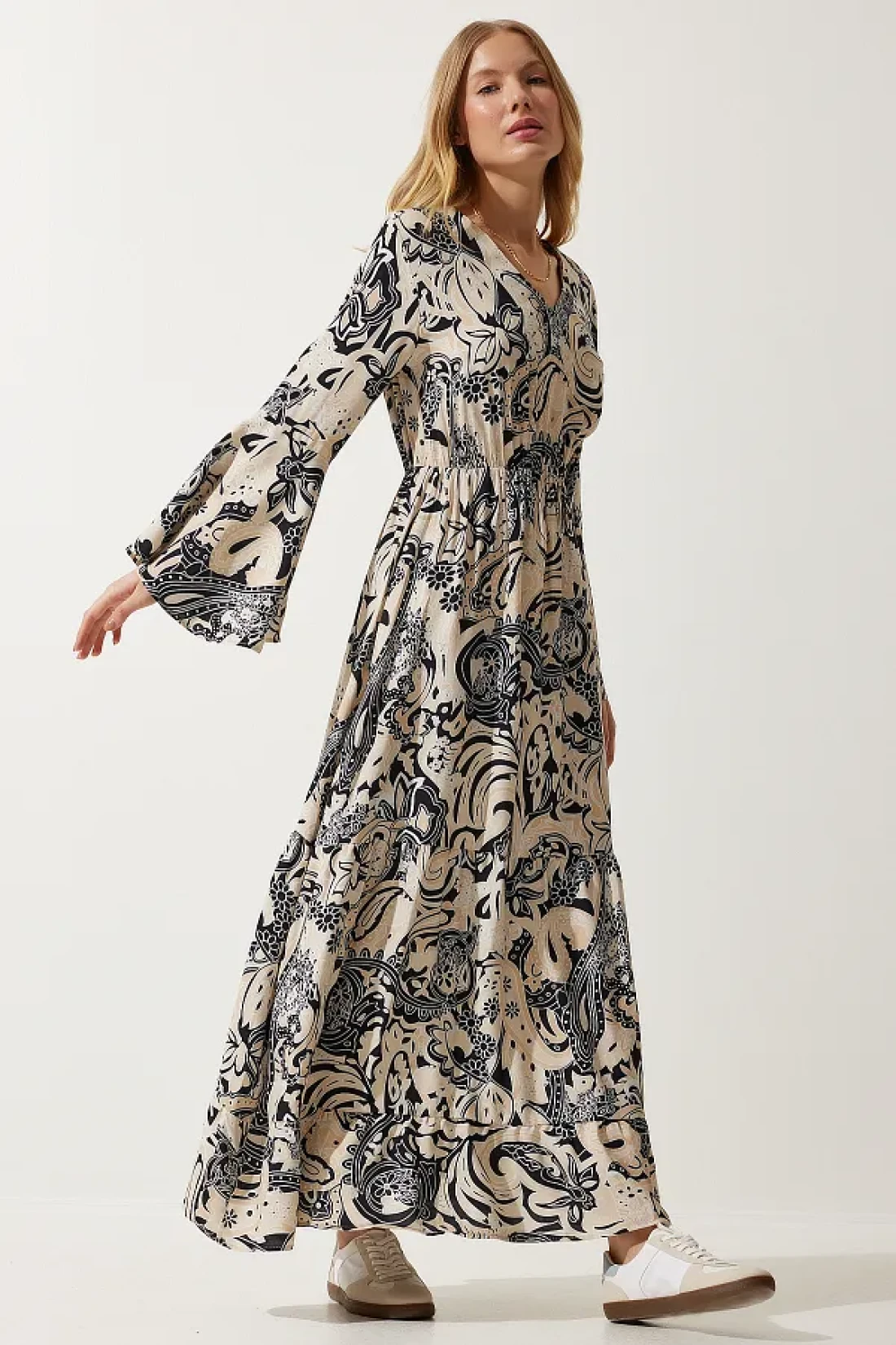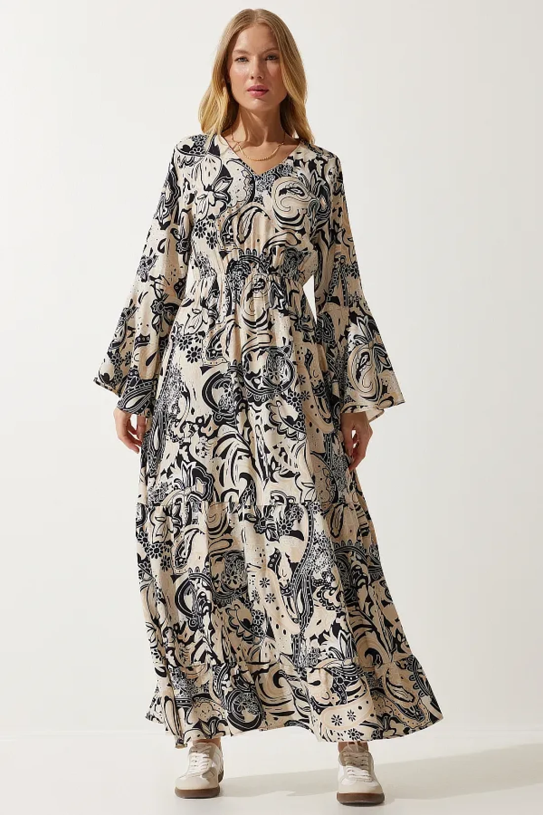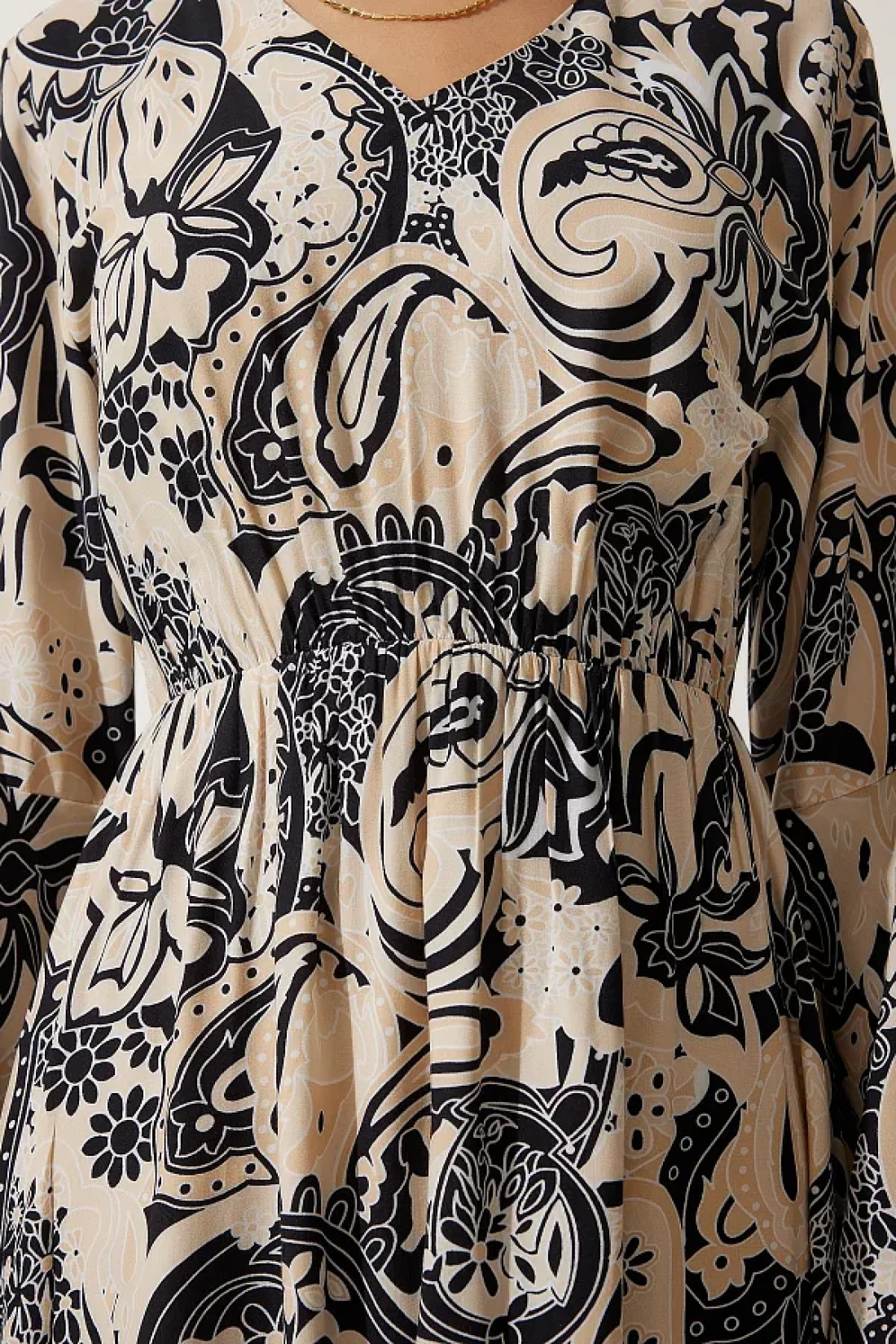 Happiness İstanbul فستان فيسكوز صيفي منقوش باللون البيج للنساء DD01303