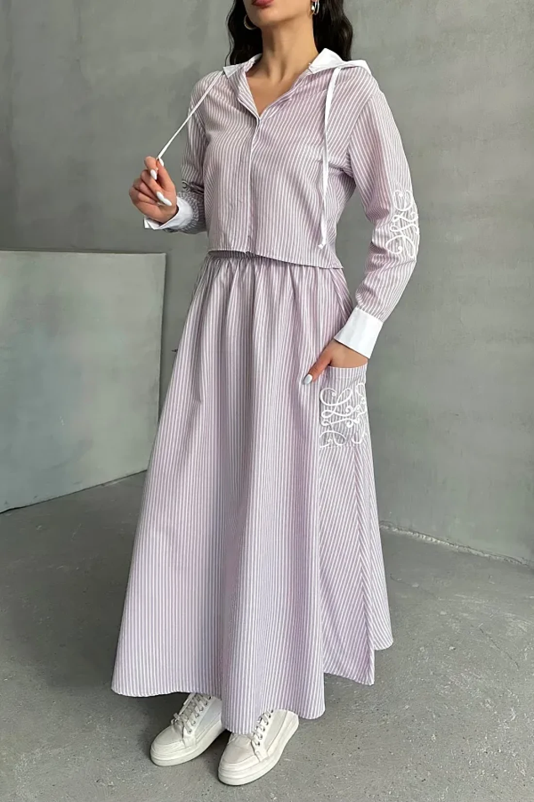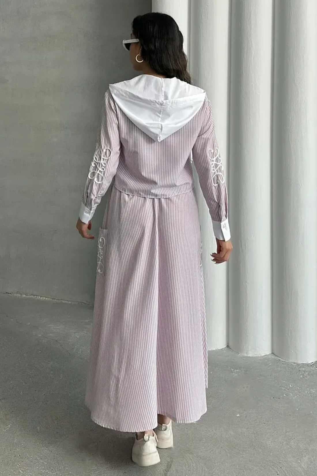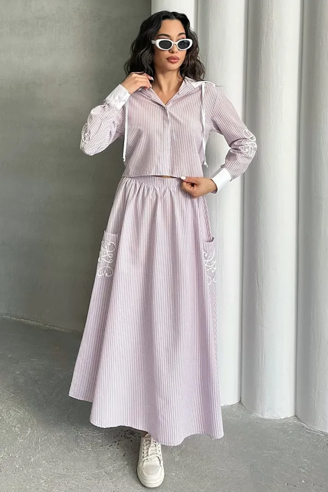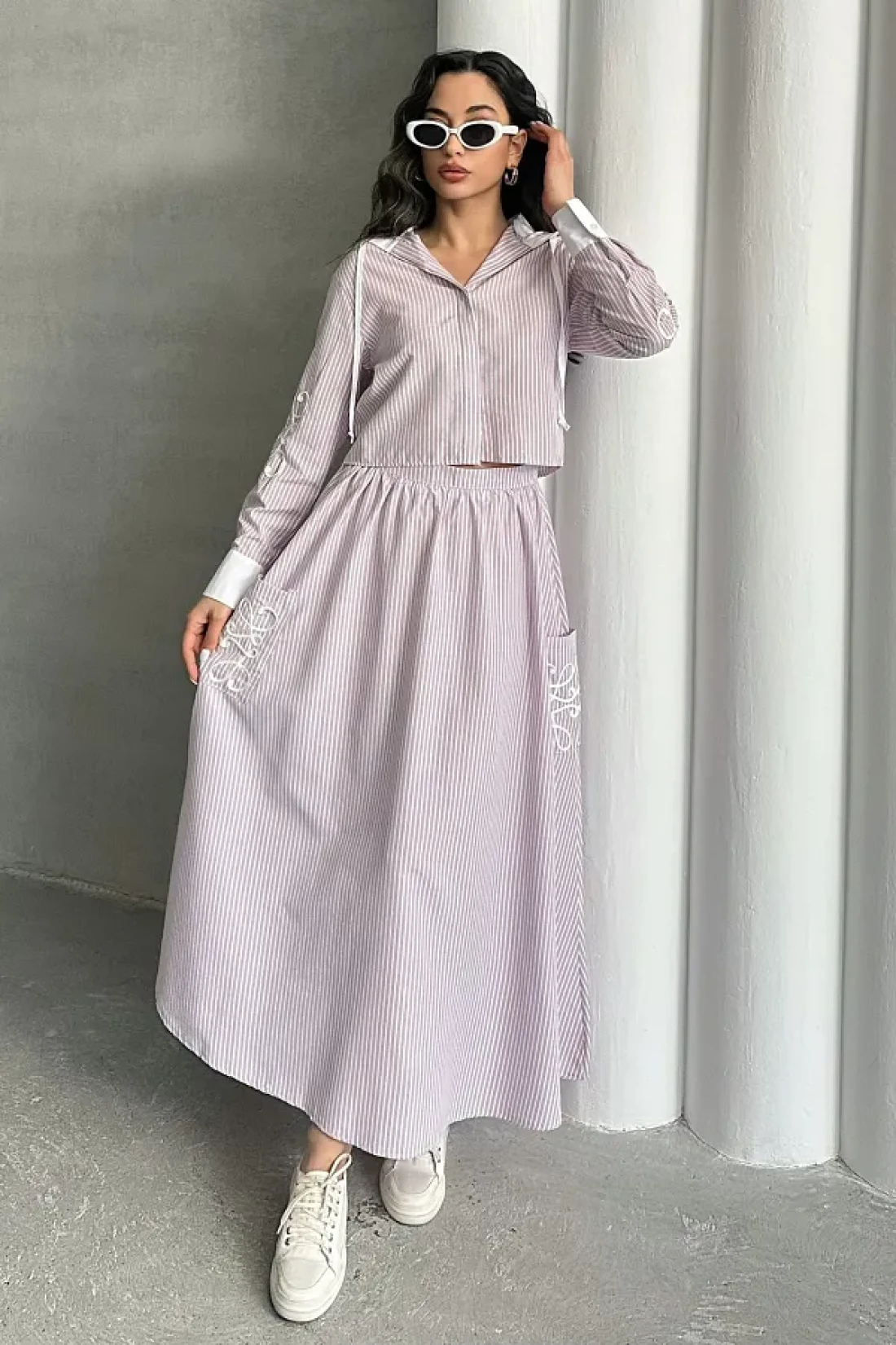 MD trend طقم تنورة قميص وغطاء للرأس مخطط للسيدات مكون من قطعتين