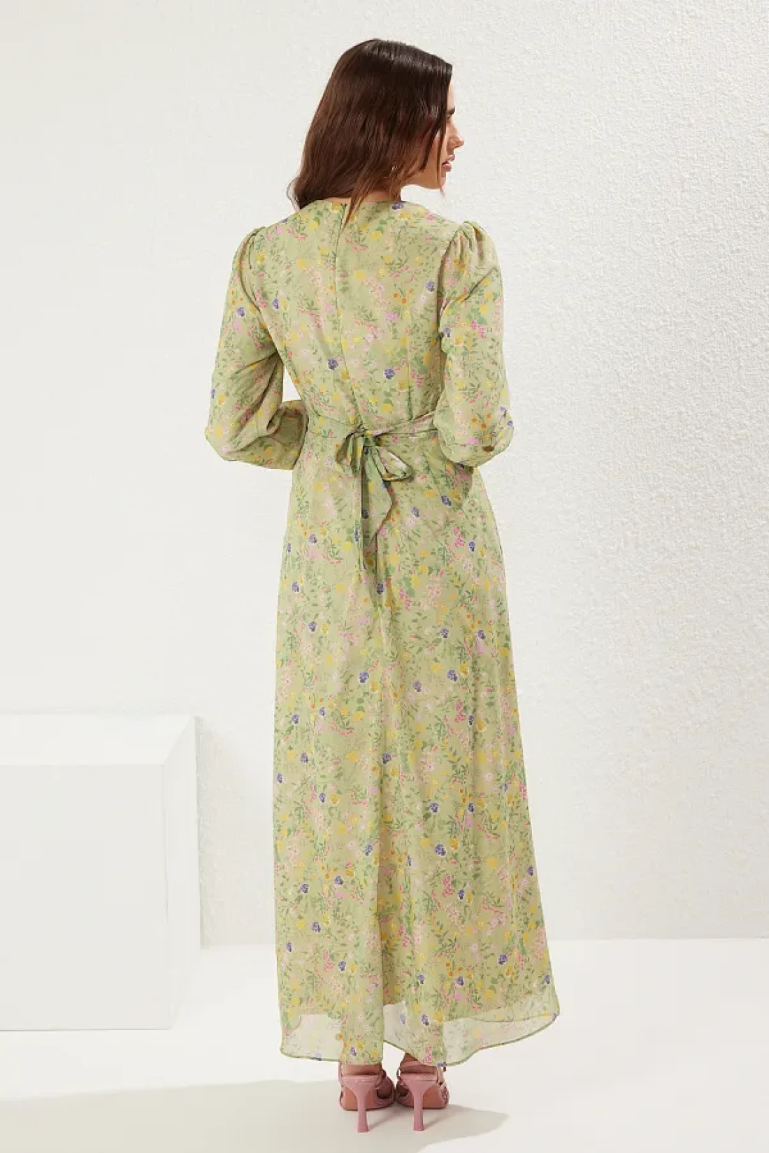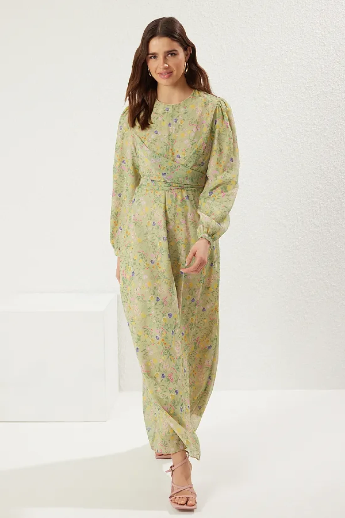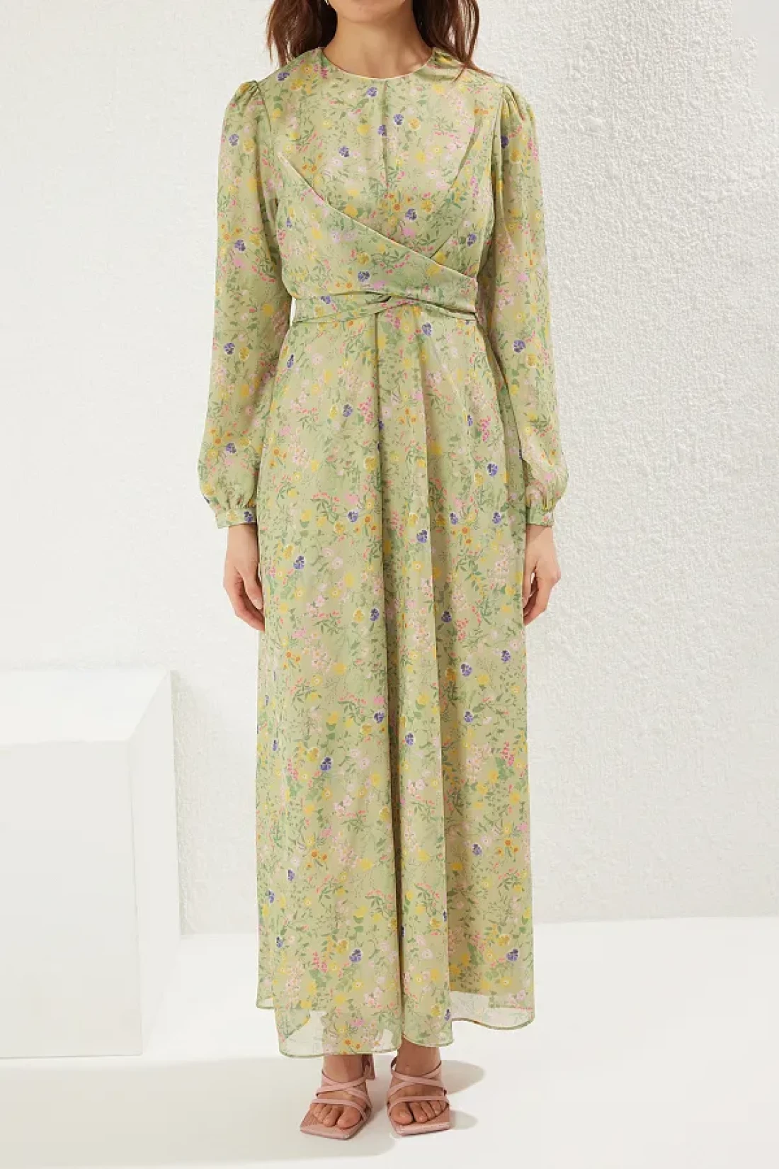 Modest فستان أخضر مزدوج الصدر مع ربطة عنق من الشيفون وبطانة منسوجة من الزهور TCTSS25EB00072