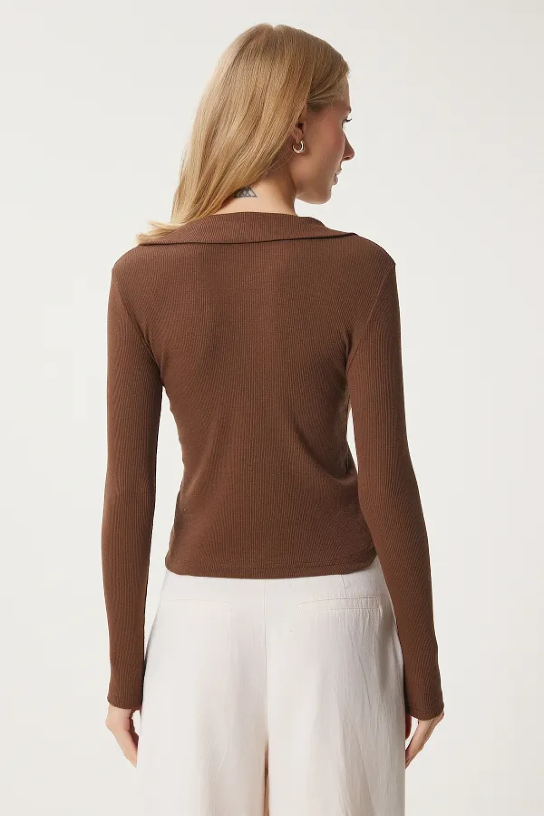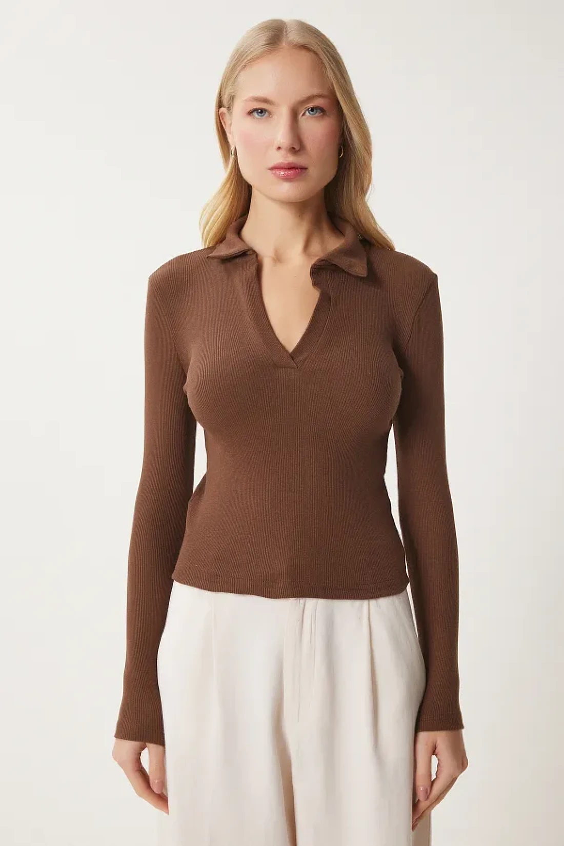 Happiness İstanbul بلوزة محبوكة برقبة بولو بنية اللون للنساء GT00111