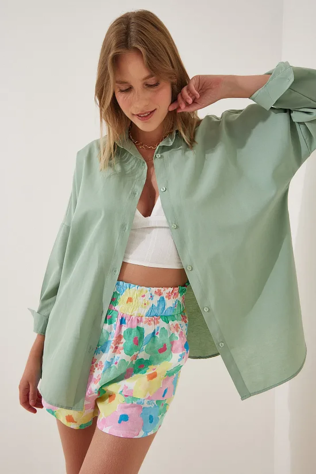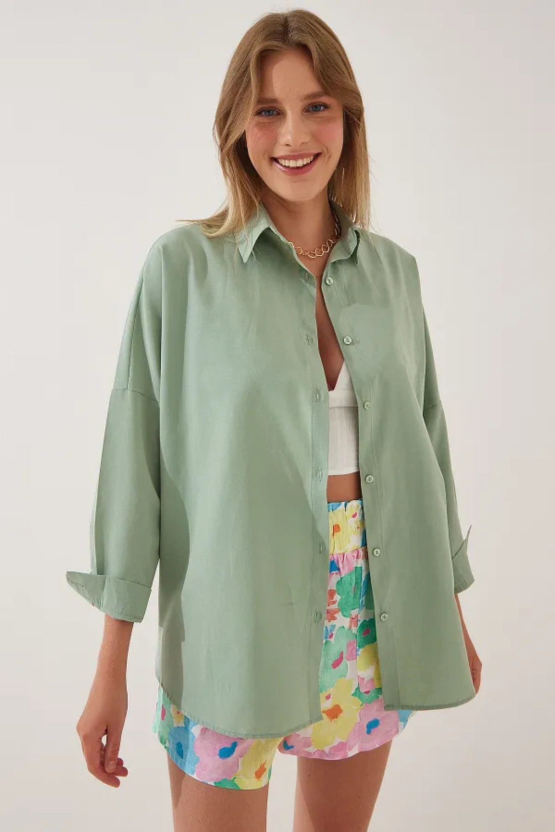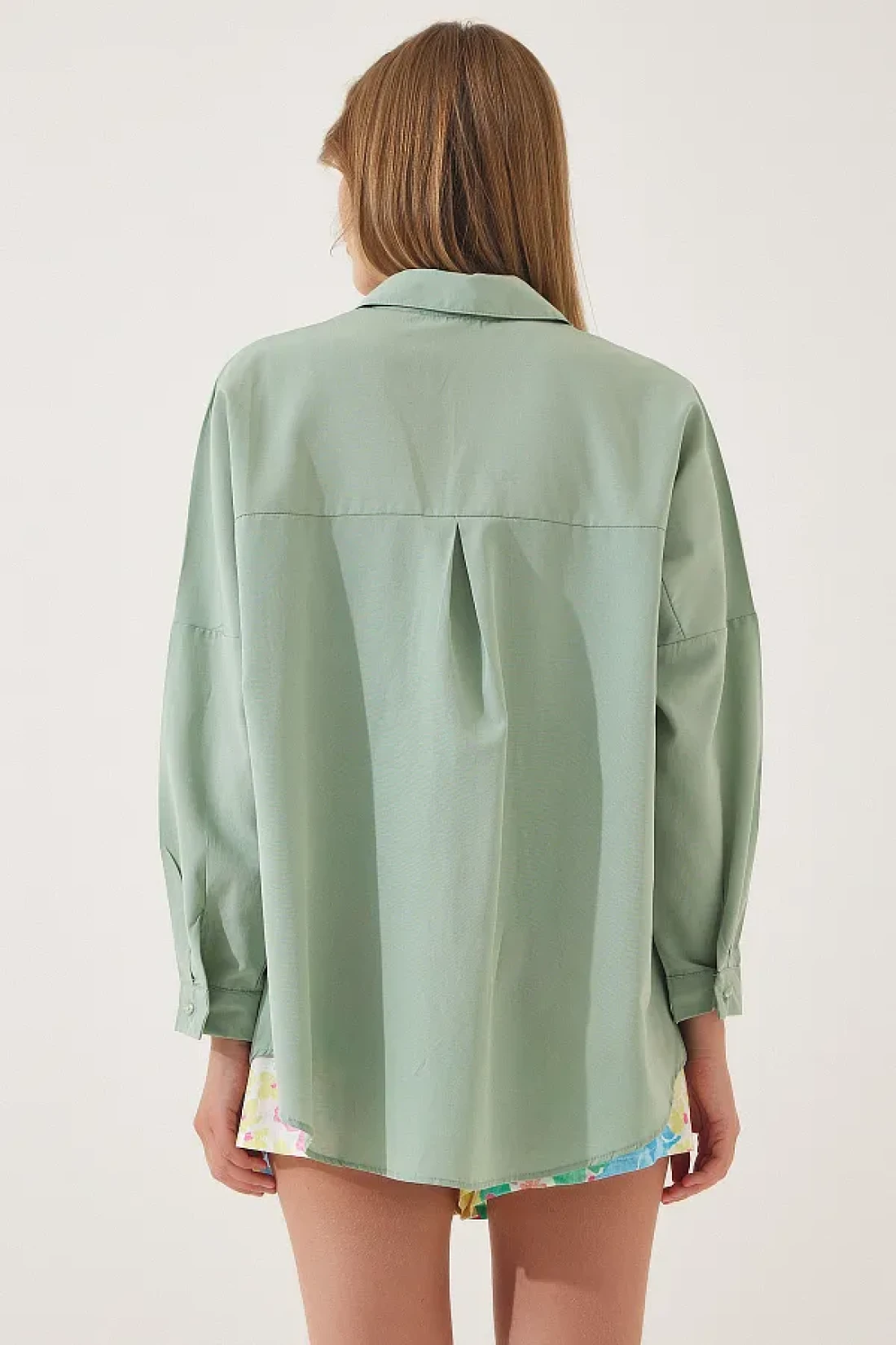 Happiness İstanbul قميص أساسي طويل كبير الحجم للنساء باللون الأخضر الفاتح DD00842