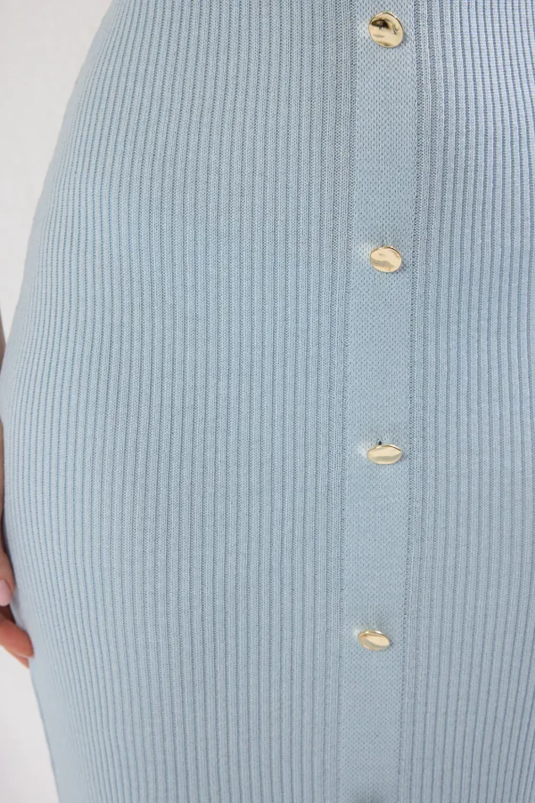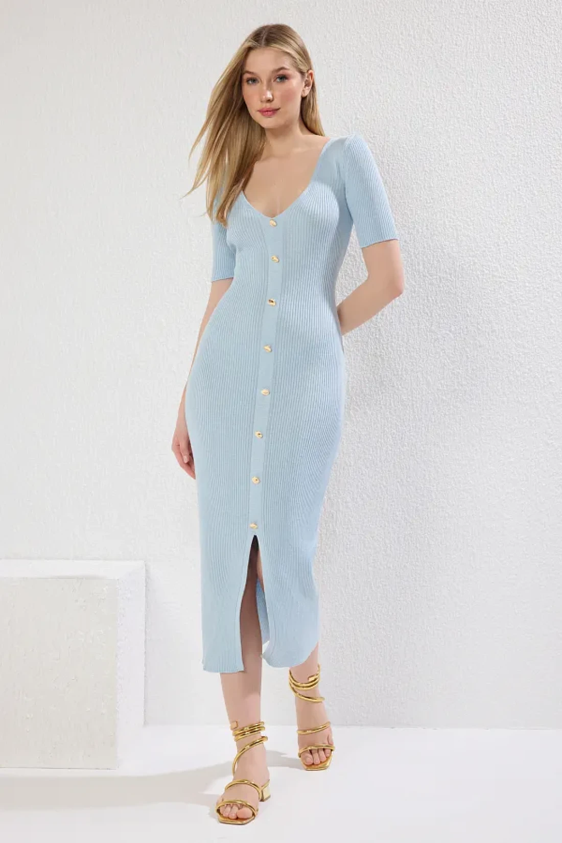 Collection فستان تريكو أزرق متوسط الطول بحزام TWOSS25EL00307
