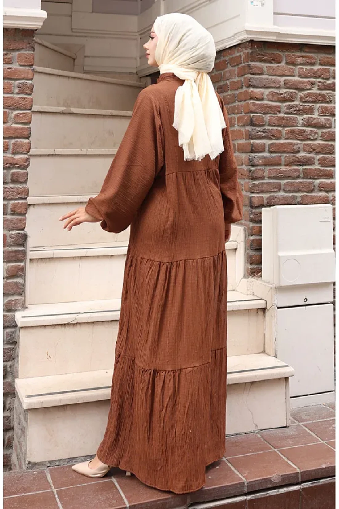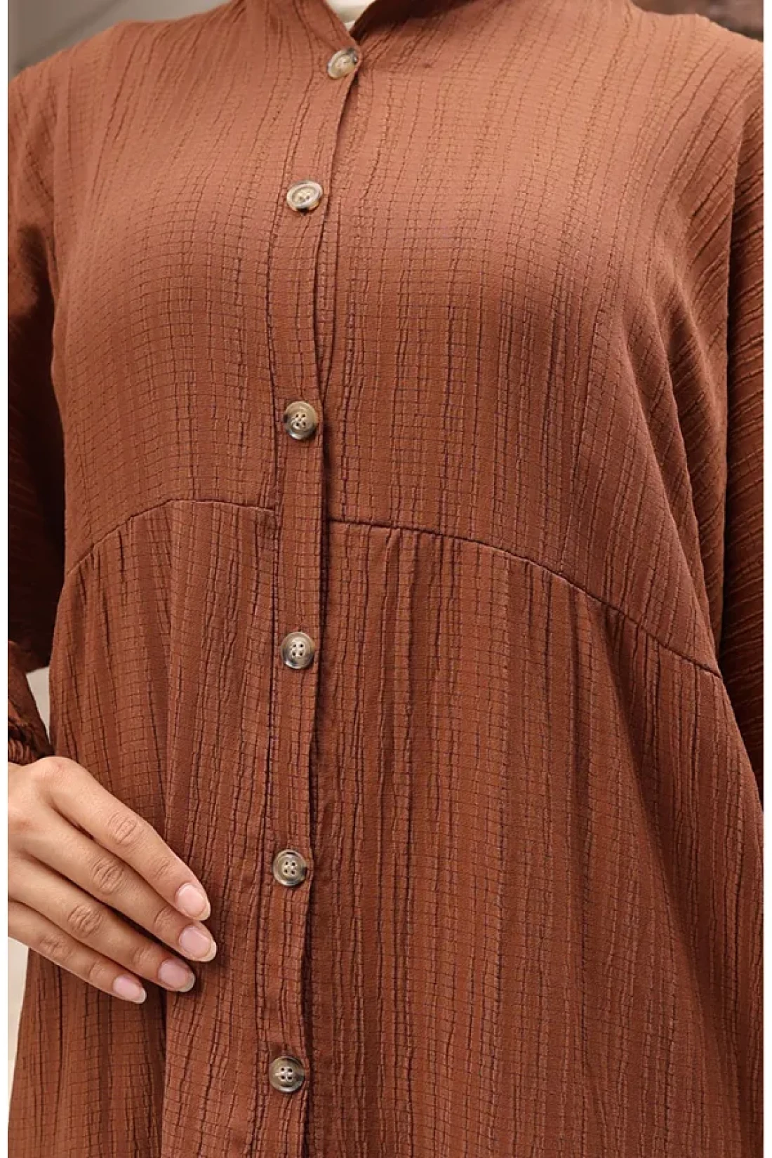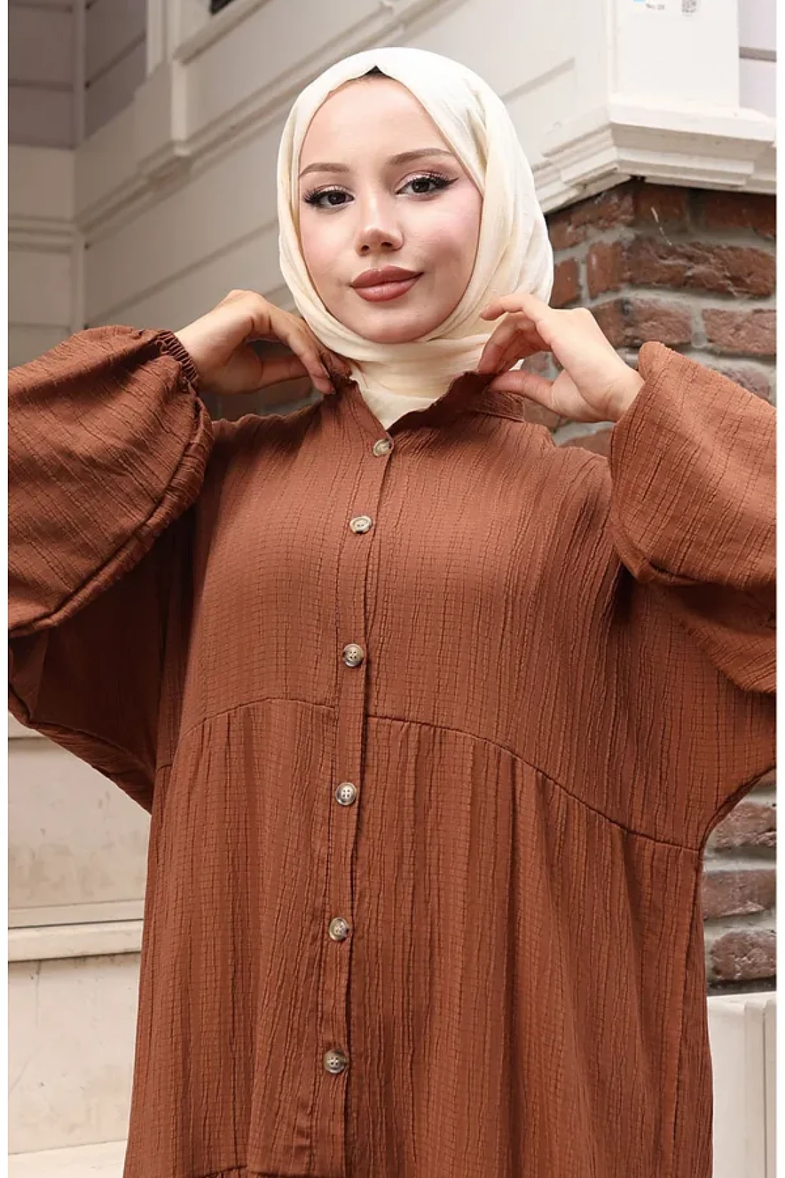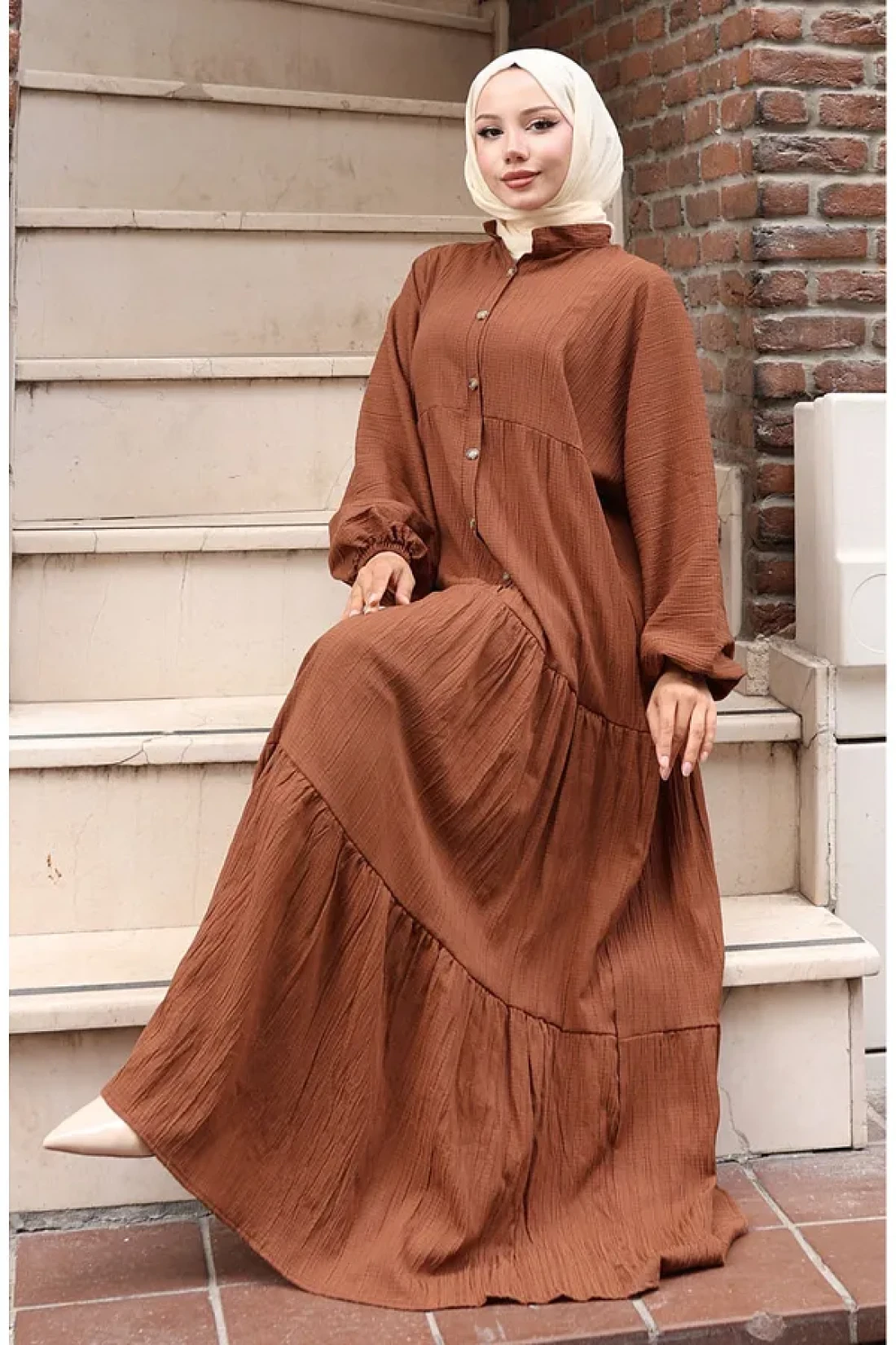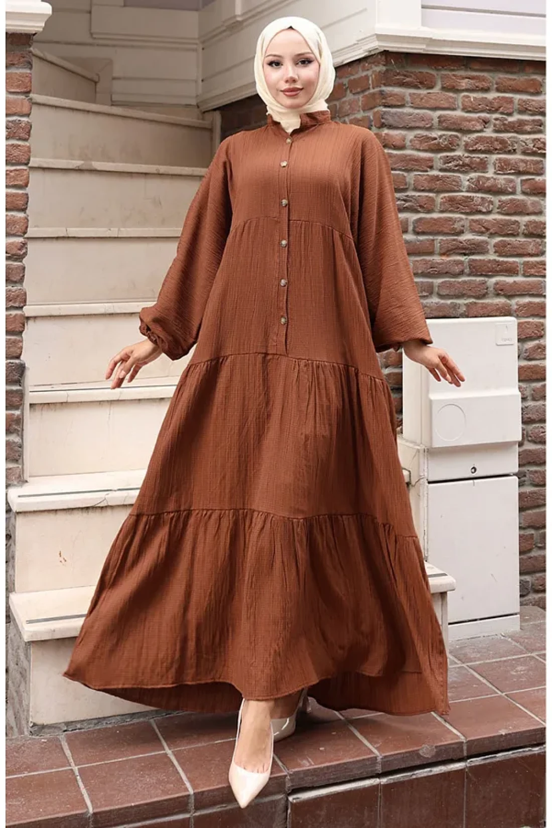 sefamerve فستان مطاطي بأكمام نصف زر 2074-01 أسمر