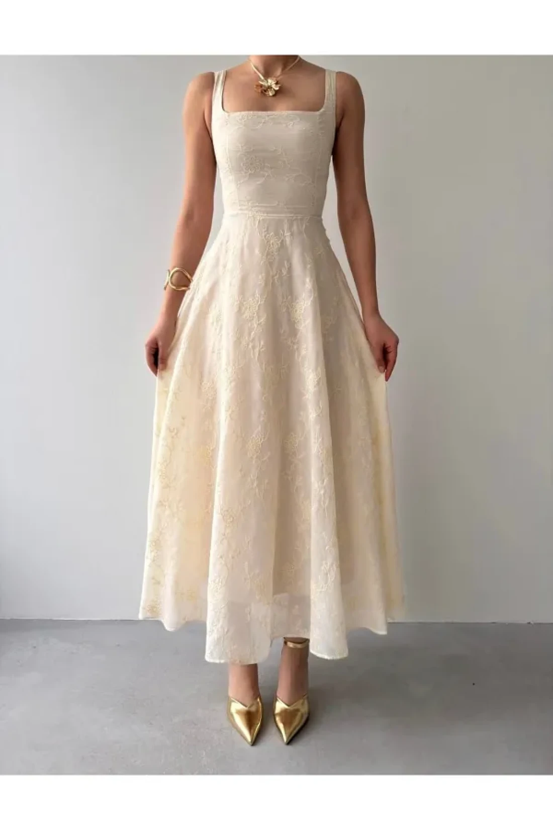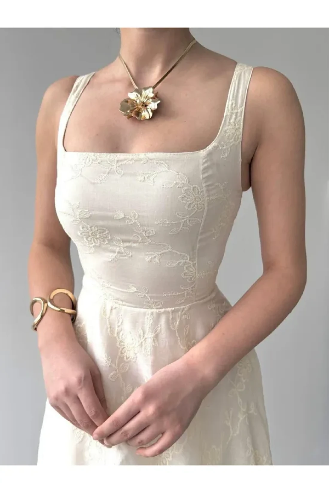 Afiş Butik فستان كتان مطرز بحزام سميك باللون البيج