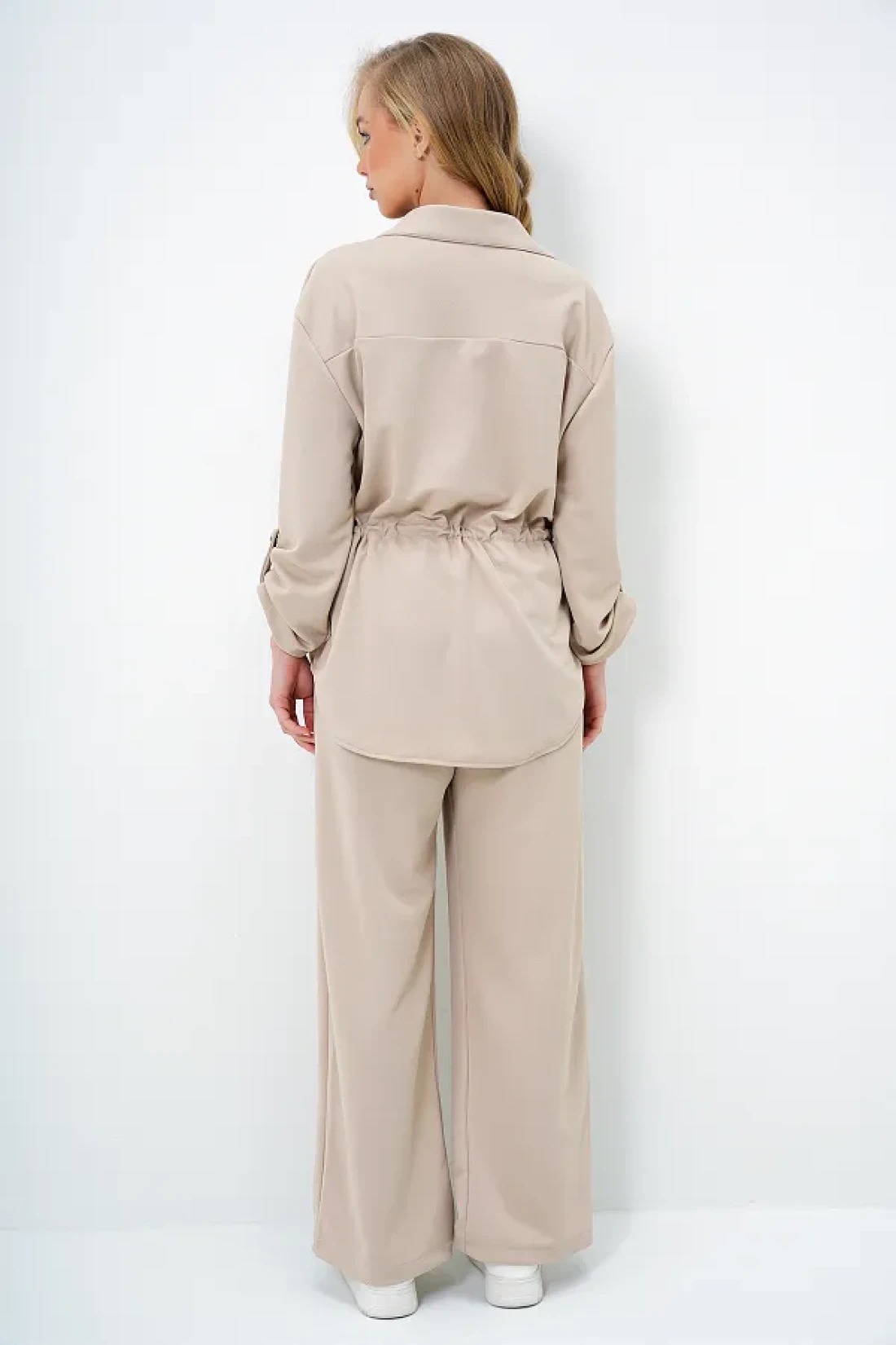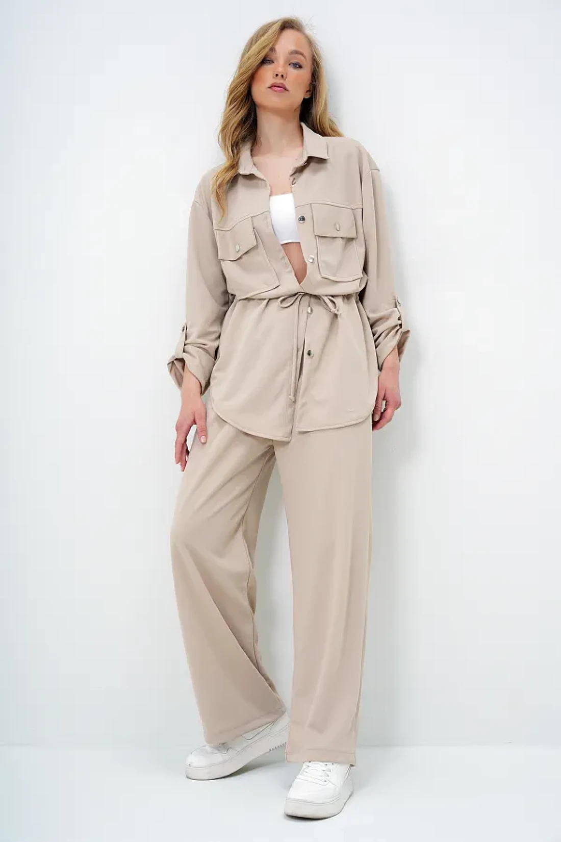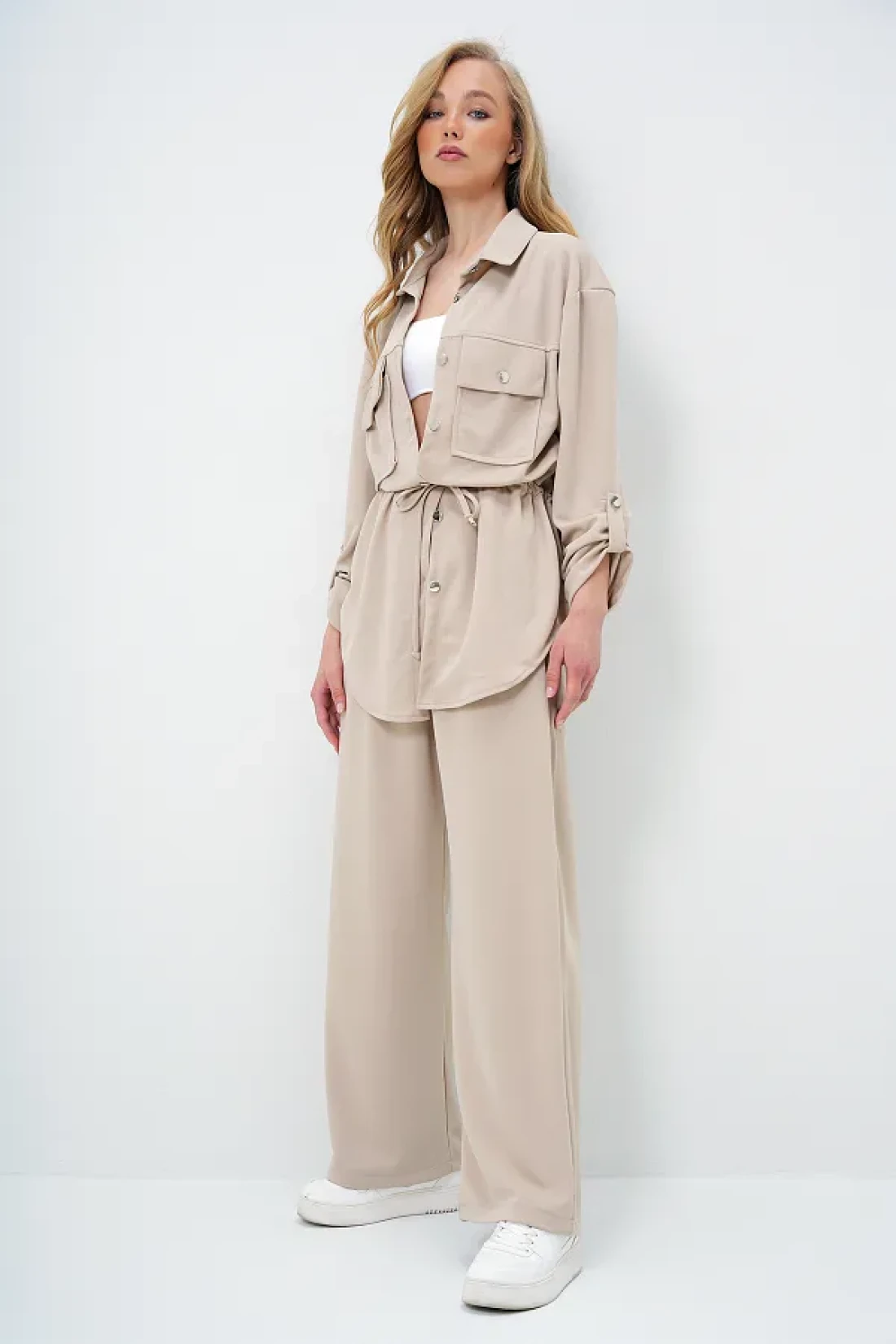 Trend Alaçatı Stili سترة سفاري بجيب مزدوج باللون البيج وبنطلون واسع الساق من الكريب مع طقم علوي بخصر مطاطي ALC-X14086