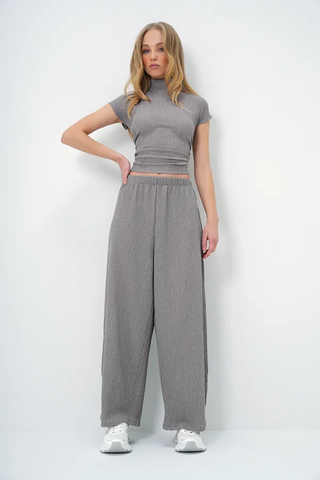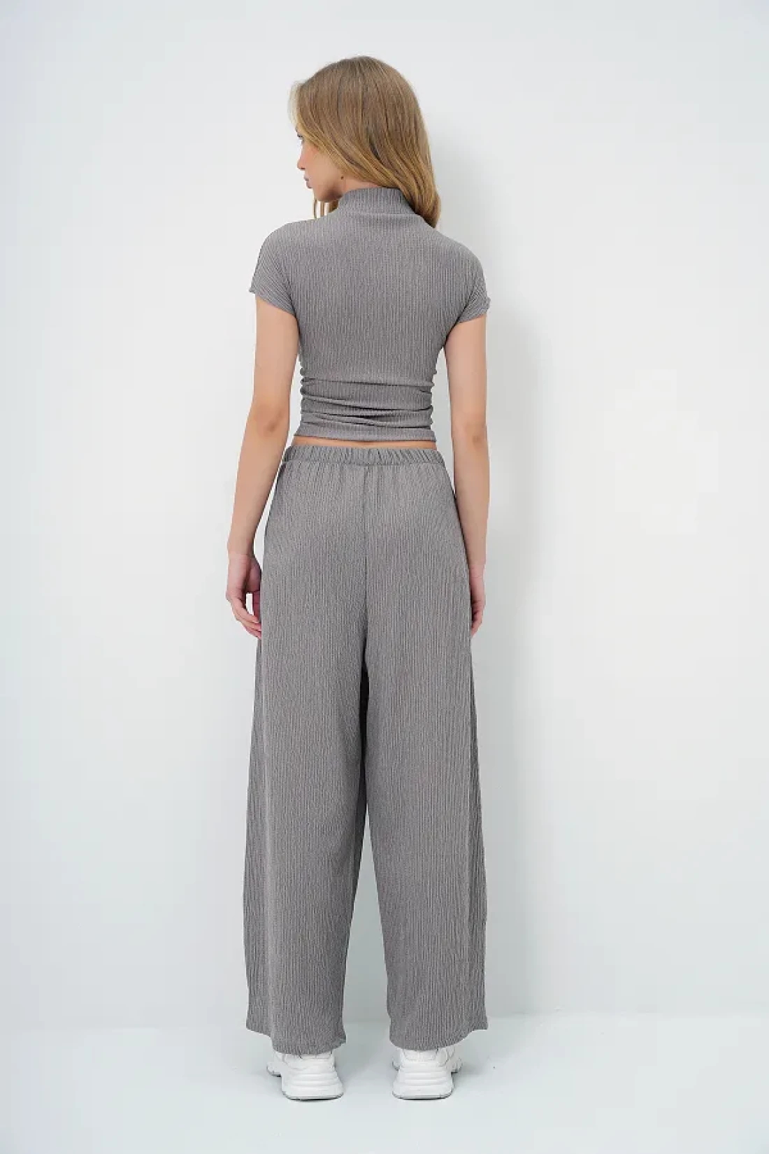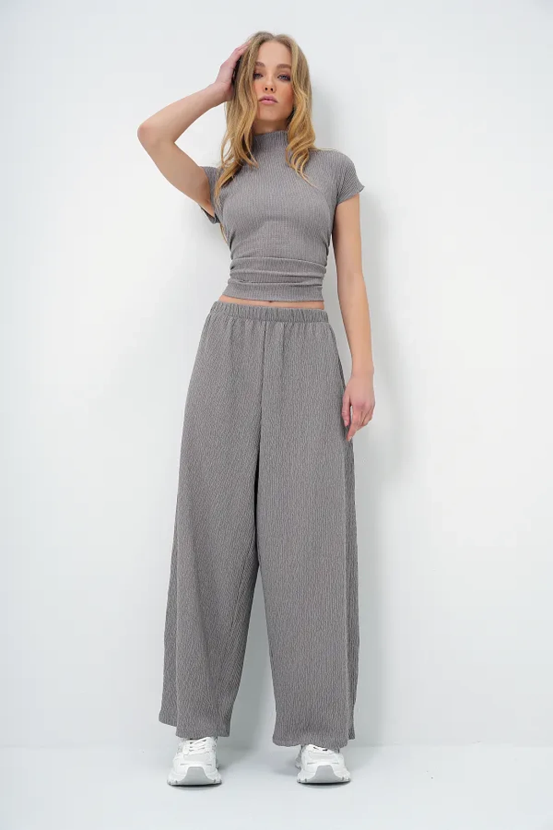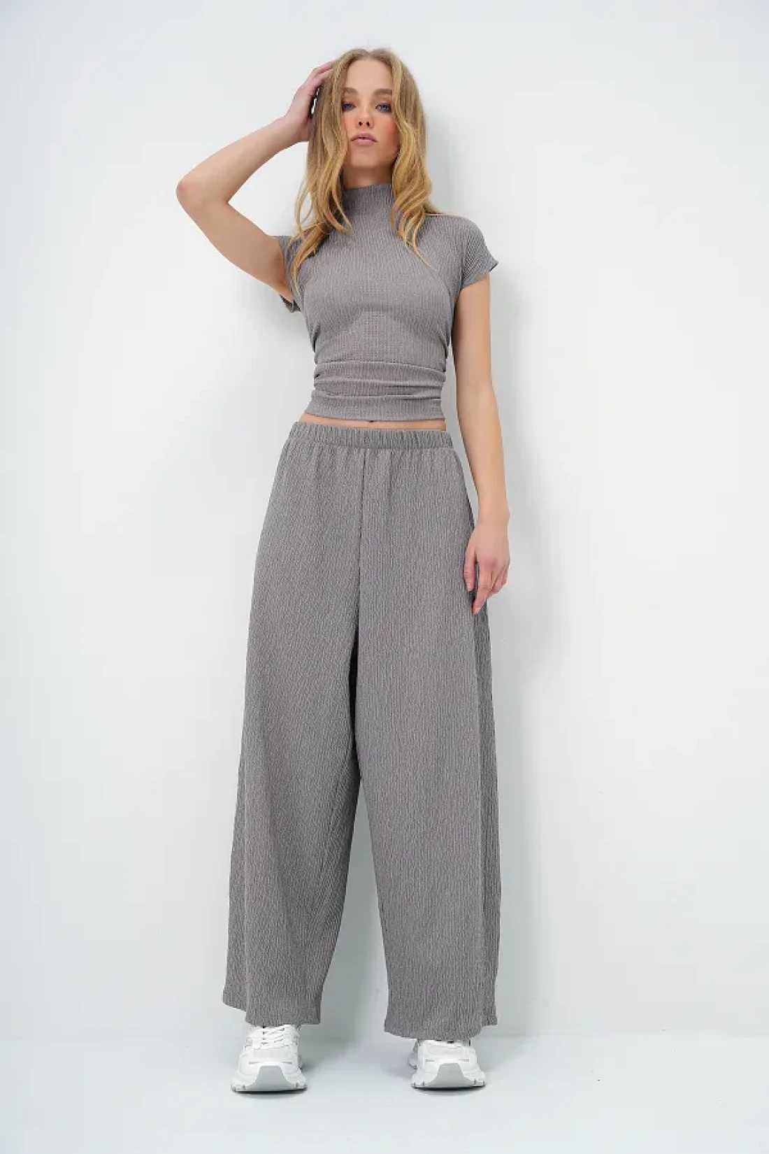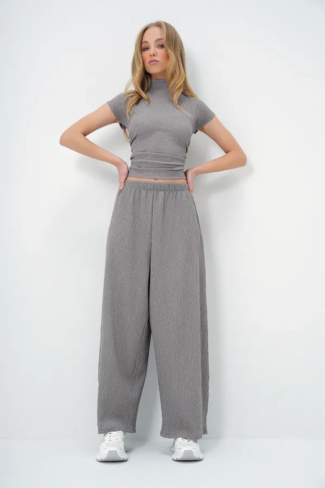 Trend Alaçatı Stili طقم بلوزة قصيرة ذات ياقة واقفة باللون الرمادي وسروال واسع الساق - ALC-X13411