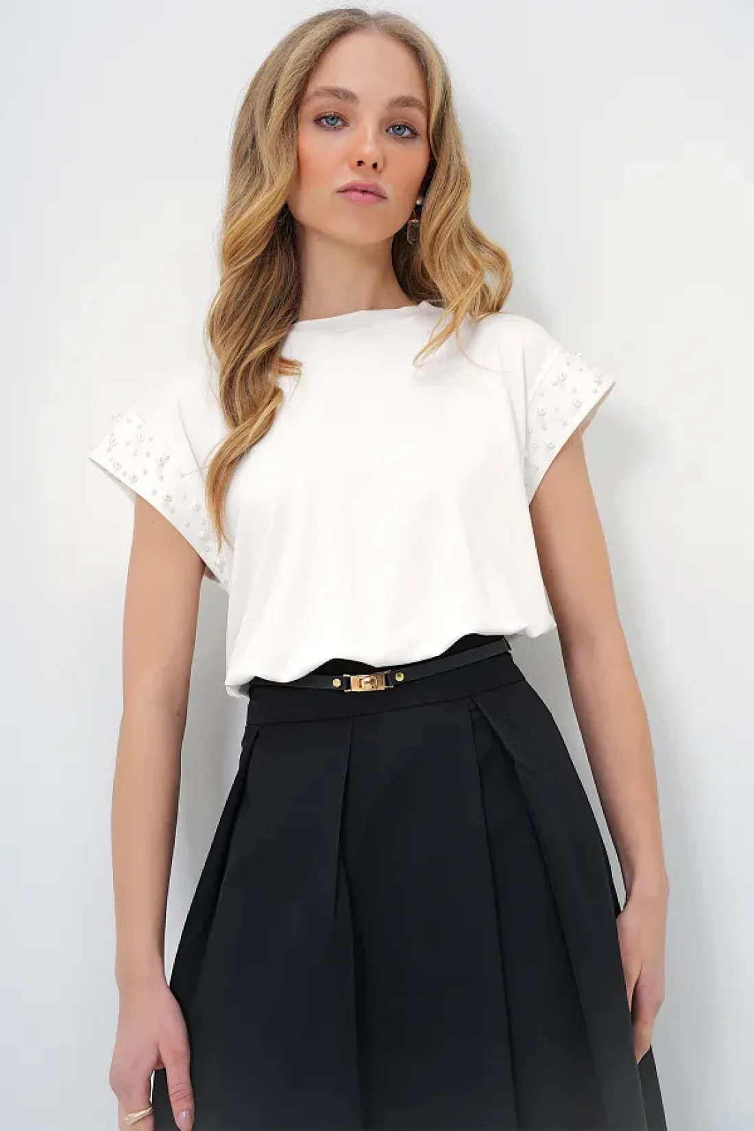 Trend Alaçatı Stili بلوزة نسائية بيضاء بياقة دائرية ولؤلؤة بدون أكمام ALC-X13522