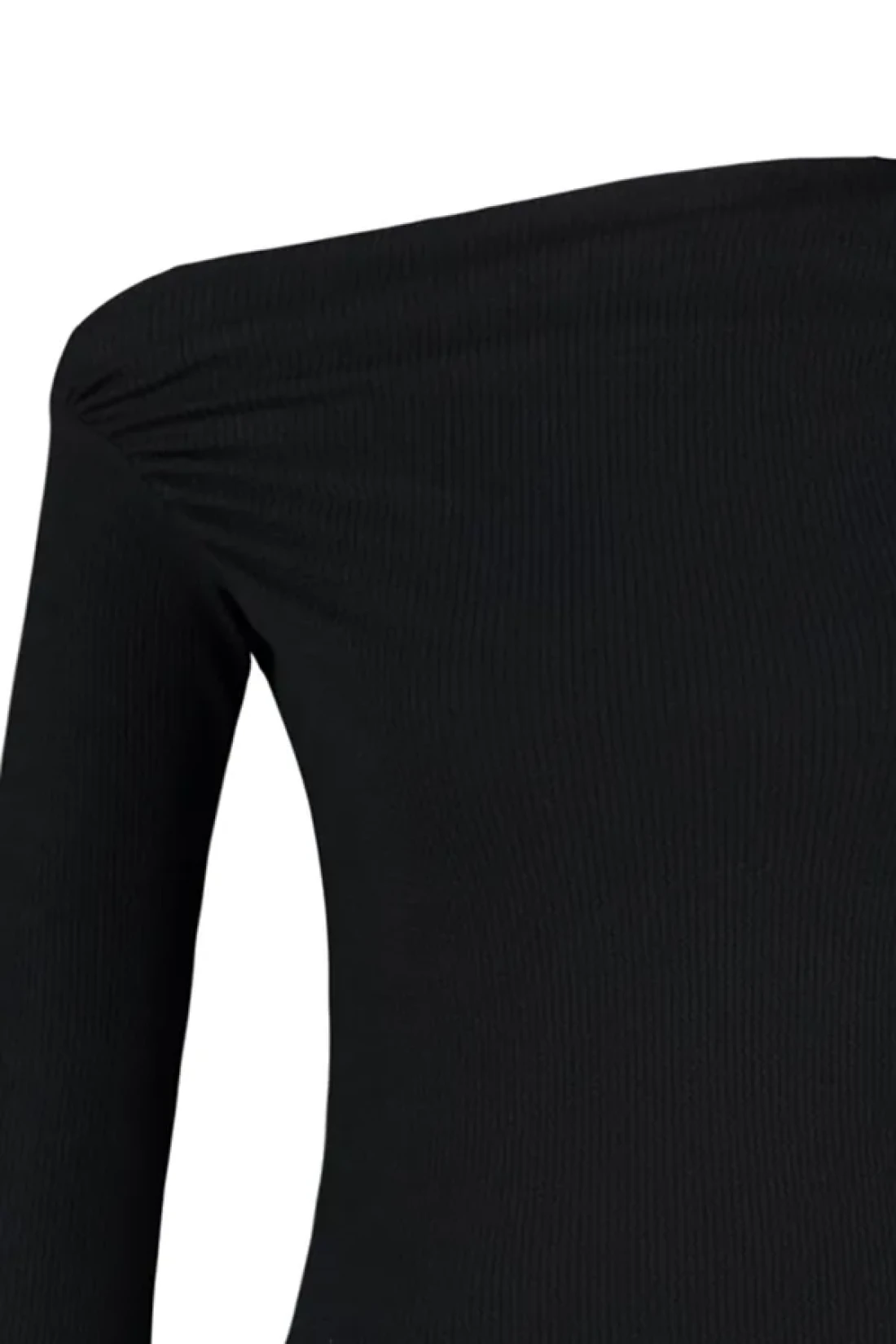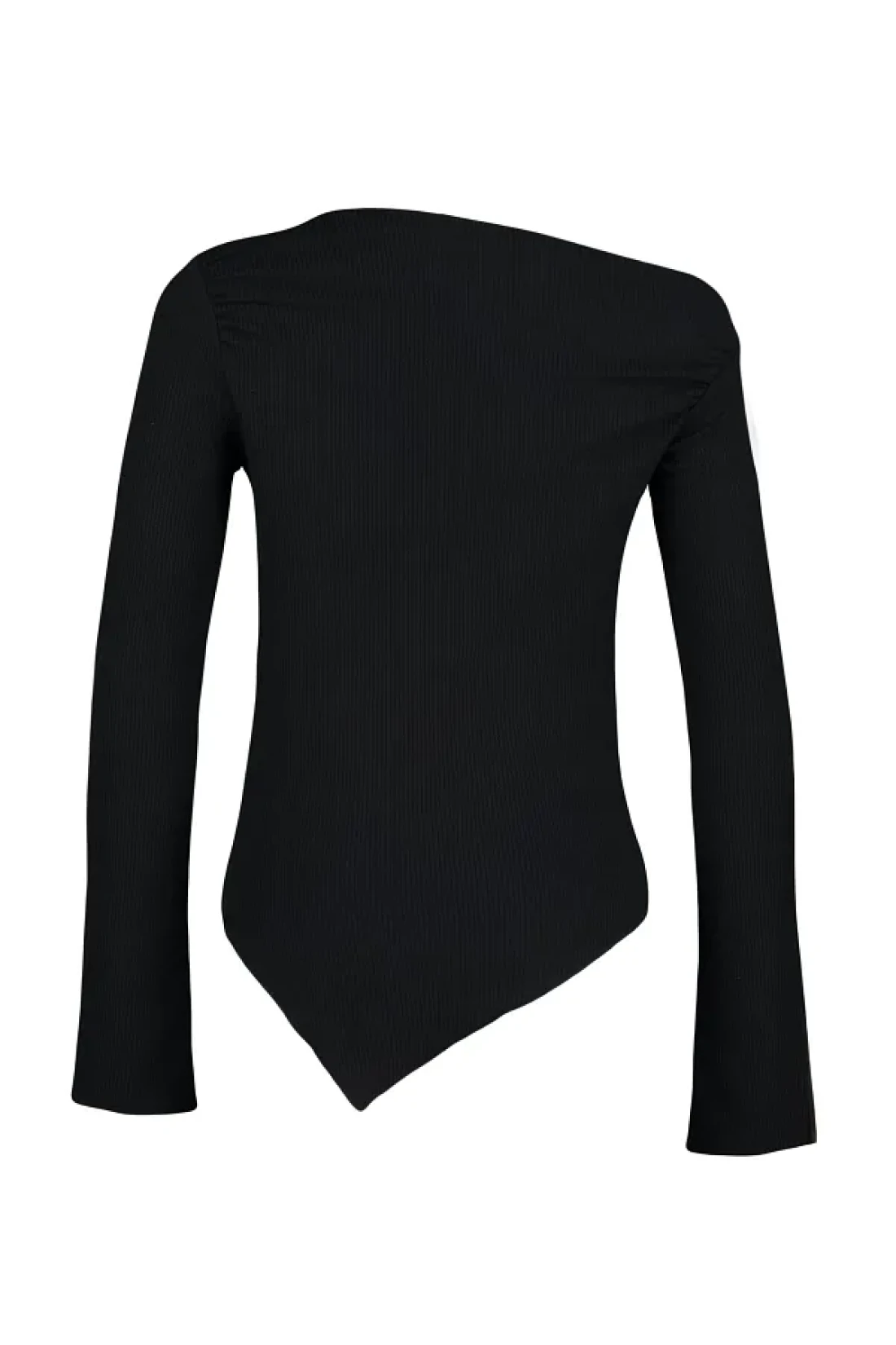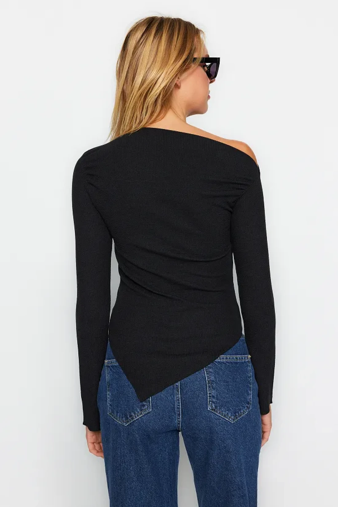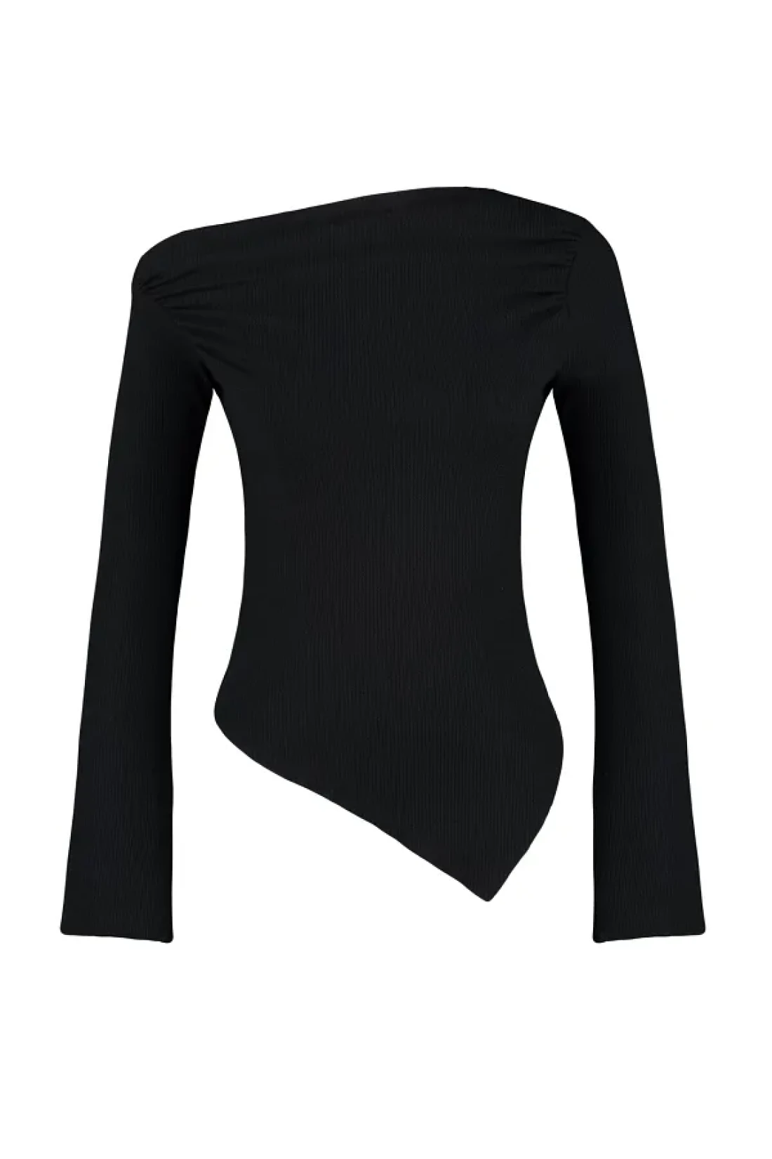 Collection أسود ثنيات قارب الرقبة غير المتكافئة بسط كم طويل محبوك بلوزة TWOAW24BZ00393