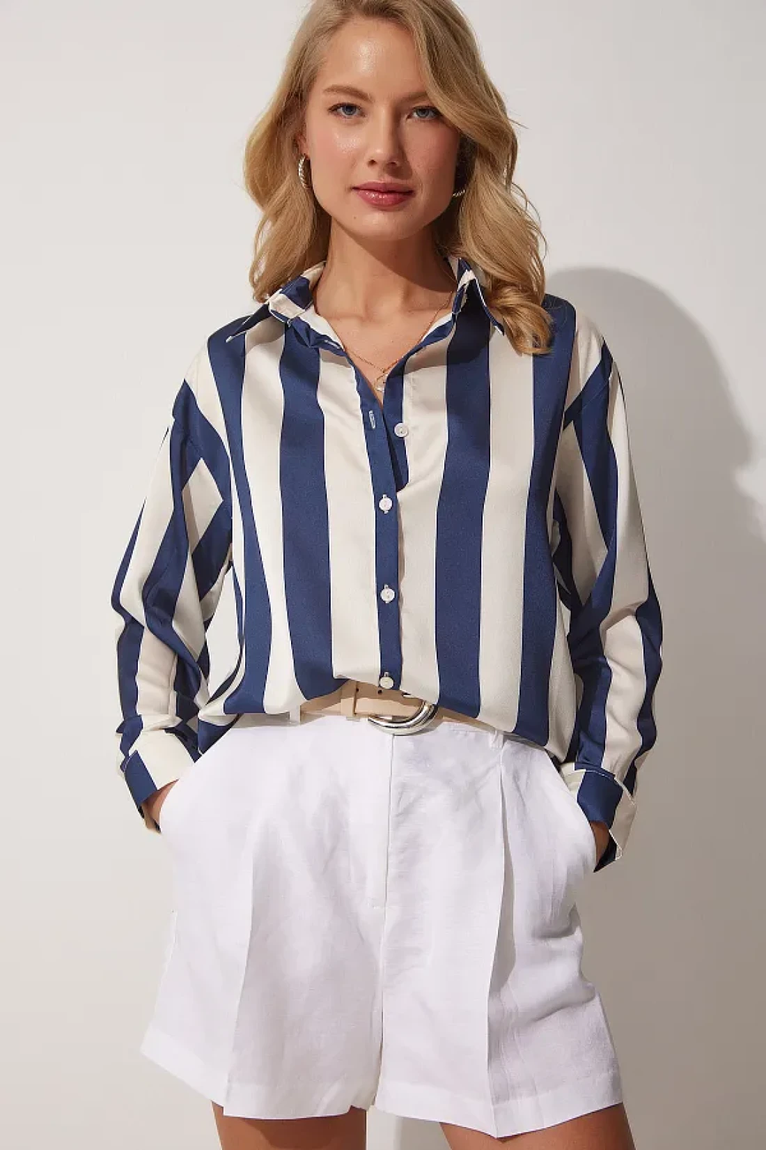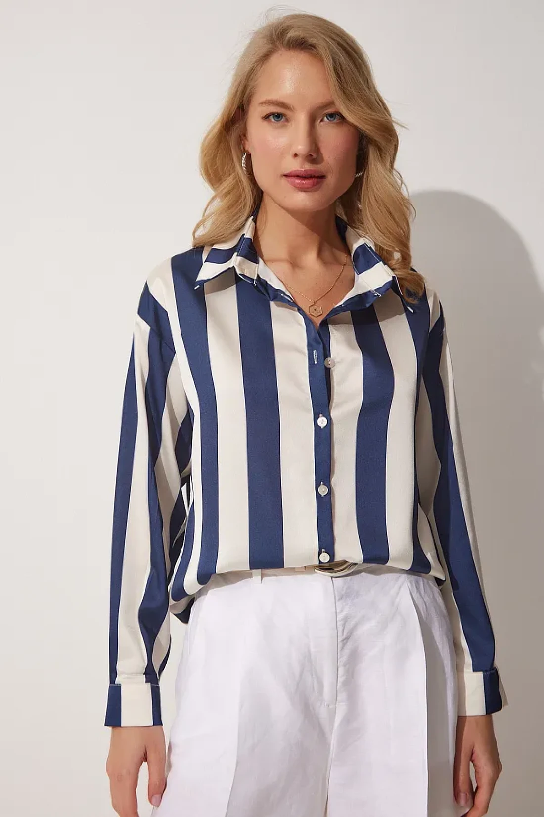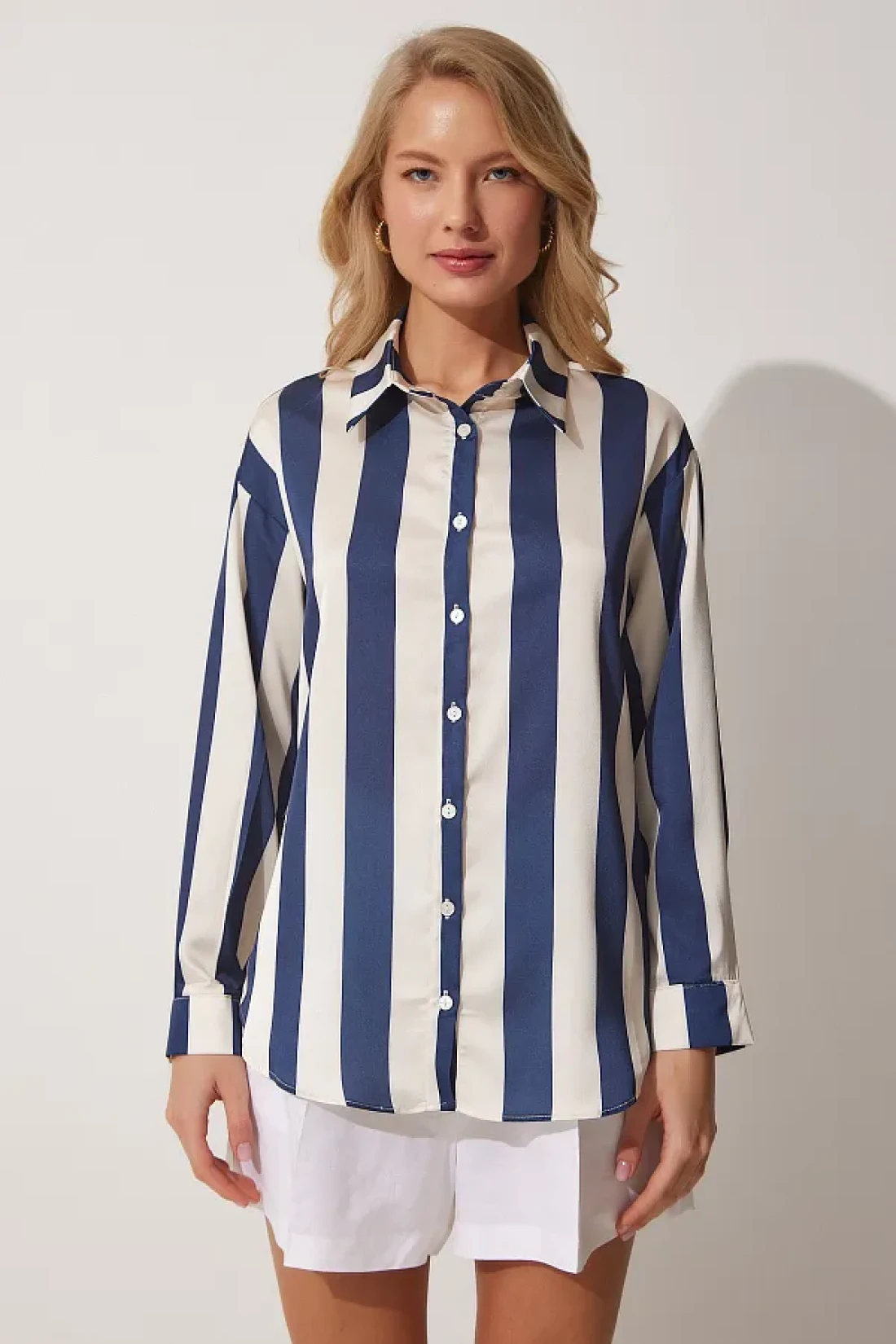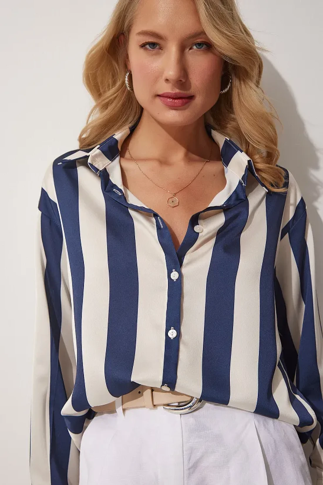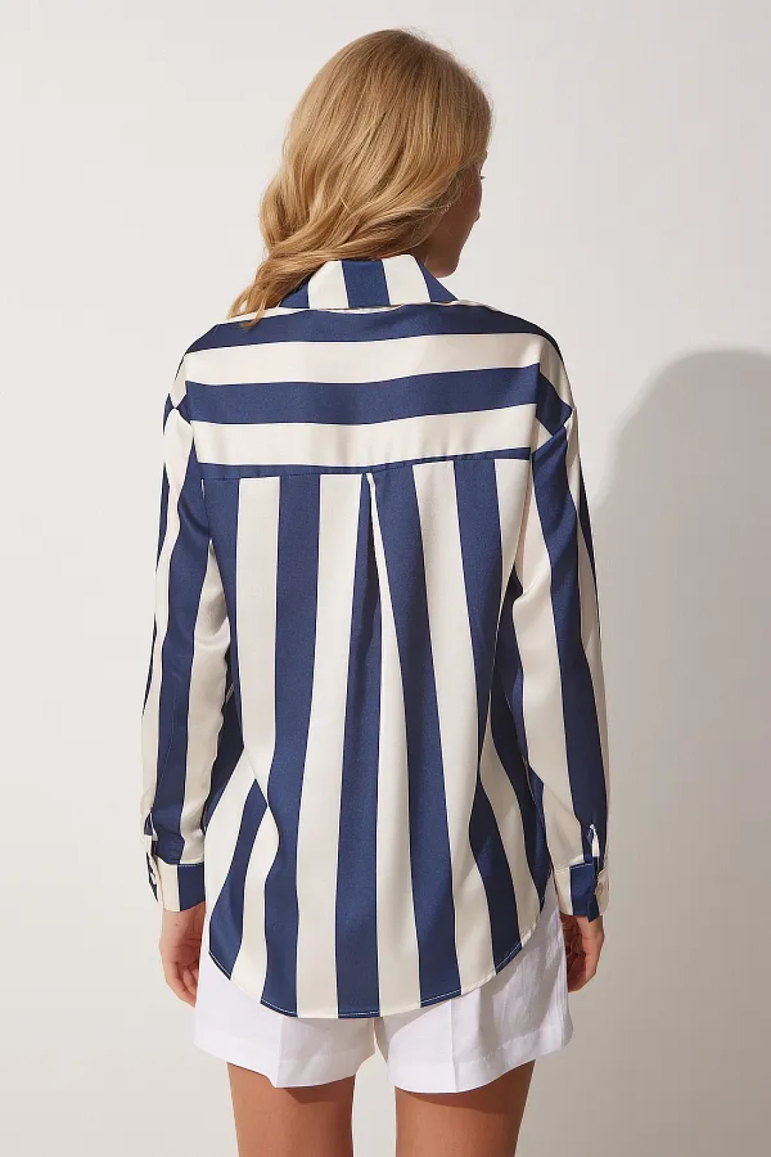 Happiness İstanbul قميص نسائي من الساتان مخطط باللون الأزرق الداكن DD01206
