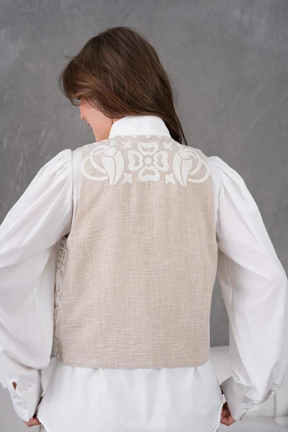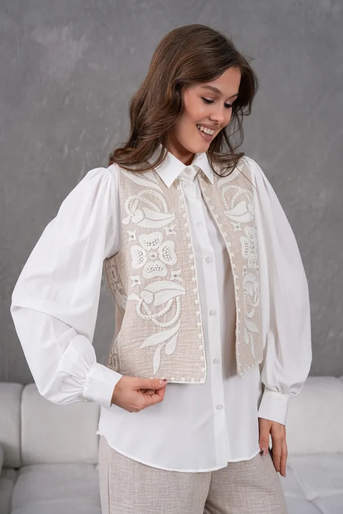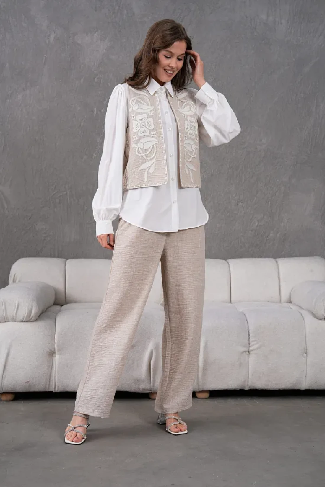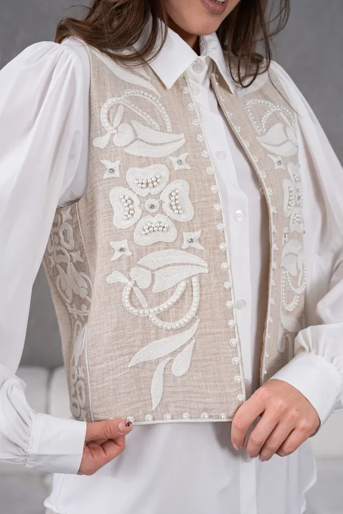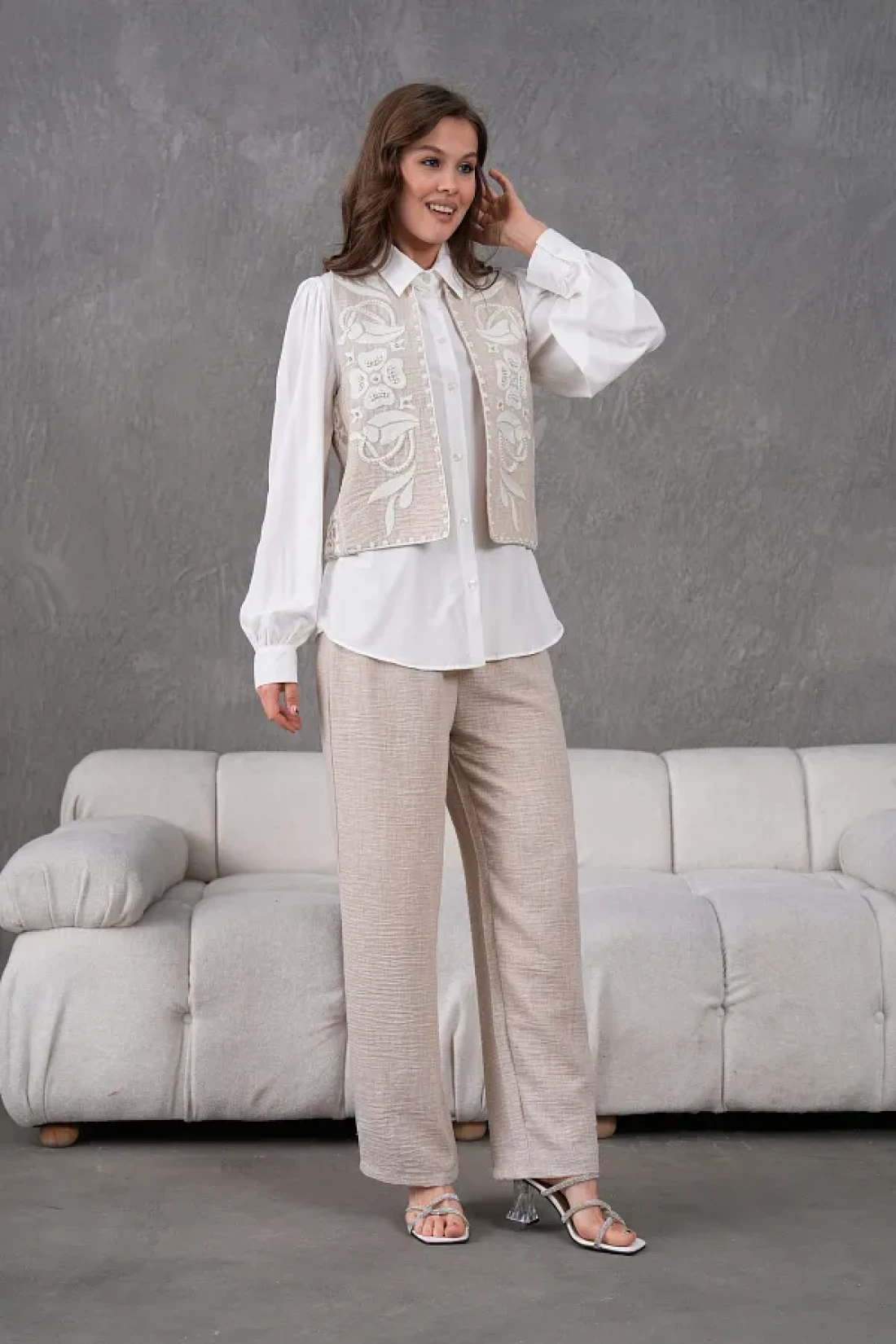 Miss Allos طقم سترة وبنطلون من الكتان للسيدات مع تطريز أمامي وخلفي باللؤلؤ والحجر