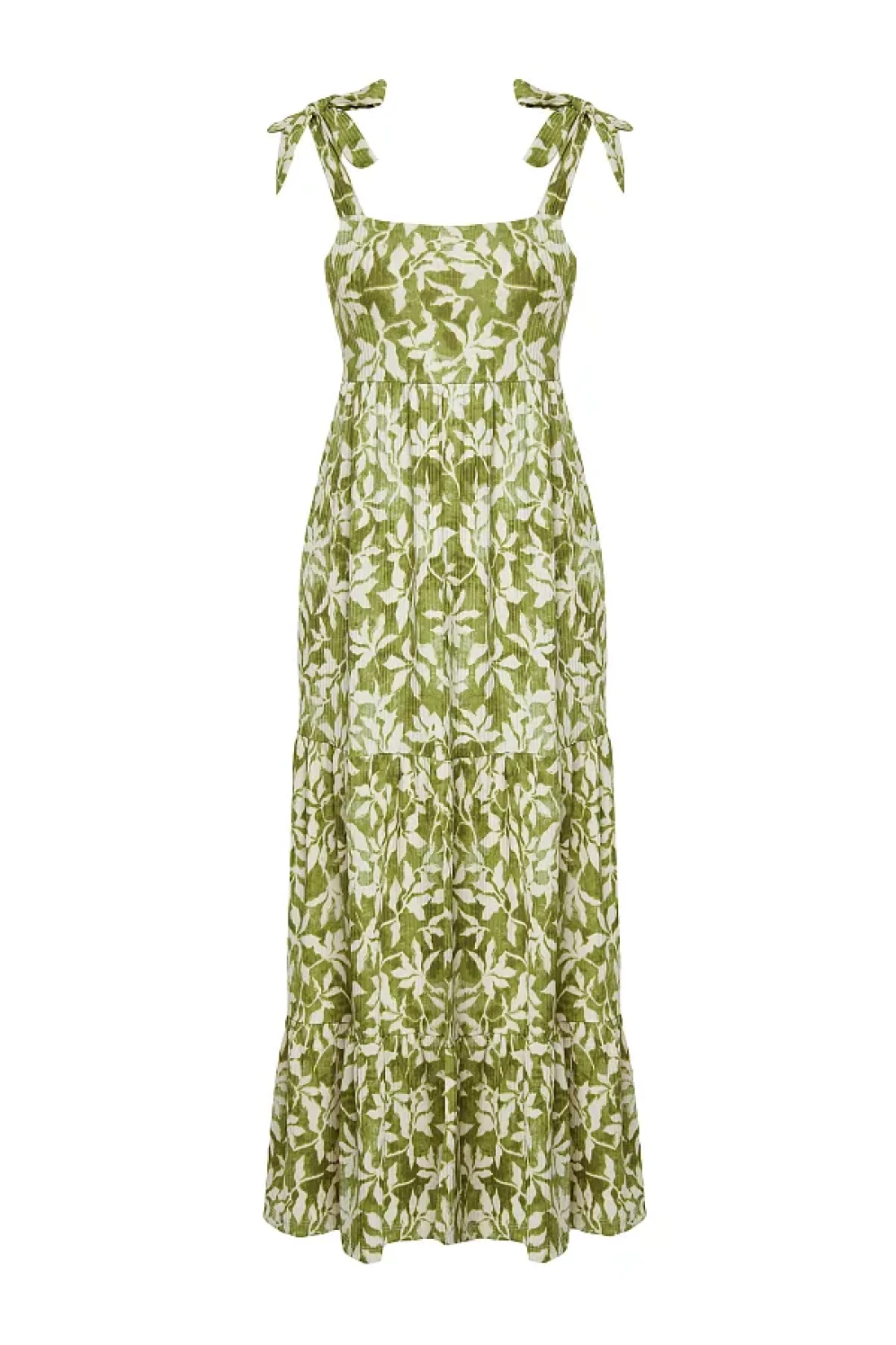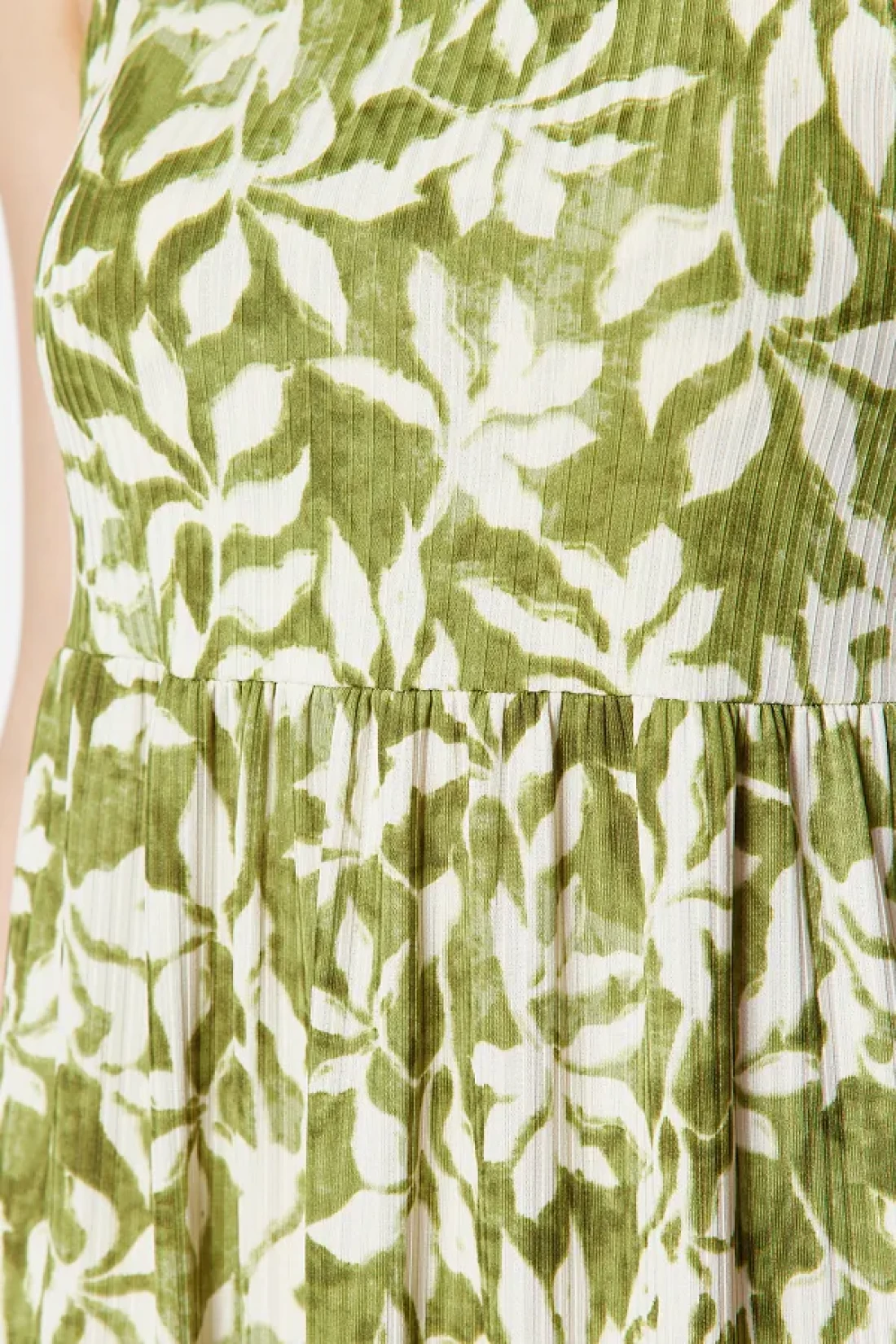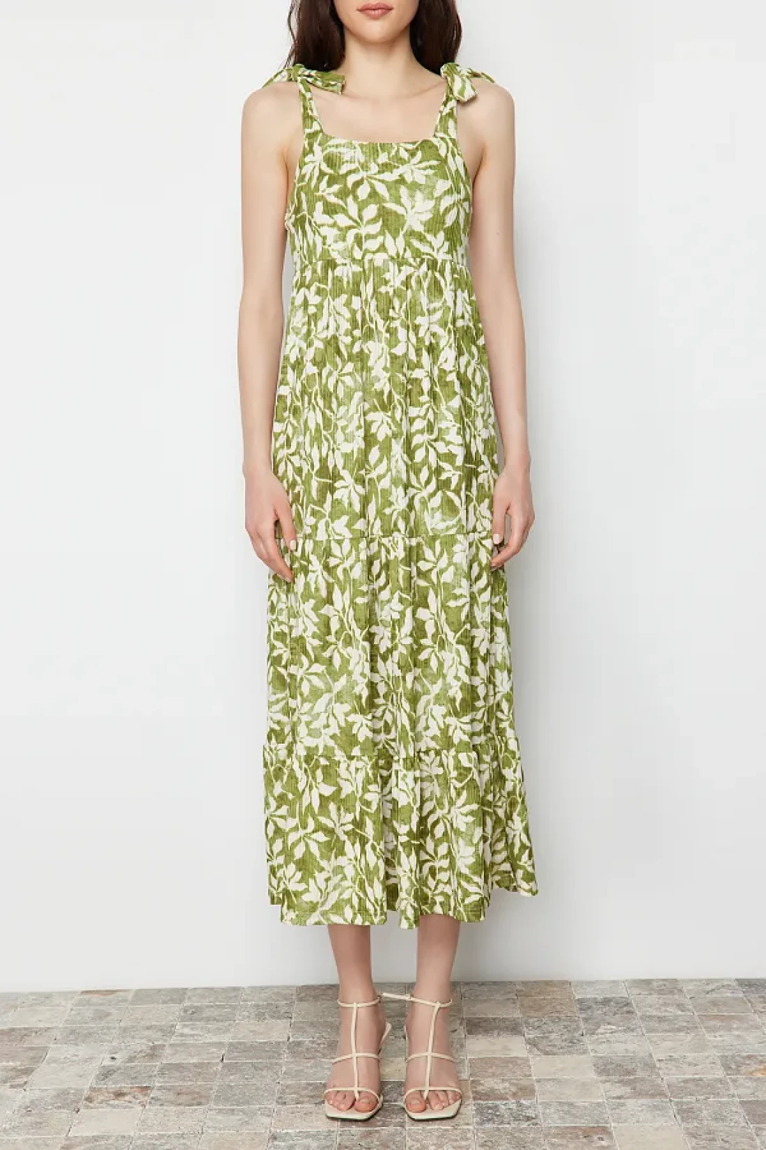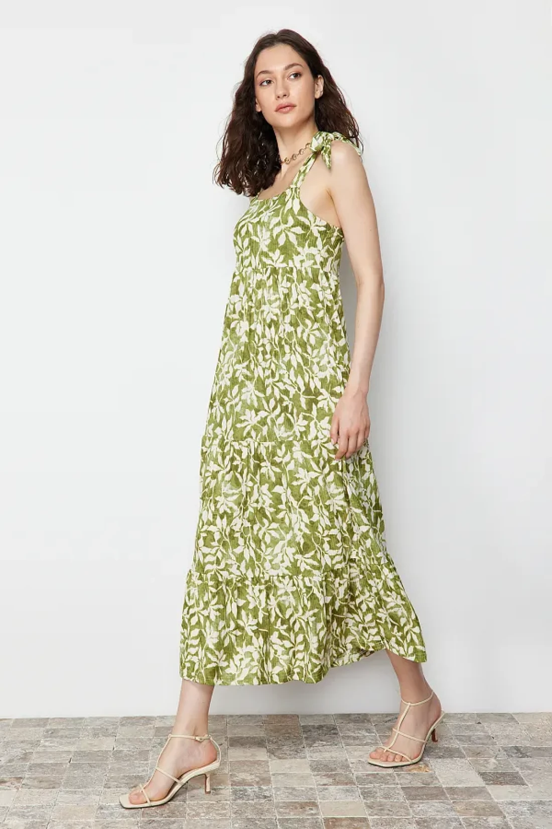 Collection فستان ماكسي محبوك باللون الأخضر مع تنورة بحمالات مكشكشة TWOSS23EL02328