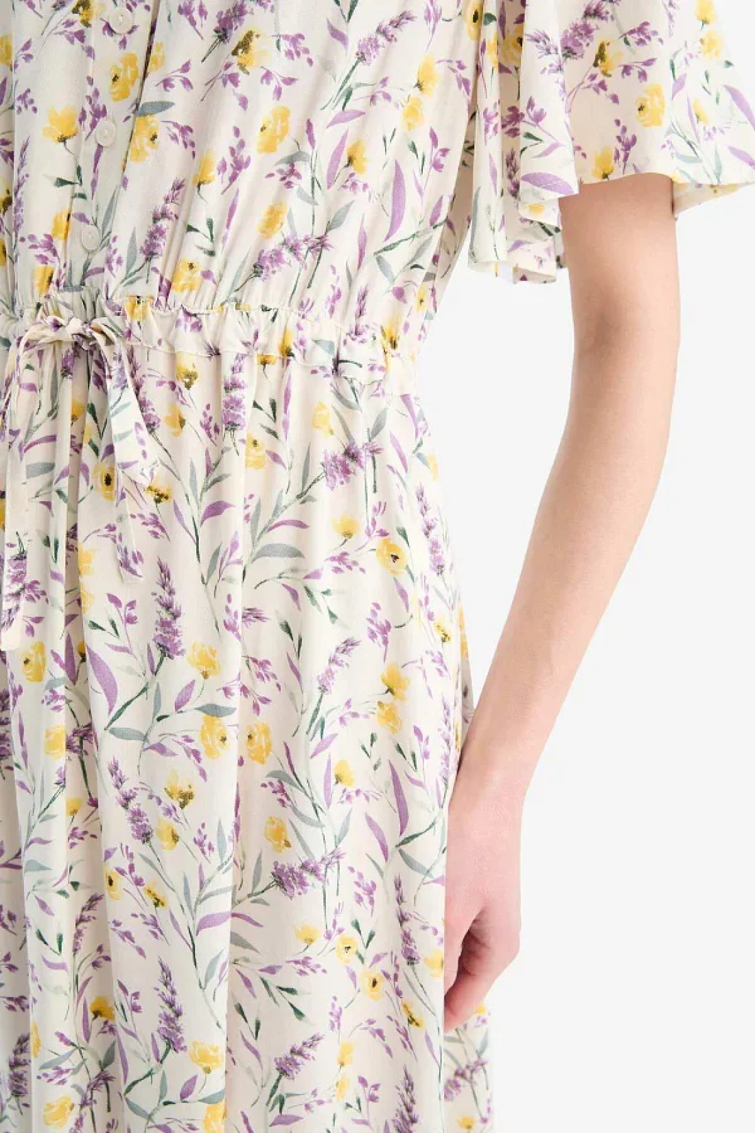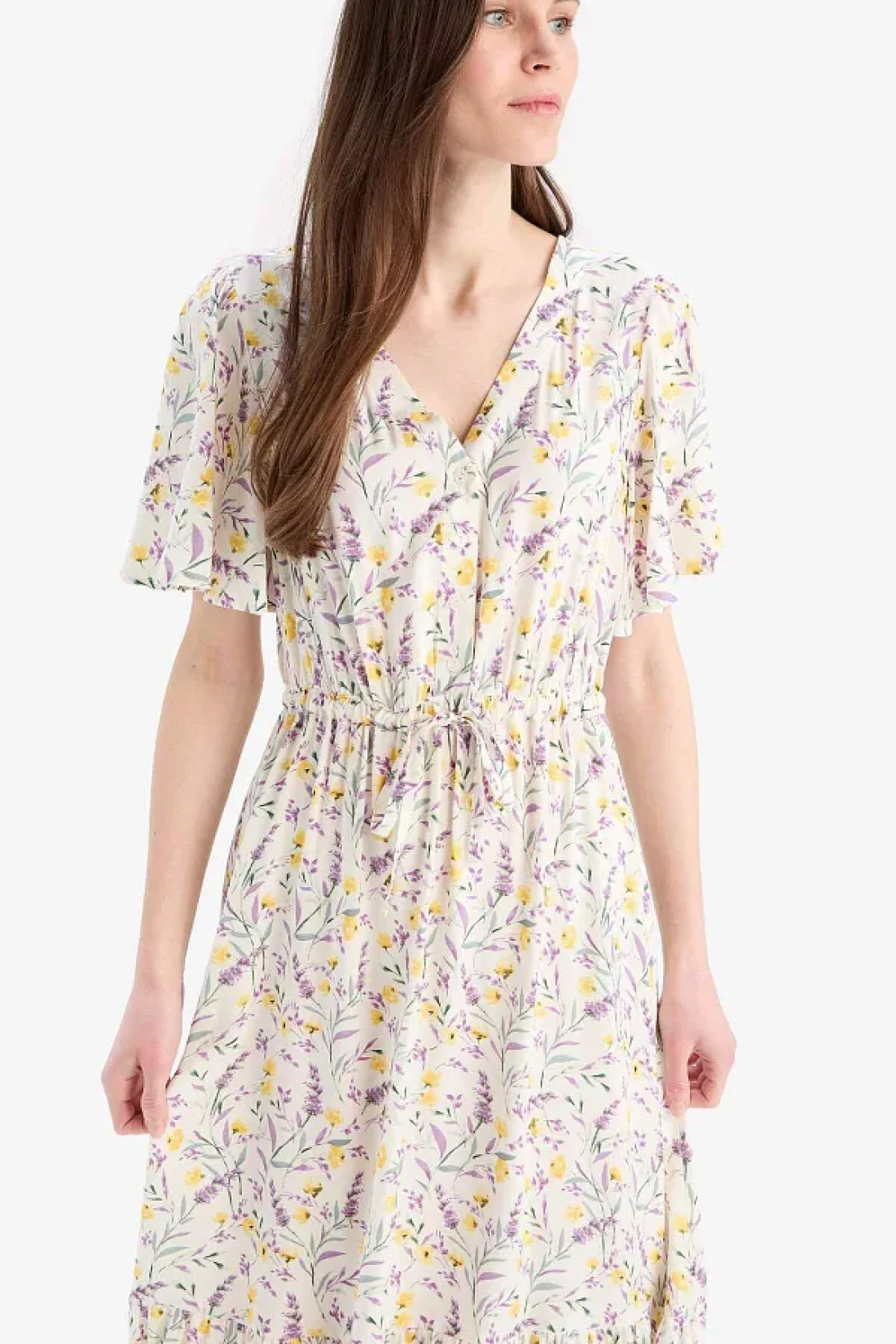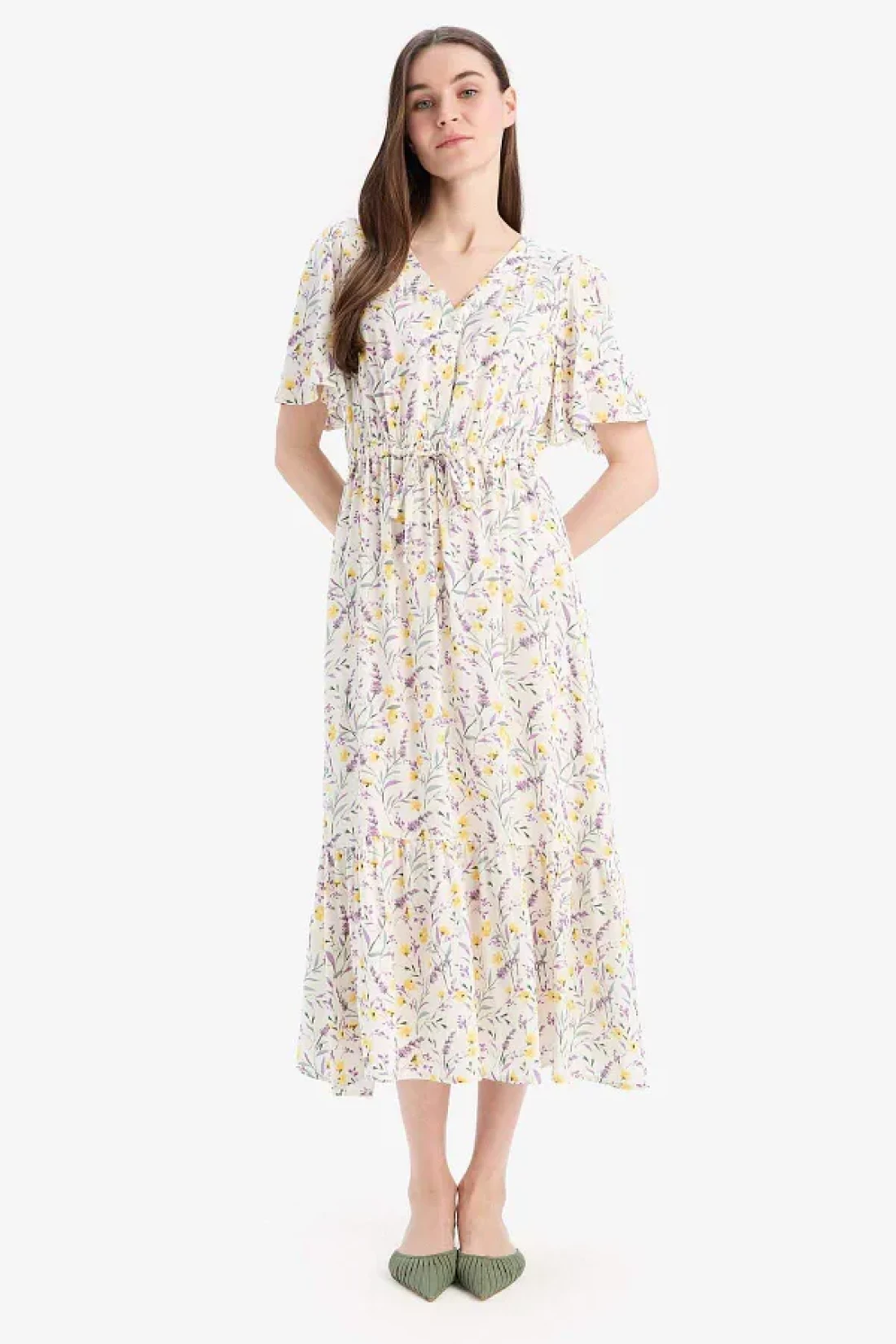 Defacto فستان صيفي متوسط الطول بأكمام قصيرة ورباط على شكل زهرة على شكل حرف V D2835ax25sm