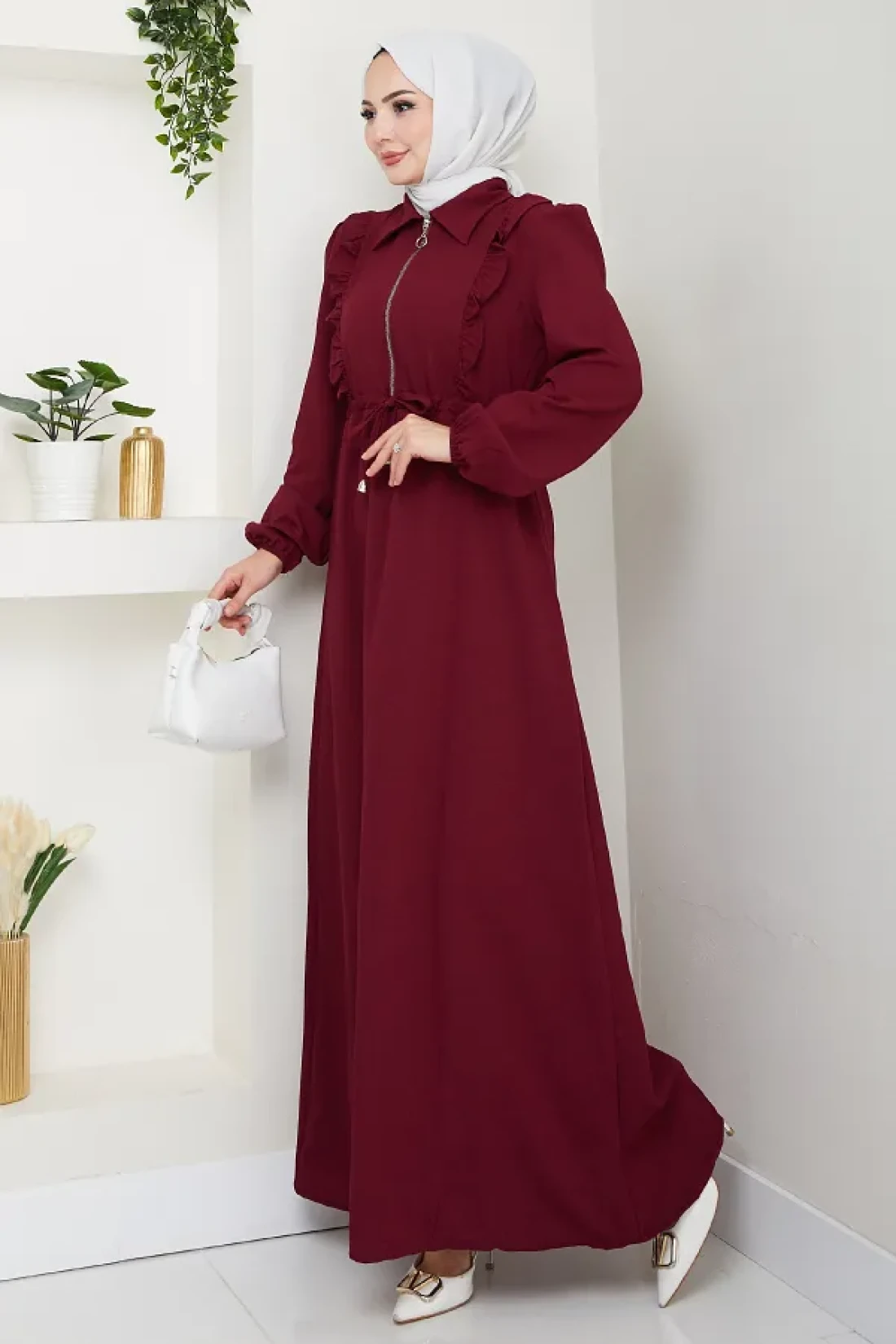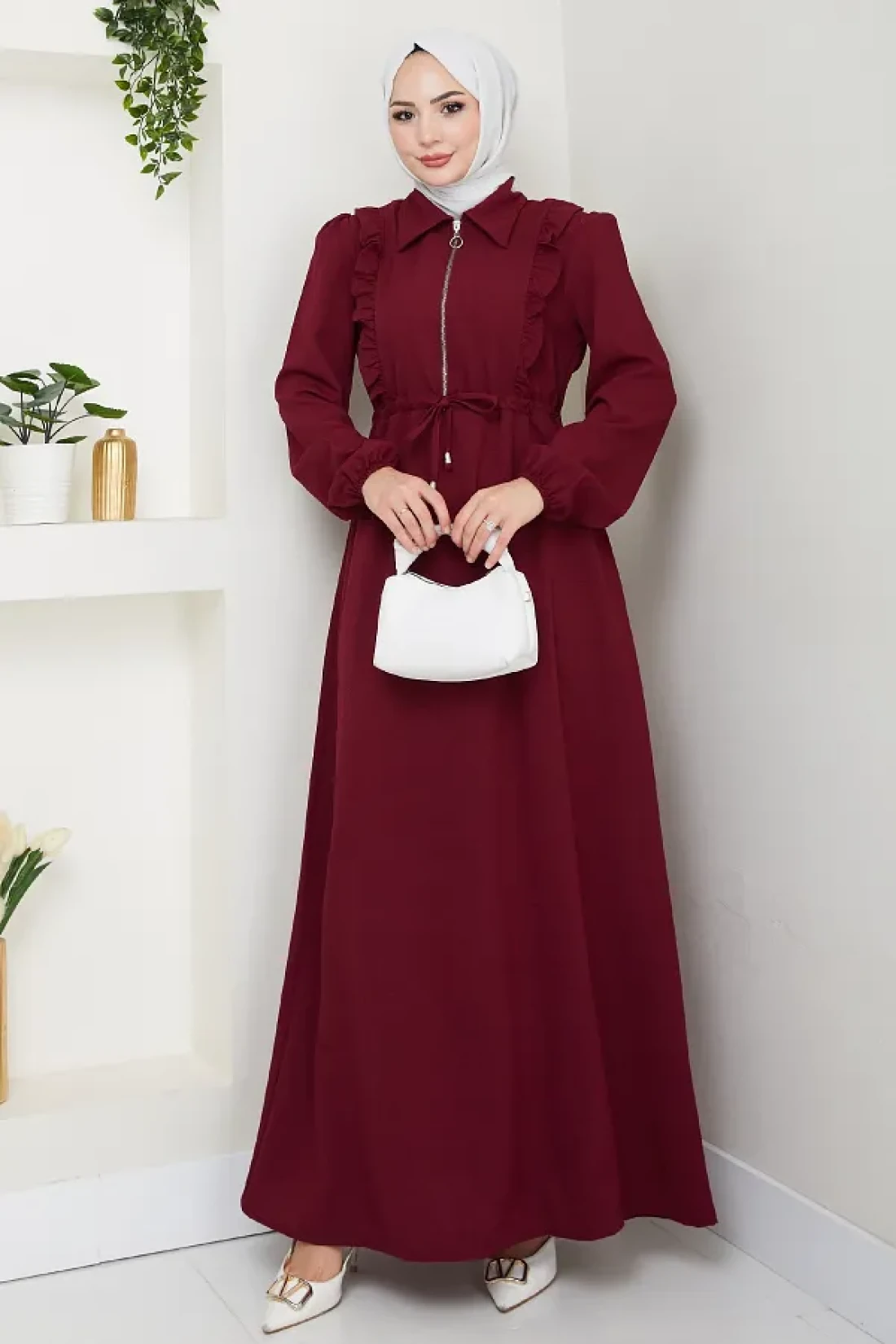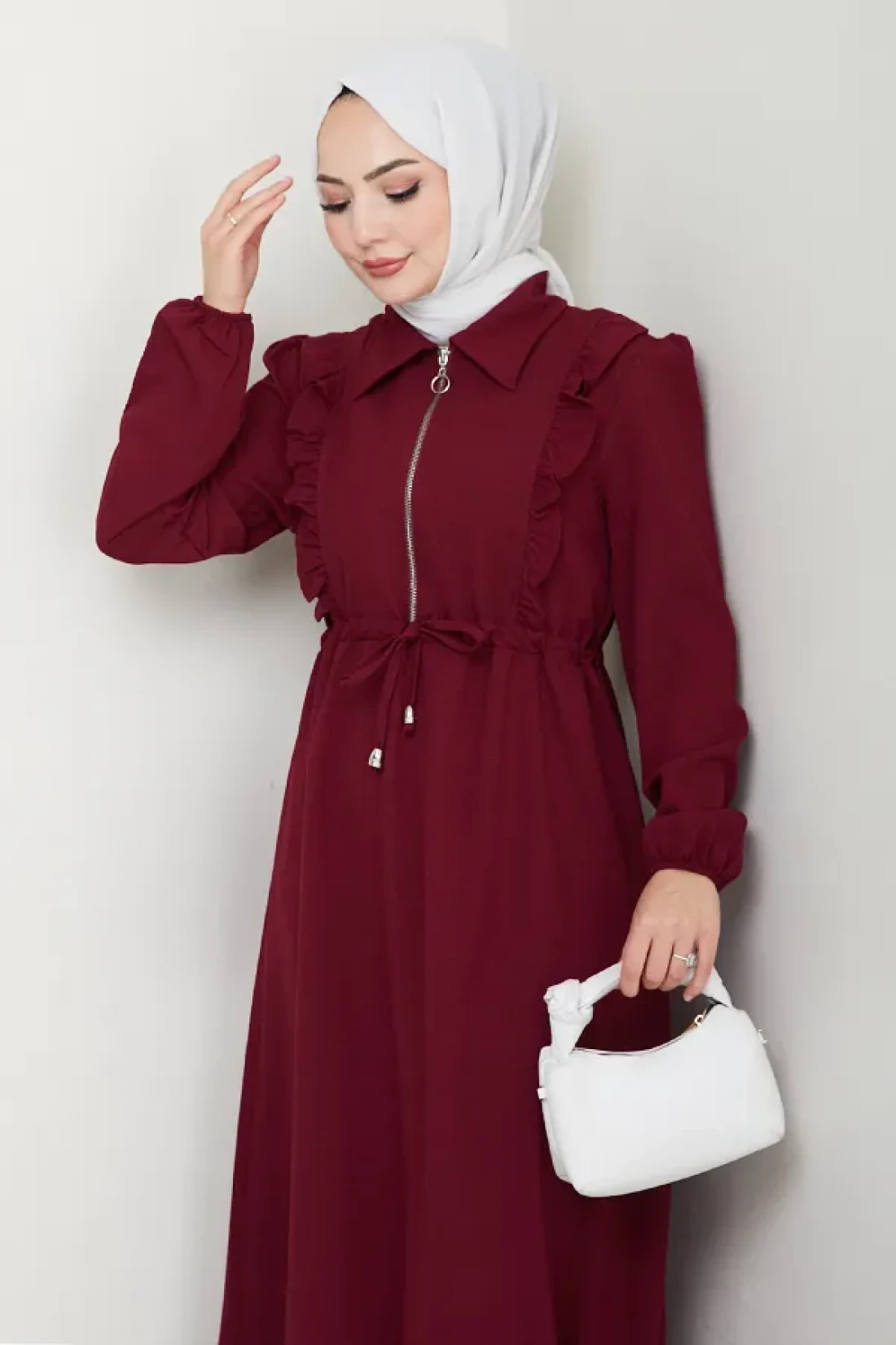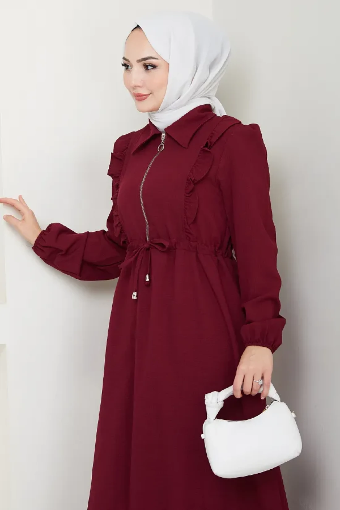 فستان مُزين بالكشكشة مع سحاب. نسيج المنتج: نسيج إلفيدا. ميزات المنتج: المنتج مصنوع من نسيج إلفيدا. الياقة الرئيسية مزودة بأزرار. إنه قالب كامل. لديه إغلاق بسحاب نصف فتحة. الطرف مرن.