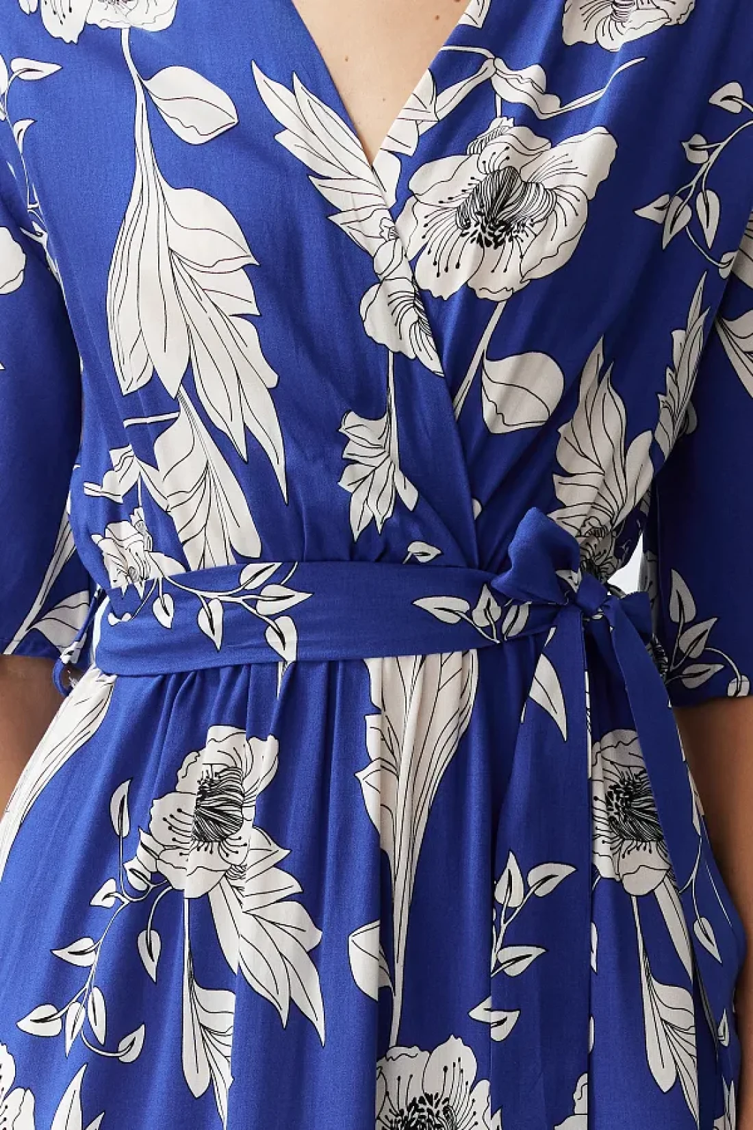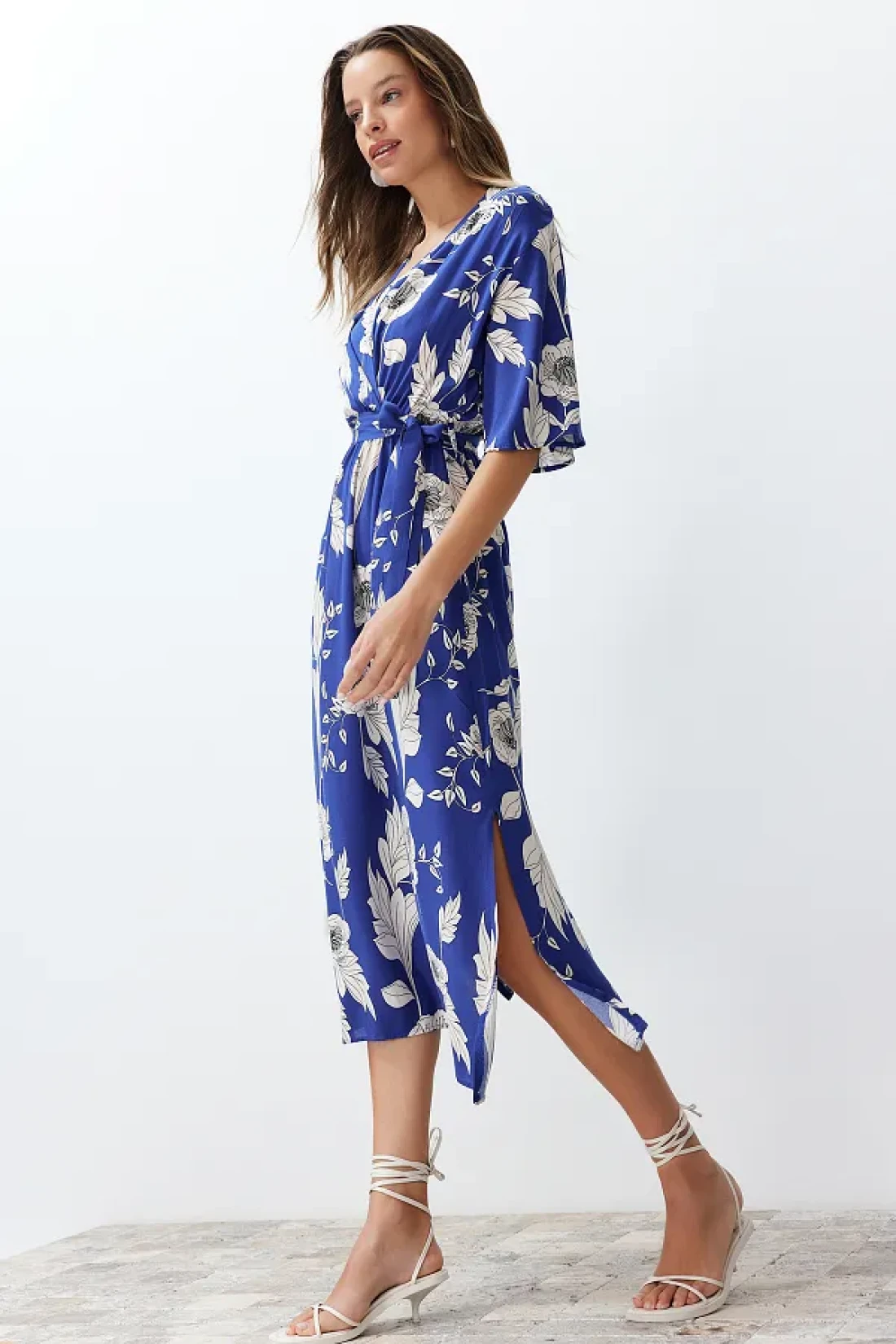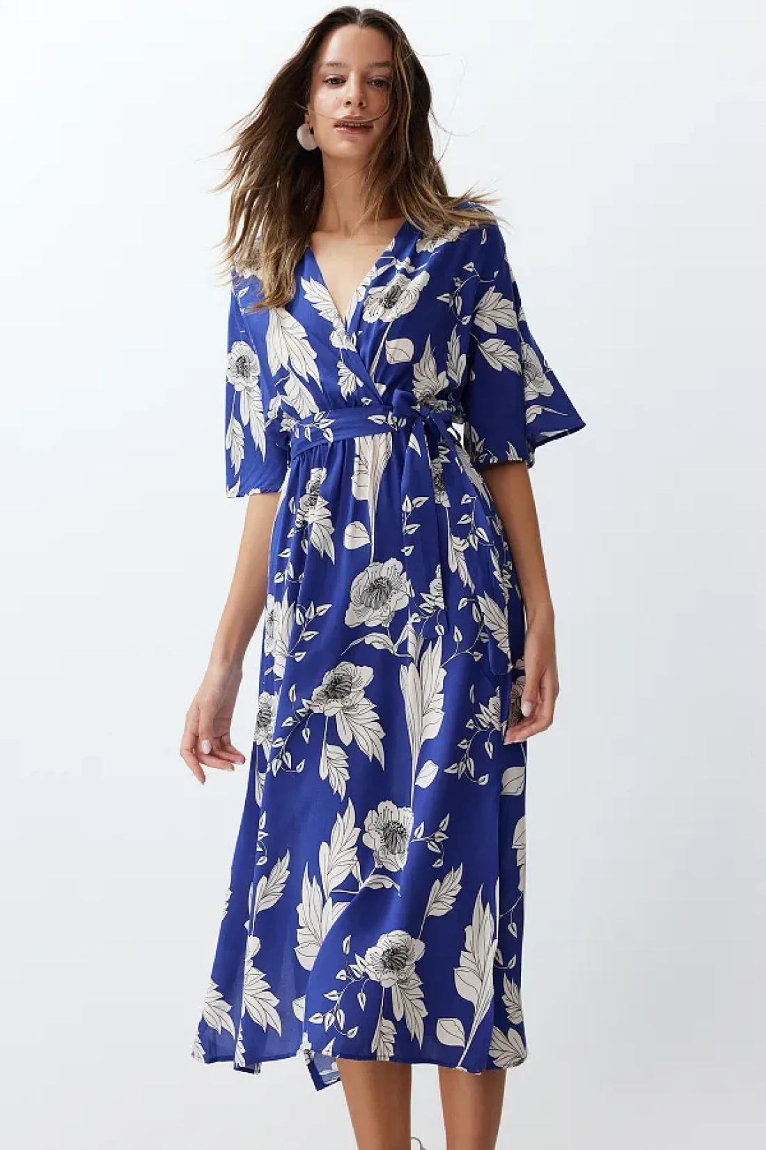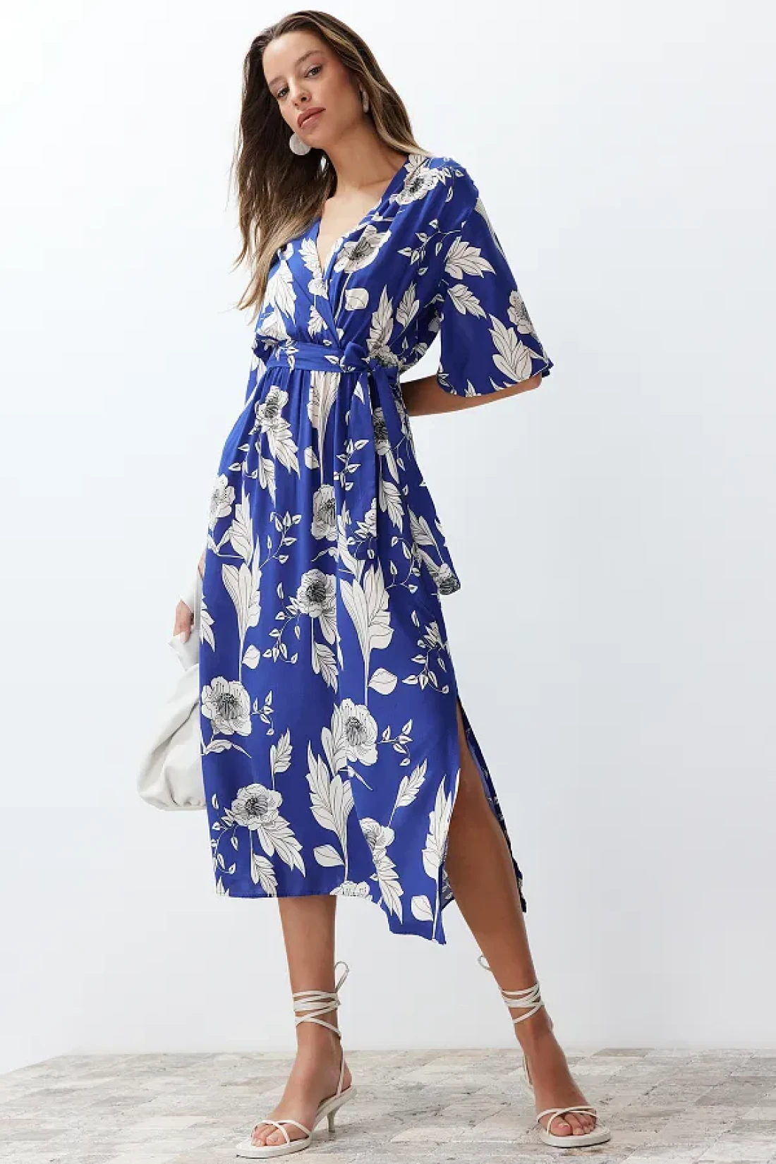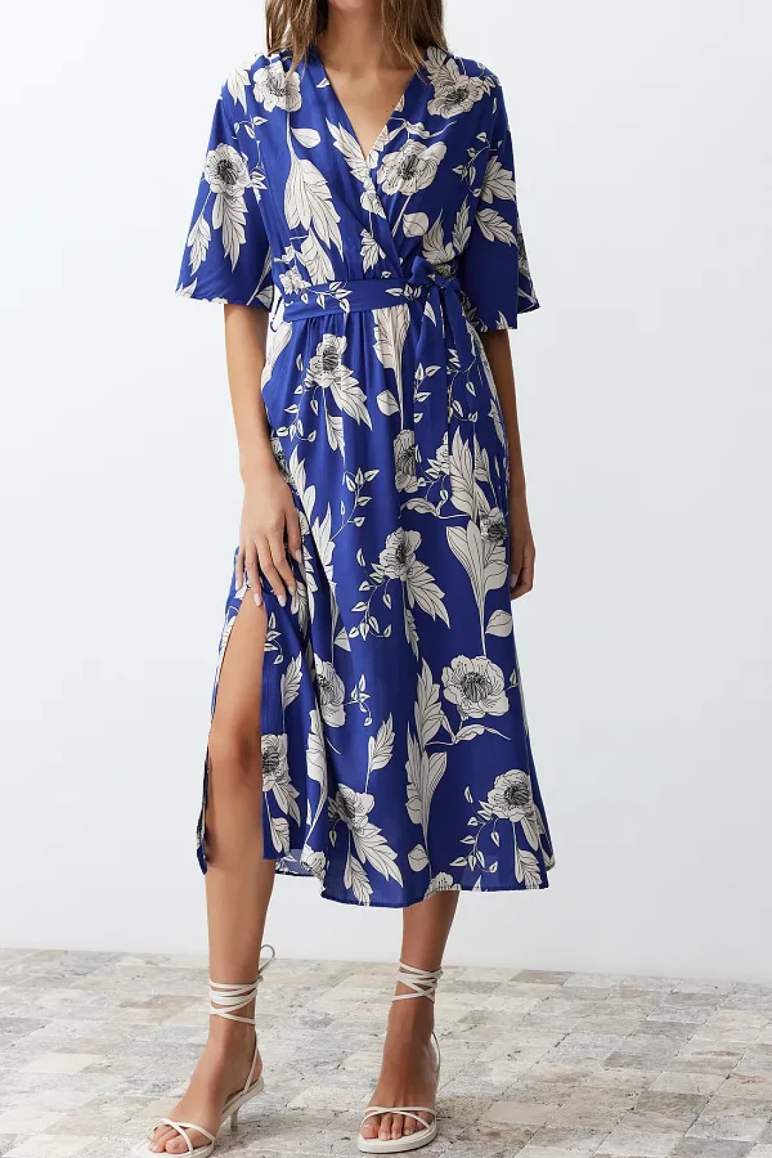 Collection فستان منسوج متوسط الطول بحزام أزرق وطبعة زهور على شكل حرف A ورقبة مزدوجة الصدر TWOSS24EL00915