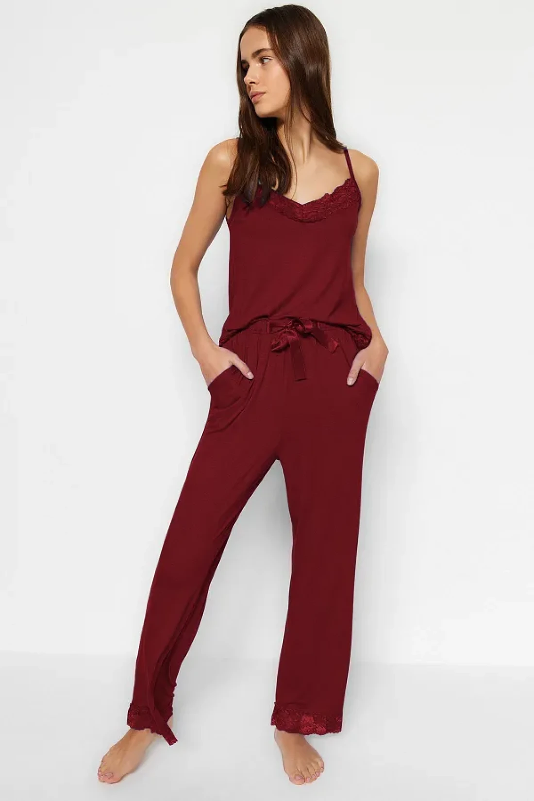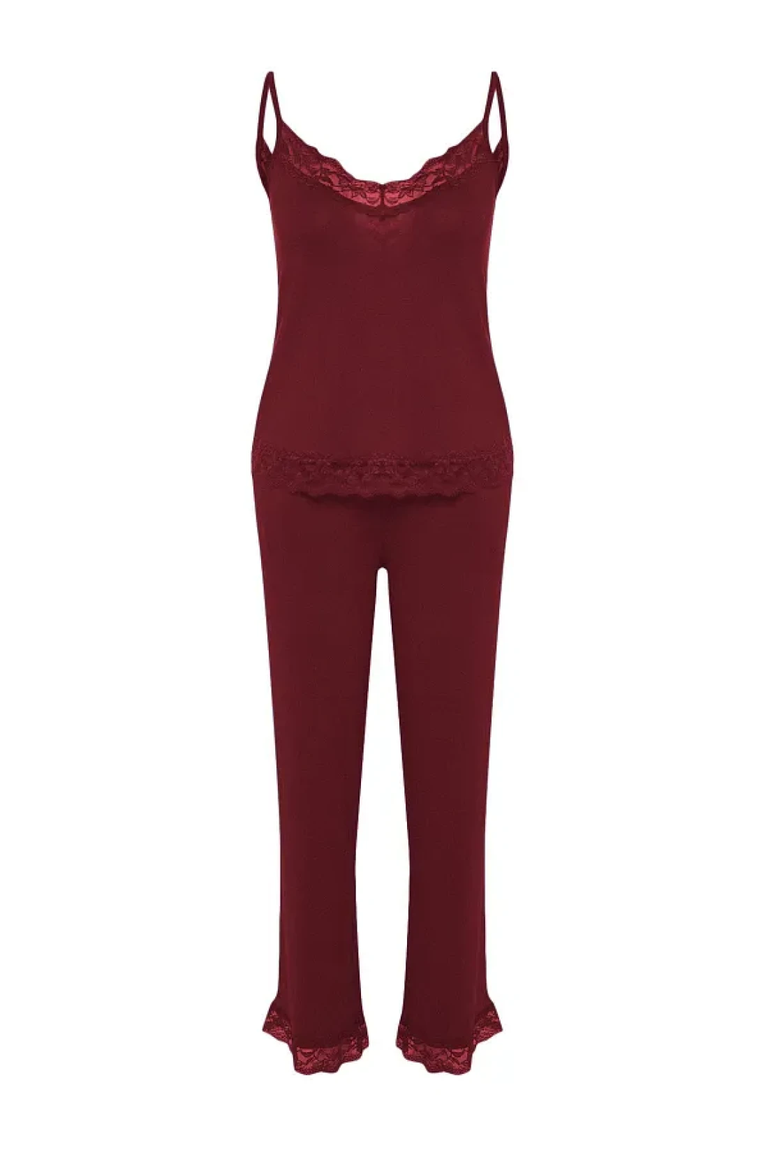 Collection طقم بيجامة محبوكة من الفيسكوز - دانتيل بورجوندي وتفاصيل شريطية، حزام حبل THMSS20PT0134