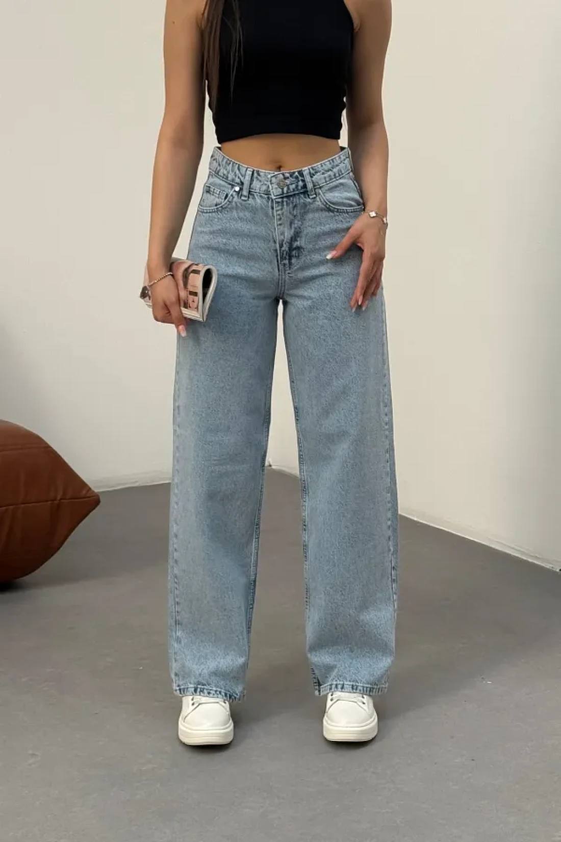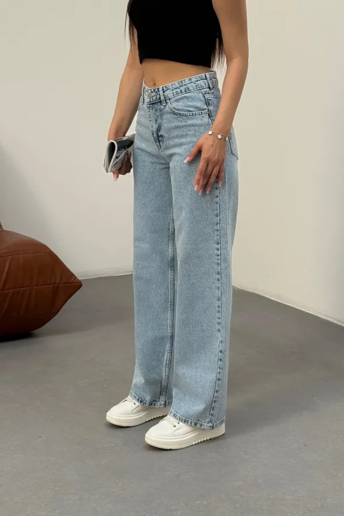 BİKELİFE بنطال جينز نسائي أزرق فاتح عالي الخصر من الليكرا قابل للتمدد وواسع الساق