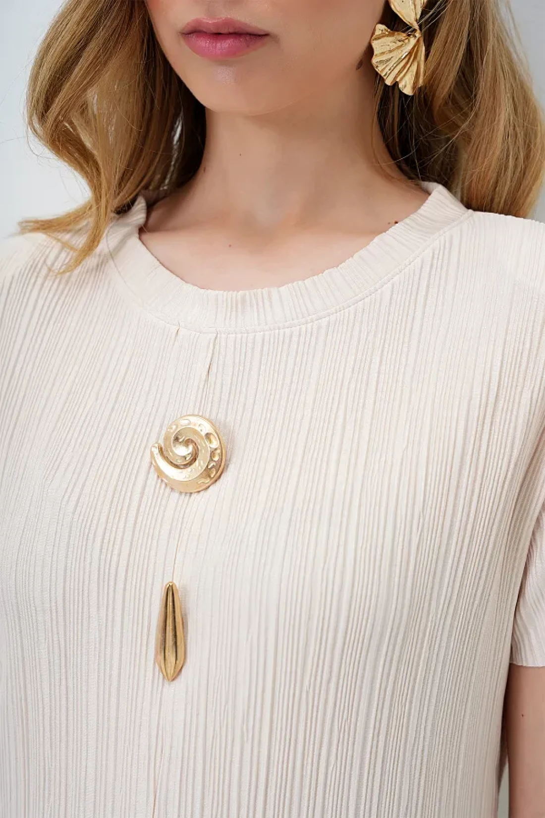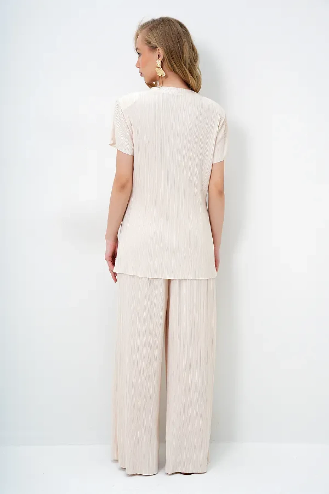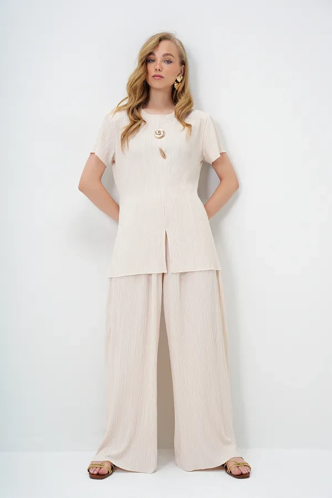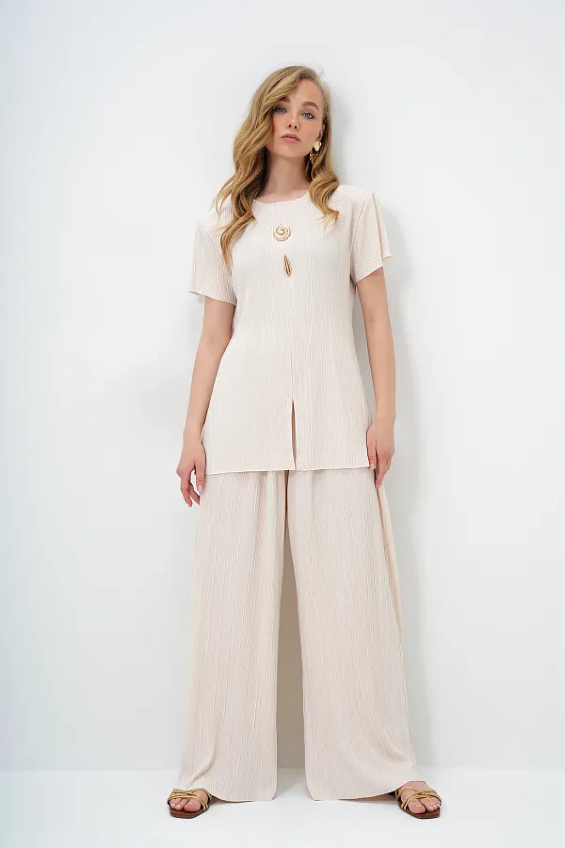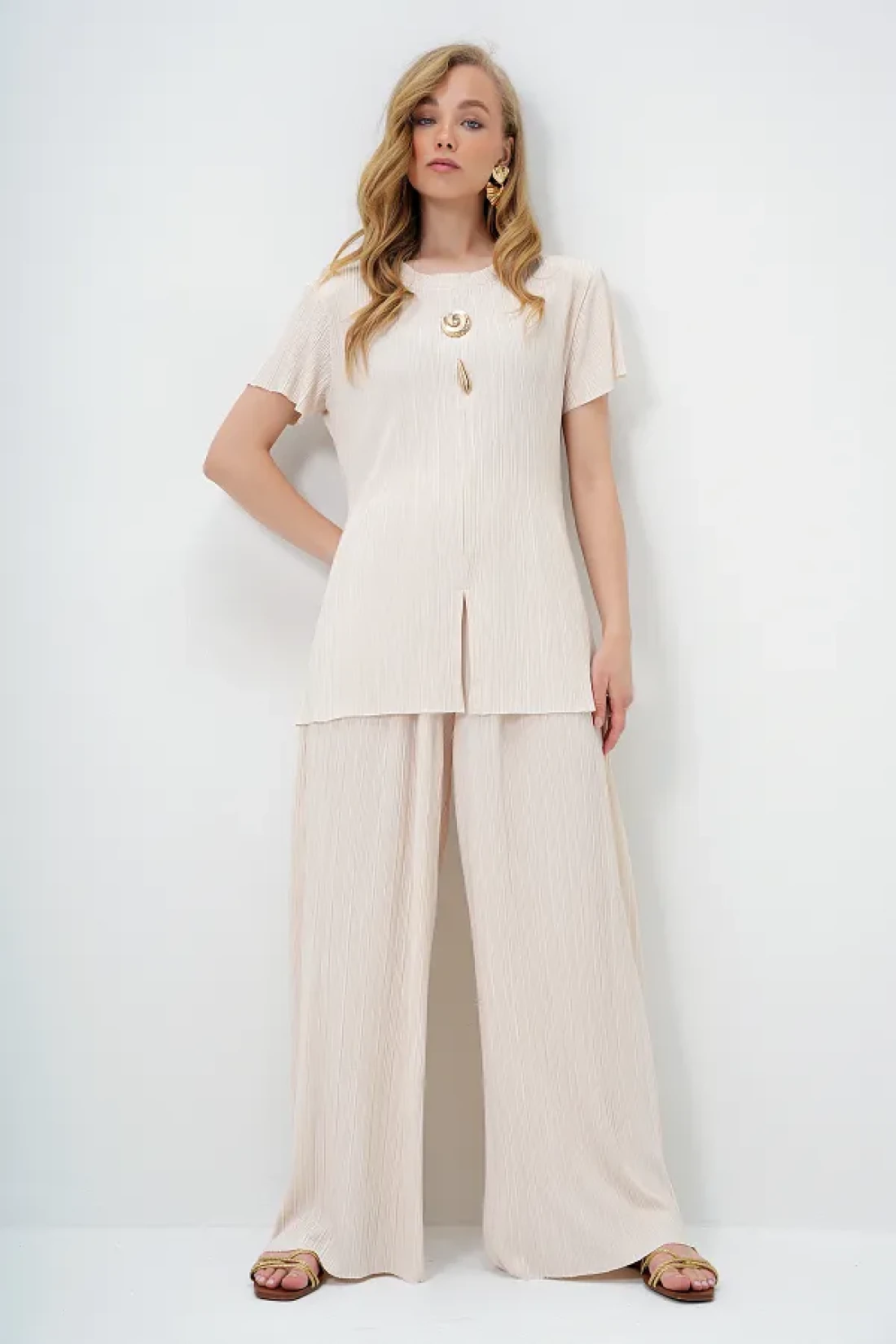 Trend Alaçatı Stili طقم بلوزة وبنطلون بياقة دائرية وفتحة مفصلة وأزرار ذهبية للنساء باللون البيج ALC-X14138