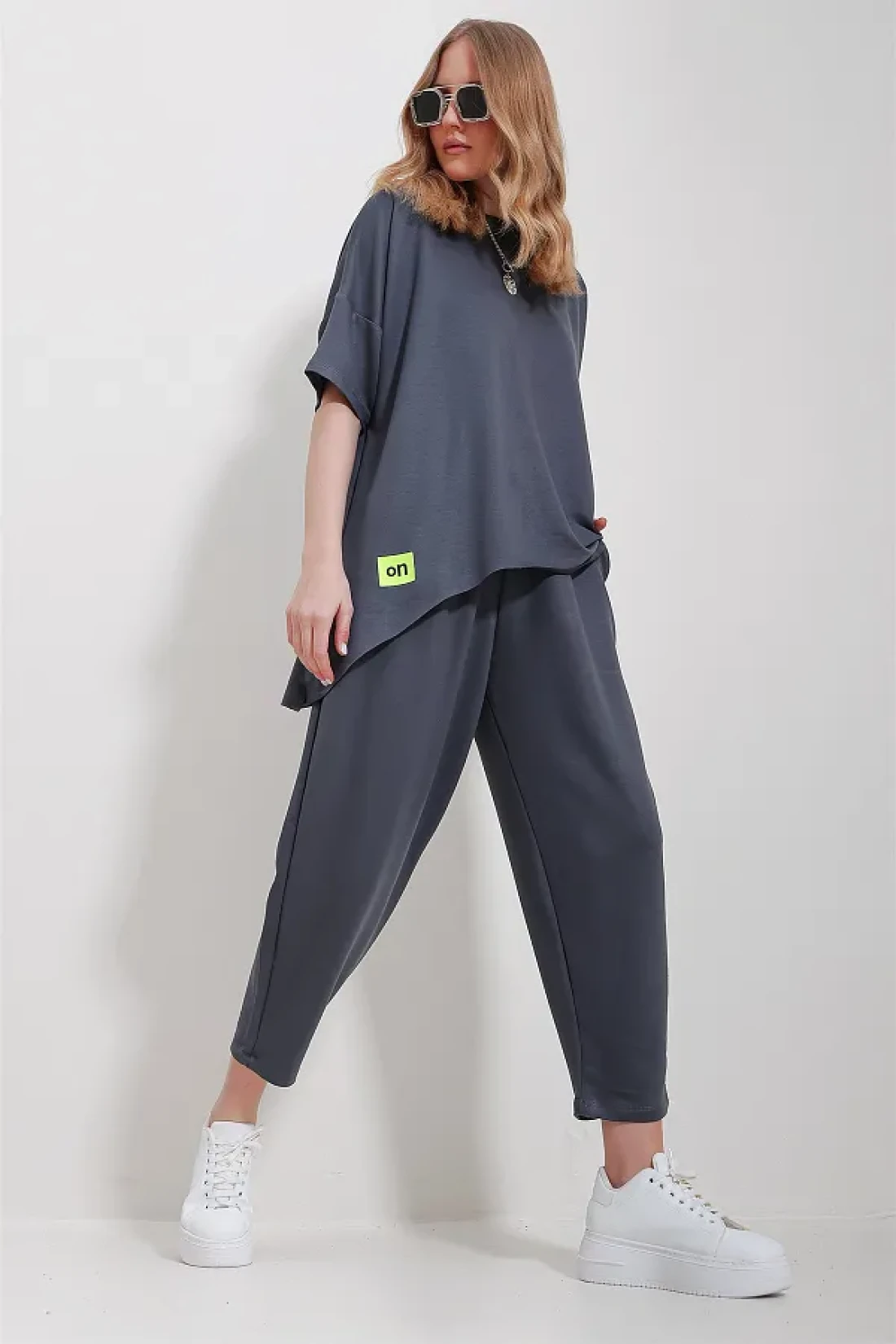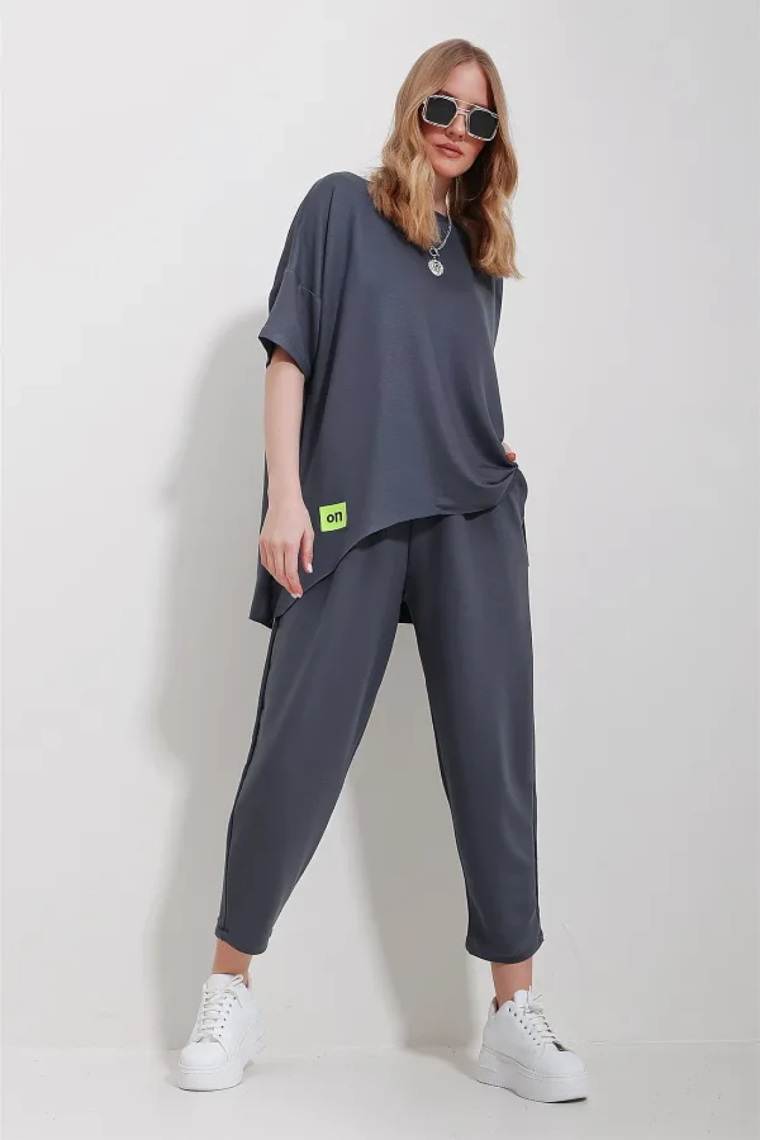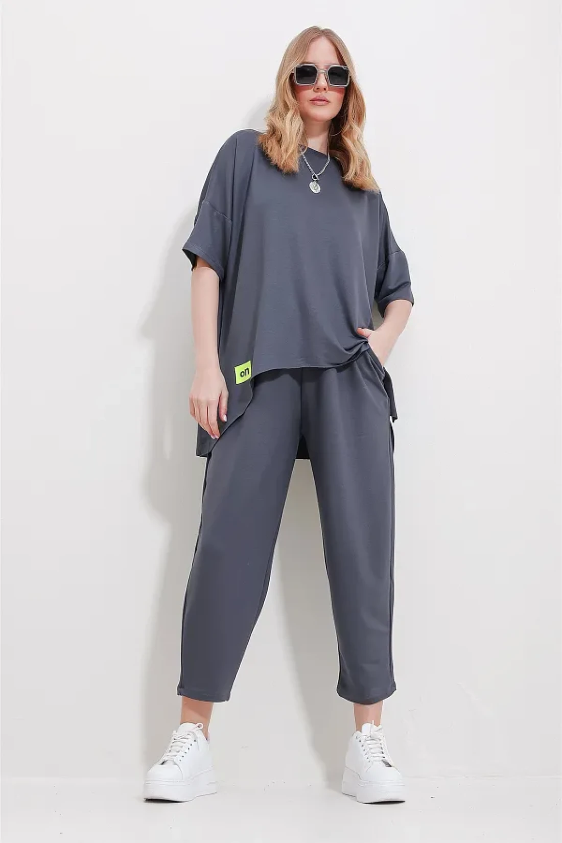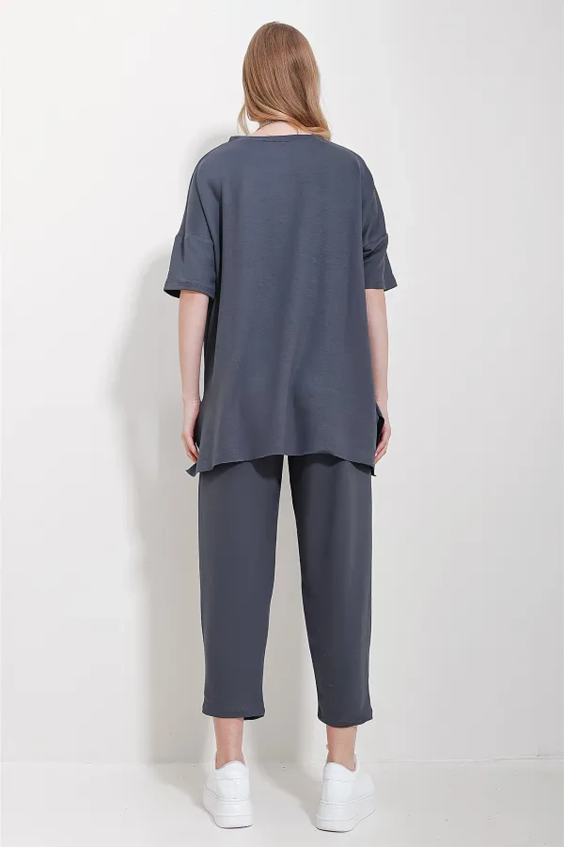 Trend Alaçatı Stili بدلة نسائية أنثراسايت برقبة دائرية غير متماثلة وبلوزة وسروال ALC-X11604